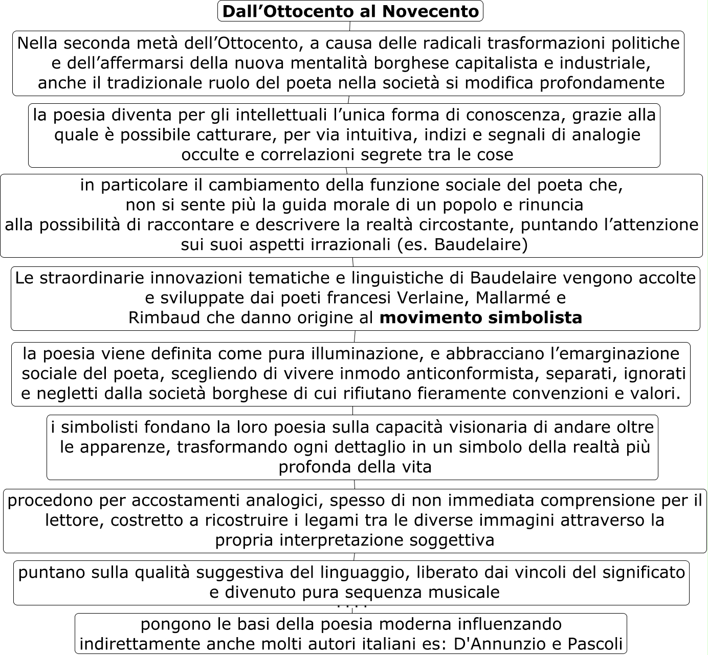 Questa Cmap, creata con IHMC CmapTools, contiene informazioni relative a: 126 simbolismo, la poesia viene definita come pura illuminazione, e abbracciano l’emarginazione sociale del poeta, scegliendo di vivere inmodo anticonformista, separati, ignorati e negletti dalla società borghese di cui rifiutano fieramente convenzioni e valori. ???? i simbolisti fondano la loro poesia sulla capacità visionaria di andare oltre le apparenze, trasformando ogni dettaglio in un simbolo della realtà più profonda della vita, Nella seconda metà dell’Ottocento, a causa delle radicali trasformazioni politiche e dell’affermarsi della nuova mentalità borghese capitalista e industriale, anche il tradizionale ruolo del poeta nella società si modifica profondamente ???? la poesia diventa per gli intellettuali l’unica forma di conoscenza, grazie alla quale è possibile catturare, per via intuitiva, indizi e segnali di analogie occulte e correlazioni segrete tra le cose, in particolare il cambiamento della funzione sociale del poeta che, non si sente più la guida morale di un popolo e rinuncia alla possibilità di raccontare e descrivere la realtà circostante, puntando l’attenzione sui suoi aspetti irrazionali (es. Baudelaire) ???? Le straordinarie innovazioni tematiche e linguistiche di Baudelaire vengono accolte e sviluppate dai poeti francesi Verlaine, Mallarmé e Rimbaud che danno origine al movimento simbolista, procedono per accostamenti analogici, spesso di non immediata comprensione per il lettore, costretto a ricostruire i legami tra le diverse immagini attraverso la propria interpretazione soggettiva ???? puntano sulla qualità suggestiva del linguaggio, liberato dai vincoli del significato e divenuto pura sequenza musicale, puntano sulla qualità suggestiva del linguaggio, liberato dai vincoli del significato e divenuto pura sequenza musicale ???? pongono le basi della poesia moderna influenzando indirettamente anche molti autori italiani es: D'Annunzio e Pascoli, la poesia diventa per gli intellettuali l’unica forma di conoscenza, grazie alla quale è possibile catturare, per via intuitiva, indizi e segnali di analogie occulte e correlazioni segrete tra le cose ???? in particolare il cambiamento della funzione sociale del poeta che, non si sente più la guida morale di un popolo e rinuncia alla possibilità di raccontare e descrivere la realtà circostante, puntando l’attenzione sui suoi aspetti irrazionali (es. Baudelaire), Dall’Ottocento al Novecento ???? Nella seconda metà dell’Ottocento, a causa delle radicali trasformazioni politiche e dell’affermarsi della nuova mentalità borghese capitalista e industriale, anche il tradizionale ruolo del poeta nella società si modifica profondamente, Le straordinarie innovazioni tematiche e linguistiche di Baudelaire vengono accolte e sviluppate dai poeti francesi Verlaine, Mallarmé e Rimbaud che danno origine al movimento simbolista ???? la poesia viene definita come pura illuminazione, e abbracciano l’emarginazione sociale del poeta, scegliendo di vivere inmodo anticonformista, separati, ignorati e negletti dalla società borghese di cui rifiutano fieramente convenzioni e valori., i simbolisti fondano la loro poesia sulla capacità visionaria di andare oltre le apparenze, trasformando ogni dettaglio in un simbolo della realtà più profonda della vita ???? procedono per accostamenti analogici, spesso di non immediata comprensione per il lettore, costretto a ricostruire i legami tra le diverse immagini attraverso la propria interpretazione soggettiva