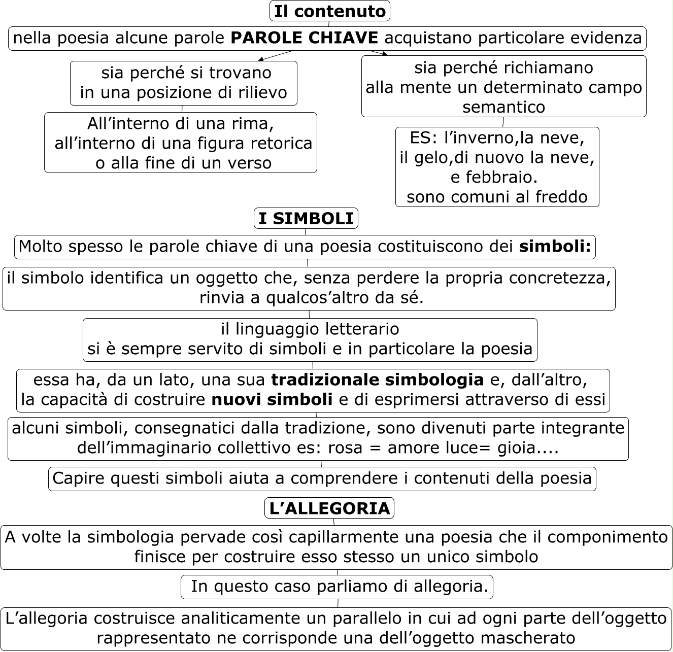 Questa Cmap, creata con IHMC CmapTools, contiene informazioni relative a: 66 contenuto, Molto spesso le parole chiave di una poesia costituiscono dei simboli: ???? il simbolo identifica un oggetto che, senza perdere la propria concretezza, rinvia a qualcos’altro da sé., L’ALLEGORIA ???? A volte la simbologia pervade così capillarmente una poesia che il componimento finisce per costruire esso stesso un unico simbolo, A volte la simbologia pervade così capillarmente una poesia che il componimento finisce per costruire esso stesso un unico simbolo ???? In questo caso parliamo di allegoria., nella poesia alcune parole PAROLE CHIAVE acquistano particolare evidenza ???? sia perché si trovano in una posizione di rilievo, nella poesia alcune parole PAROLE CHIAVE acquistano particolare evidenza ???? sia perché richiamano alla mente un determinato campo semantico, Il contenuto ???? nella poesia alcune parole PAROLE CHIAVE acquistano particolare evidenza, In questo caso parliamo di allegoria. ???? L’allegoria costruisce analiticamente un parallelo in cui ad ogni parte dell’oggetto rappresentato ne corrisponde una dell’oggetto mascherato, il simbolo identifica un oggetto che, senza perdere la propria concretezza, rinvia a qualcos’altro da sé. ???? il linguaggio letterario si è sempre servito di simboli e in particolare la poesia, I SIMBOLI ???? Molto spesso le parole chiave di una poesia costituiscono dei simboli:, sia perché si trovano in una posizione di rilievo ???? All’interno di una rima, all’interno di una figura retorica o alla fine di un verso, sia perché richiamano alla mente un determinato campo semantico ???? ES: l’inverno,la neve, il gelo,di nuovo la neve, e febbraio. sono comuni al freddo, alcuni simboli, consegnatici dalla tradizione, sono divenuti parte integrante dell’immaginario collettivo es: rosa = amore luce= gioia.... ???? Capire questi simboli aiuta a comprendere i contenuti della poesia, essa ha, da un lato, una sua tradizionale simbologia e, dall’altro, la capacità di costruire nuovi simboli e di esprimersi attraverso di essi ???? alcuni simboli, consegnatici dalla tradizione, sono divenuti parte integrante dell’immaginario collettivo es: rosa = amore luce= gioia...., il linguaggio letterario si è sempre servito di simboli e in particolare la poesia ???? essa ha, da un lato, una sua tradizionale simbologia e, dall’altro, la capacità di costruire nuovi simboli e di esprimersi attraverso di essi