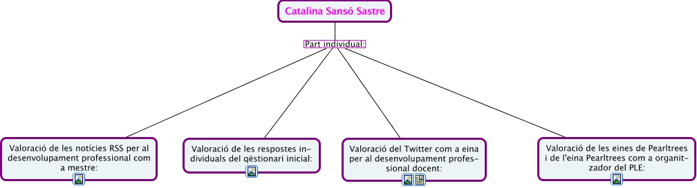 Este Cmap, tiene información relacionada con: Part Individual Cati Sansó, Catalina Sansó Sastre Part individual: Valoració de les notícies RSS per al desenvolupament professional com a mestre:, Catalina Sansó Sastre Part individual: Valoració de les respostes in- dividuals del qëstionari inicial:, Catalina Sansó Sastre Part individual: Valoració del Twitter com a eina per al desenvolupament profes- sional docent:, Catalina Sansó Sastre Part individual: Valoració de les eines de Pearltrees i de l'eina Pearltrees com a organit- zador del PLE: