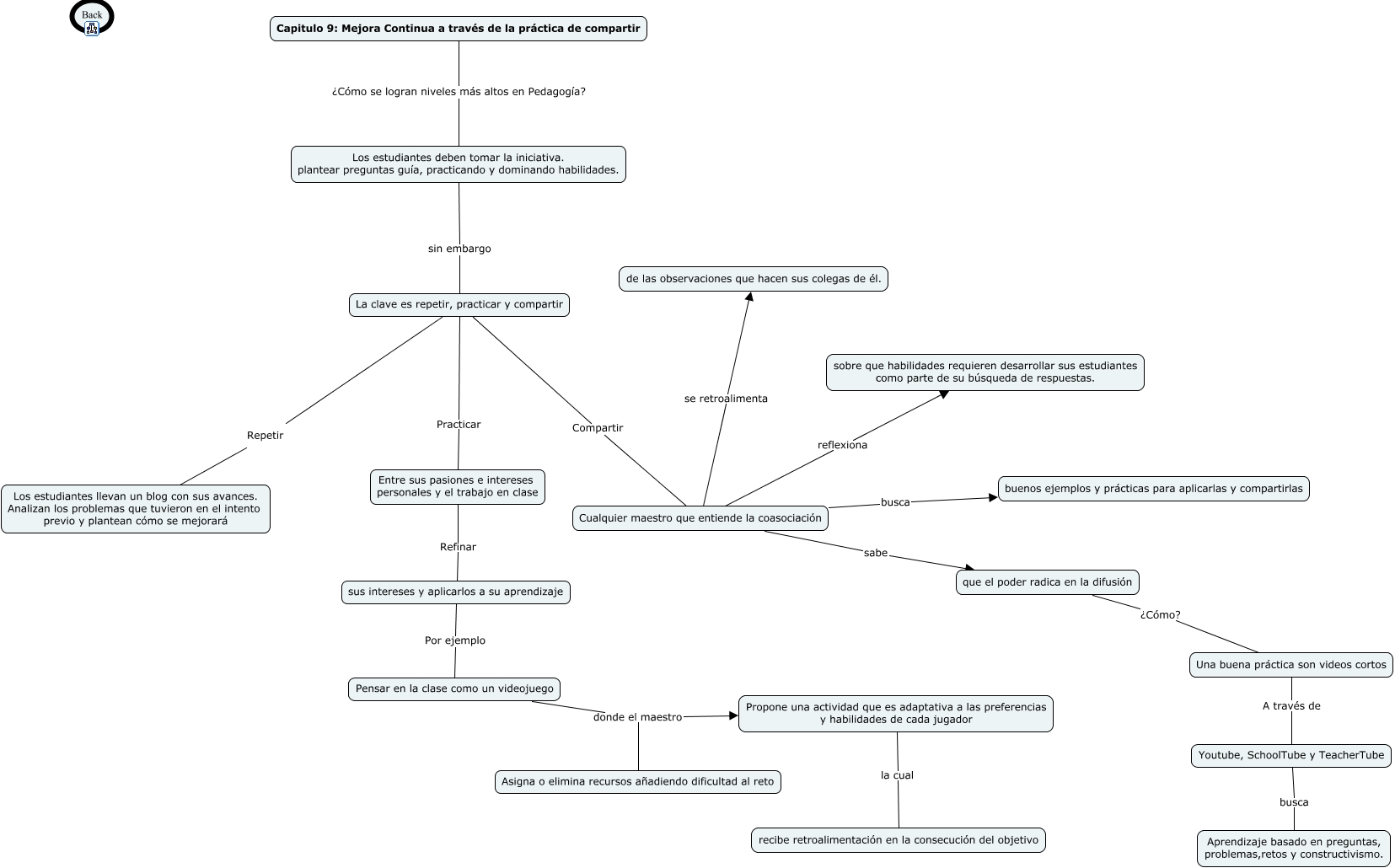 Este Cmap, tiene información relacionada con: Capítulo 9, Entre sus pasiones e intereses personales y el trabajo en clase Refinar sus intereses y aplicarlos a su aprendizaje, Pensar en la clase como un videojuego donde el maestro Propone una actividad que es adaptativa a las preferencias y habilidades de cada jugador, Capitulo 9: Mejora Continua a través de la práctica de compartir ¿Cómo se logran niveles más altos en Pedagogía? Los estudiantes deben tomar la iniciativa. plantear preguntas guía, practicando y dominando habilidades., Propone una actividad que es adaptativa a las preferencias y habilidades de cada jugador la cual recibe retroalimentación en la consecución del objetivo, Cualquier maestro que entiende la coasociación reflexiona sobre que habilidades requieren desarrollar sus estudiantes como parte de su búsqueda de respuestas., Youtube, SchoolTube y TeacherTube busca Aprendizaje basado en preguntas, problemas,retos y constructivismo., sus intereses y aplicarlos a su aprendizaje Por ejemplo Pensar en la clase como un videojuego, Cualquier maestro que entiende la coasociación sabe que el poder radica en la difusión, La clave es repetir, practicar y compartir Compartir Cualquier maestro que entiende la coasociación, La clave es repetir, practicar y compartir Repetir Los estudiantes llevan un blog con sus avances. Analizan los problemas que tuvieron en el intento previo y plantean cómo se mejorará, Pensar en la clase como un videojuego donde el maestro Asigna o elimina recursos añadiendo dificultad al reto, Cualquier maestro que entiende la coasociación busca buenos ejemplos y prácticas para aplicarlas y compartirlas, Cualquier maestro que entiende la coasociación se retroalimenta de las observaciones que hacen sus colegas de él., La clave es repetir, practicar y compartir Practicar Entre sus pasiones e intereses personales y el trabajo en clase, que el poder radica en la difusión ¿Cómo? Una buena práctica son videos cortos, Una buena práctica son videos cortos A través de Youtube, SchoolTube y TeacherTube, Los estudiantes deben tomar la iniciativa. plantear preguntas guía, practicando y dominando habilidades. sin embargo La clave es repetir, practicar y compartir