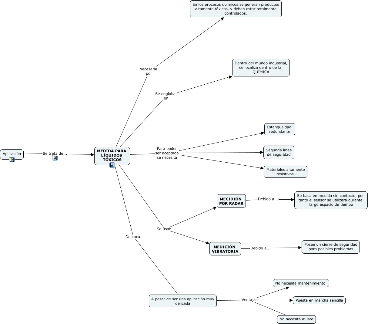 Este Cmap, tiene información relacionada con: Ap. Desarrollada, MEDIDA PARA LÍQUIDOS TÓXICOS Para poder ser aceptada se necesita Segunda línea de seguridad, A pesar de ser una aplicación muy delicada Ventajas No necesita ajuste, MEDIDA PARA LÍQUIDOS TÓXICOS Se usan MECIDIÓN POR RADAR, A pesar de ser una aplicación muy delicada Ventajas Puesta en marcha sencilla, MEDIDA PARA LÍQUIDOS TÓXICOS Para poder ser aceptada se necesita Materiales altamente resistivos, MEDIDA PARA LÍQUIDOS TÓXICOS Necesaria por En los procesos químicos se generan productos altamente tóxicos, y deben estar totalmente controlados., A pesar de ser una aplicación muy delicada Ventajas No necesita mantenimiento, MEDIDA PARA LÍQUIDOS TÓXICOS Se usan MEDICIÓN VIBRATORIA, MECIDIÓN POR RADAR Debido a... Se basa en medida sin contacto, por tanto el sensor se utilizara durante largo espacio de tiempo, MEDIDA PARA LÍQUIDOS TÓXICOS Se engloba en Dentro del mundo industrial, se localiza dentro de la QUÍMICA, MEDIDA PARA LÍQUIDOS TÓXICOS Para poder ser aceptada se necesita Estanqueidad redundante, MEDIDA PARA LÍQUIDOS TÓXICOS Destaca A pesar de ser una aplicación muy delicada, Aplicación Se trata de... MEDIDA PARA LÍQUIDOS TÓXICOS, MEDICIÓN VIBRATORIA Debido a... Posee un cierre de seguridad para posibles problemas