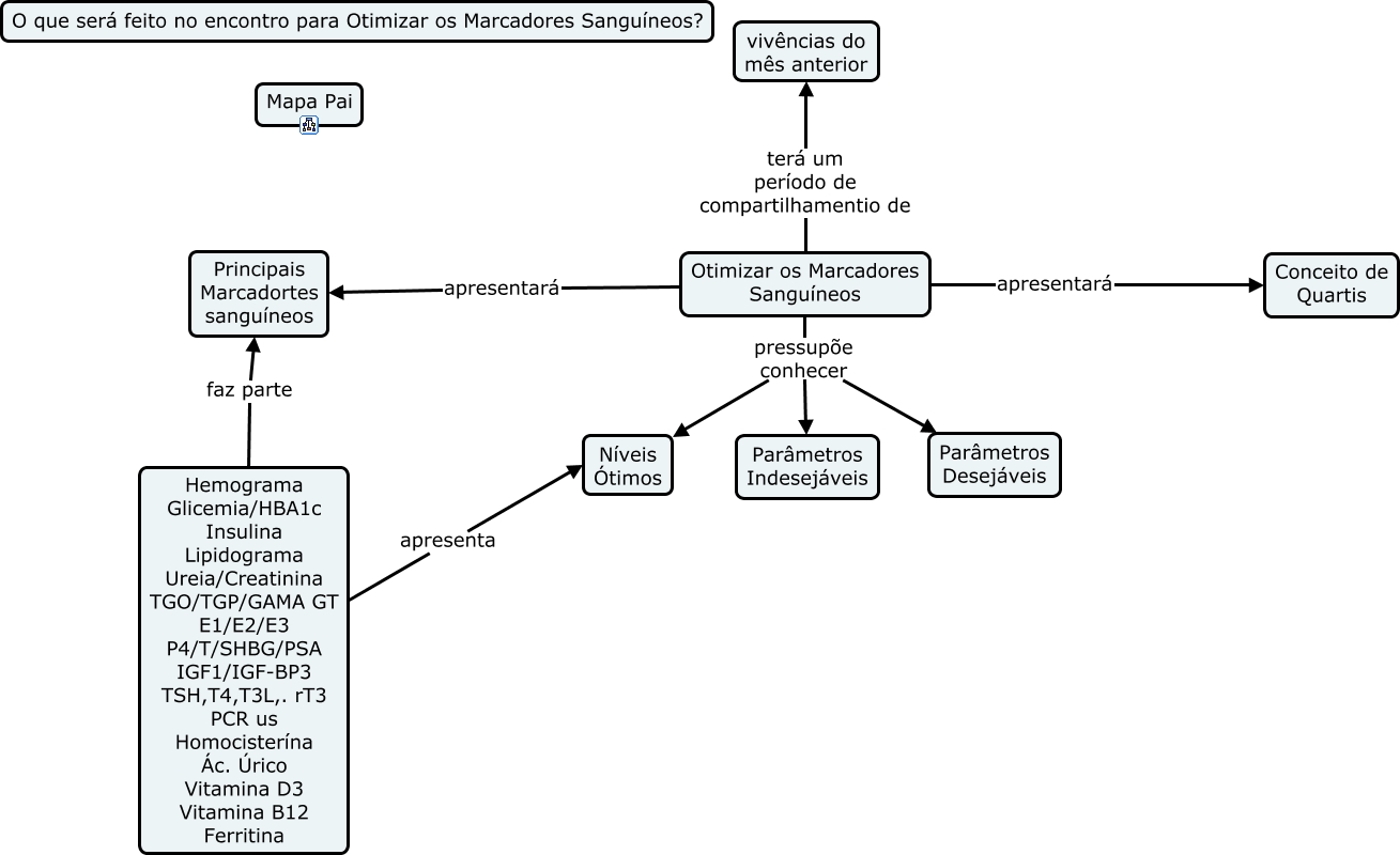 This Concept Map, created with IHMC CmapTools, has information related to: Otimizar os Marcadores Sanguíneos, Hemograma Glicemia/HBA1c Insulina Lipidograma Ureia/Creatinina TGO/TGP/GAMA GT E1/E2/E3 P4/T/SHBG/PSA IGF1/IGF-BP3 TSH,T4,T3L,. rT3 PCR us Homocisterína Ác. Úrico Vitamina D3 Vitamina B12 Ferritina faz parte Principais Marcadortes sanguíneos, Otimizar os Marcadores Sanguíneos apresentará Principais Marcadortes sanguíneos, Otimizar os Marcadores Sanguíneos pressupõe conhecer Parâmetros Desejáveis, Otimizar os Marcadores Sanguíneos apresentará Conceito de Quartis, Hemograma Glicemia/HBA1c Insulina Lipidograma Ureia/Creatinina TGO/TGP/GAMA GT E1/E2/E3 P4/T/SHBG/PSA IGF1/IGF-BP3 TSH,T4,T3L,. rT3 PCR us Homocisterína Ác. Úrico Vitamina D3 Vitamina B12 Ferritina apresenta Níveis Ótimos, Otimizar os Marcadores Sanguíneos pressupõe conhecer Parâmetros Indesejáveis, Otimizar os Marcadores Sanguíneos terá um período de compartilhamentio de vivências do mês anterior, Otimizar os Marcadores Sanguíneos pressupõe conhecer Níveis Ótimos