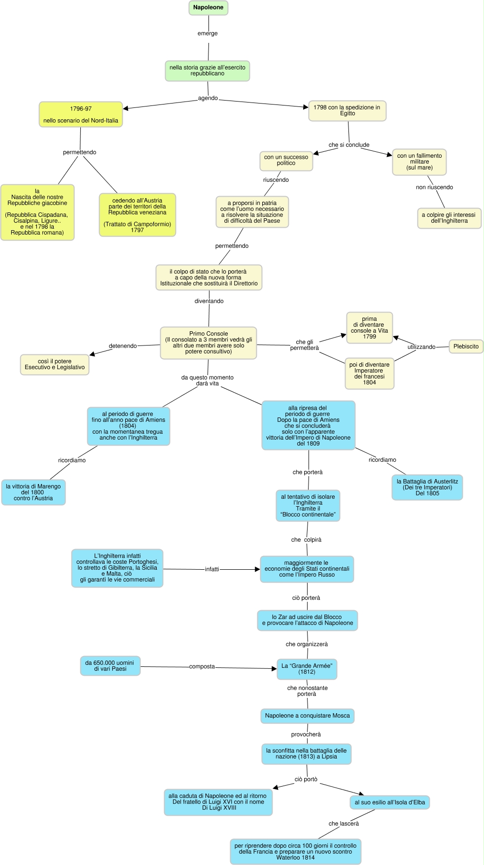 This Concept Map, created with IHMC CmapTools, has information related to: Napoleone, L’Inghilterra infatti controllava le coste Portoghesi, lo stretto di Gibilterra, la Sicilia e Malta, ciò gli garantì le vie commerciali infatti maggiormente le economie degli Stati continentali come l’Impero Russo, al tentativo di isolare l’Inghilterra Tramite il “Blocco continentale” che colpirà maggiormente le economie degli Stati continentali come l’Impero Russo, Primo Console (Il consolato a 3 membri vedrà gli altri due membri avere solo potere consultivo) da questo momento darà vita al periodo di guerre fino all’anno pace di Amiens (1804) con la momentanea tregua anche con l’Inghilterra, 1798 con la spedizione in Egitto che si conclude con un successo politico, La “Grande Armée” (1812) che nonostante porterà Napoleone a conquistare Mosca, alla ripresa del periodo di guerre Dopo la pace di Amiens che si concluderà solo con l’apparente vittoria dell’Impero di Napoleone del 1809 ricordiamo la Battaglia di Austerlitz (Dei tre Imperatori) Del 1805, da 650.000 uomini di vari Paesi composta La “Grande Armée” (1812), al suo esilio all’Isola d’Elba che lascerà per riprendere dopo circa 100 giorni il controllo della Francia e preparare un nuovo scontro Waterloo 1814, 1796-97 nello scenario del Nord-Italia permettendo cedendo all’Austria parte dei territori della Repubblica veneziana (Trattato di Campoformio) 1797, 1796-97 nello scenario del Nord-Italia permettendo la Nascita delle nostre Repubbliche giacobine (Repubblica Cispadana, Cisalpina, Ligure.. e nel 1798 la Repubblica romana), con un successo politico riuscendo a proporsi in patria come l’uomo necessario a risolvere la situazione di difficoltà del Paese, lo Zar ad uscire dal Blocco e provocare l’attacco di Napoleone che organizzerà La “Grande Armée” (1812), a proporsi in patria come l’uomo necessario a risolvere la situazione di difficoltà del Paese permettendo il colpo di stato che lo porterà a capo della nuova forma Istituzionale che sostituirà il Direttorio, con un fallimento militare (sul mare) non riuscendo a colpire gli interessi dell’Inghilterra, Napoleone emerge nella storia grazie all’esercito repubblicano, maggiormente le economie degli Stati continentali come l’Impero Russo ciò porterà lo Zar ad uscire dal Blocco e provocare l’attacco di Napoleone, Primo Console (Il consolato a 3 membri vedrà gli altri due membri avere solo potere consultivo) da questo momento darà vita alla ripresa del periodo di guerre Dopo la pace di Amiens che si concluderà solo con l’apparente vittoria dell’Impero di Napoleone del 1809, nella storia grazie all’esercito repubblicano agendo 1798 con la spedizione in Egitto, 1798 con la spedizione in Egitto che si conclude con un fallimento militare (sul mare), Primo Console (Il consolato a 3 membri vedrà gli altri due membri avere solo potere consultivo) che gli permetterà poi di diventare Imperatore dei francesi 1804
