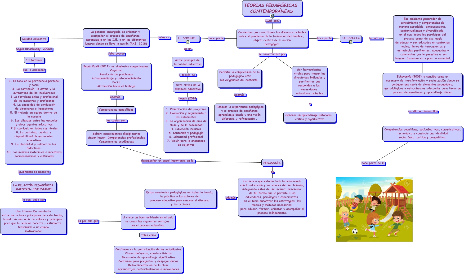 Este Cmap, tiene información relacionada con: TEORÍAS PEDAGÓGICAS CONTEMPORÁNEAS, Competencias específicas las cuales son: Saber: conocimientos disciplinarios Saber hacer: Competencias profesionales Competencias académicas, Echavarría (2003) la concibe como un escenario de transformación y socialización donde se conjugan una serie de elementos pedagógico, metodológicos y estructurales adecuados para llevar un proceso de enseñanza y aprendizaje idóneo en ella se desarrollan Competencias cognitivas, socioafectivas, comunicativas, tecnológica y construir una identidad social única, crítica y competitiva., Ser herramientas vitales para trazar las directrices indicadas y pertinentes que responden a las necesidades educativas actuales y Generar un aprendizaje autónomo, crítico y significativo, Una interacción constante entre los actores principales de este hecho, basada en una serie de valores y principios para que la relación docente – estudiante trascienda a un campo motivacional es por ello que al crear un buen ambiente en el aula se crean las siguientes ventajas en el proceso educativo, EL DOCENTE hace parte Corrientes que constituyen los discursos actuales sobre el problema de la formación del hombre, objeto central de la acción pedagógica, 1. El foco en la pertinencia personal y social 2. La convicción, la estma y la autoestima de los involucrados 3.La fortaleza ética y profesional de los maestros y profesores 4. La capacidad de conducción de directores e inspectores 5. El trabajo en equipo dentro de la escuela 6. Las alianzas entre las escuelas y otros agentes educativos 7.El currículo en todos sus níveles 8. La cantidad, calidad y disponibilidad de materiales educativos 9. La pluralidad y calidad de las didácticas 10. Los mínimos materiales e incentivos socioeconómicos y culturales igualmente se necesita LA RELACIÓN PEDAGÓGICA MAESTRO- ESTUDIANTE, Ser herramientas vitales para trazar las directrices indicadas y pertinentes que responden a las necesidades educativas actuales se caracterizan por Corrientes que constituyen los discursos actuales sobre el problema de la formación del hombre, objeto central de la acción pedagógica, siete claves de la dinámica educativa Kosnik (2014 1. Planificación del programa 2. Evaluación y seguimiento a los estudiantes 3. La organización de aula de clase y de la comunidad 4. Educación inclusiva 5. Contenido y pedagogía 6. Identidad profesional 7. Visión para la enseñanza de objetivos, Según Pavié (2011) las siguientes competencias: Cognitivo Resolución de problemas Autoaprendizaje y autoconocimiento Social Motivación hacía el trabajo además, Competencias específicas, EL DOCENTE quien es La persona encargada de orientar y acompañar el proceso de enseñanza- aprendizaje en las I.E. o en las diferentes lugares donde se lleve la acción.(RAE, 2018), Ser herramientas vitales para trazar las directrices indicadas y pertinentes que responden a las necesidades educativas actuales se caracterizan por Permitir la comprensión de lo pedagógico ante las exigencias del contexto, La persona encargada de orientar y acompañar el proceso de enseñanza- aprendizaje en las I.E. o en las diferentes lugares donde se lleve la acción.(RAE, 2018) ???? Calidad educativa, LA ESCUELA hace parte Corrientes que constituyen los discursos actuales sobre el problema de la formación del hombre, objeto central de la acción pedagógica, 10 factores que la componen 1. El foco en la pertinencia personal y social 2. La convicción, la estma y la autoestima de los involucrados 3.La fortaleza ética y profesional de los maestros y profesores 4. La capacidad de conducción de directores e inspectores 5. El trabajo en equipo dentro de la escuela 6. Las alianzas entre las escuelas y otros agentes educativos 7.El currículo en todos sus níveles 8. La cantidad, calidad y disponibilidad de materiales educativos 9. La pluralidad y calidad de las didácticas 10. Los mínimos materiales e incentivos socioeconómicos y culturales, Saber: conocimientos disciplinarios Saber hacer: Competencias profesionales Competencias académicas desempeñan un papel importante en la PEDAGOGÍA, PEDAGOGÍA es La ciencia que estudia todo lo relacionado con la educación y los valores del ser humano, integrando estos de una manera armoniosa de tal forma que le permite a los educadores, psicólogos o especialistas en el tema encontrar las estrategias, los medios y métodos necesarios para educar, formar, orientar y acompañar el proceso idóneamente., La persona encargada de orientar y acompañar el proceso de enseñanza- aprendizaje en las I.E. o en las diferentes lugares donde se lleve la acción.(RAE, 2018) debe poseer Según Pavié (2011) las siguientes competencias: Cognitivo Resolución de problemas Autoaprendizaje y autoconocimiento Social Motivación hacía el trabajo, TEORIAS PEDAGÓGICAS CONTEMPORÁNEAS ¿Qué son? Corrientes que constituyen los discursos actuales sobre el problema de la formación del hombre, objeto central de la acción pedagógica, Actor principal de la calidad educativa a través de siete claves de la dinámica educativa, Ese ambiente generador de conocimiento y competencias de manera agradable, enriquecedora, contextualizada y diversificada, en el cual todos los partícipes del proceso gozan de esa magia de educar y ser educados en contextos reales, llenos de herramientas y estrategias pertinentes, adecuadas y coherentes que le permiten al ser humano formarse en y para la sociedad. ???? Echavarría (2003) la concibe como un escenario de transformación y socialización donde se conjugan una serie de elementos pedagógico, metodológicos y estructurales adecuados para llevar un proceso de enseñanza y aprendizaje idóneo