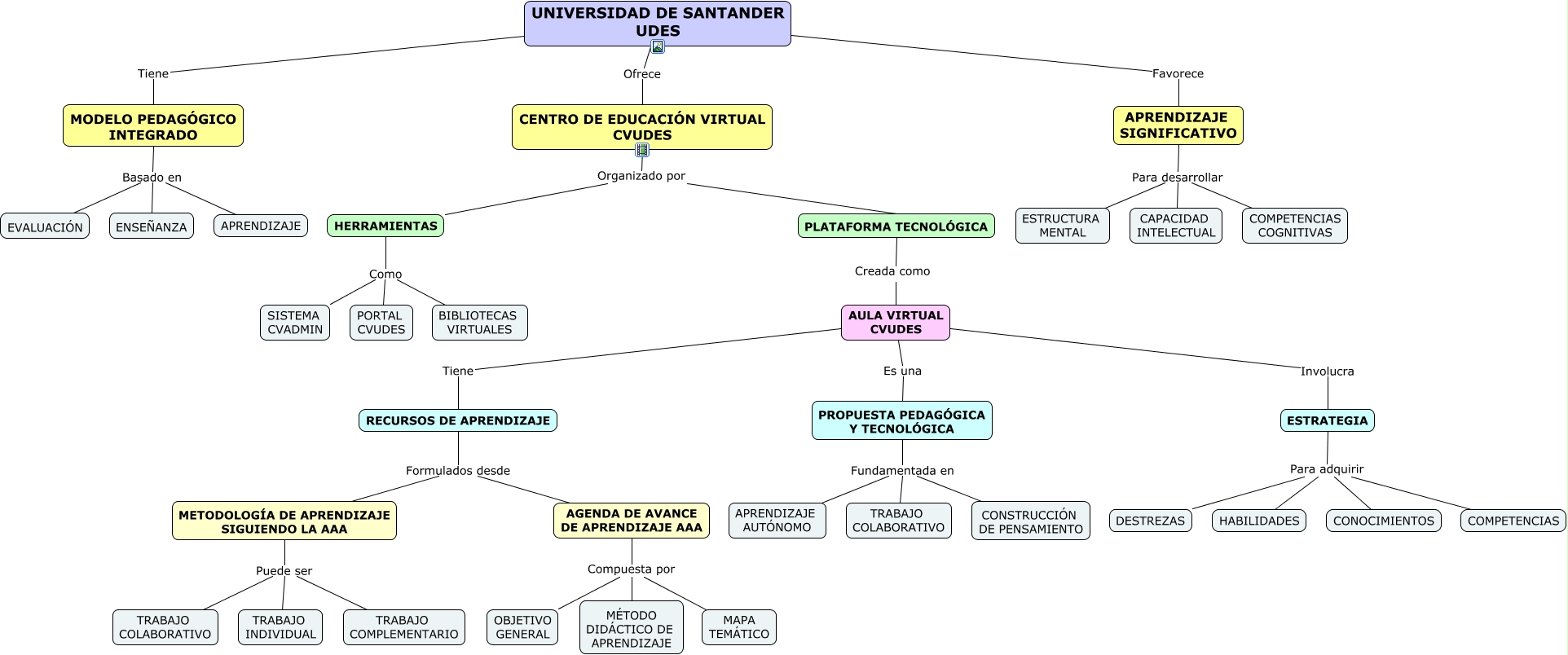 Este Cmap, tiene información relacionada con: Mapa Conceptual - CVUDES, HERRAMIENTAS Como SISTEMA CVADMIN, ESTRATEGIA Para adquirir COMPETENCIAS, HERRAMIENTAS Como BIBLIOTECAS VIRTUALES, METODOLOGÍA DE APRENDIZAJE SIGUIENDO LA AAA Puede ser TRABAJO COLABORATIVO, ESTRATEGIA Para adquirir HABILIDADES, AGENDA DE AVANCE DE APRENDIZAJE AAA Compuesta por MAPA TEMÁTICO, METODOLOGÍA DE APRENDIZAJE SIGUIENDO LA AAA Puede ser TRABAJO INDIVIDUAL, MODELO PEDAGÓGICO INTEGRADO Basado en EVALUACIÓN, RECURSOS DE APRENDIZAJE Formulados desde AGENDA DE AVANCE DE APRENDIZAJE AAA, PROPUESTA PEDAGÓGICA Y TECNOLÓGICA Fundamentada en TRABAJO COLABORATIVO, APRENDIZAJE SIGNIFICATIVO Para desarrollar COMPETENCIAS COGNITIVAS, UNIVERSIDAD DE SANTANDER UDES Ofrece CENTRO DE EDUCACIÓN VIRTUAL CVUDES, PROPUESTA PEDAGÓGICA Y TECNOLÓGICA Fundamentada en CONSTRUCCIÓN DE PENSAMIENTO, ESTRATEGIA Para adquirir CONOCIMIENTOS, AULA VIRTUAL CVUDES Es una PROPUESTA PEDAGÓGICA Y TECNOLÓGICA, AGENDA DE AVANCE DE APRENDIZAJE AAA Compuesta por OBJETIVO GENERAL, ESTRATEGIA Para adquirir DESTREZAS, UNIVERSIDAD DE SANTANDER UDES Tiene MODELO PEDAGÓGICO INTEGRADO, AULA VIRTUAL CVUDES Tiene RECURSOS DE APRENDIZAJE, CENTRO DE EDUCACIÓN VIRTUAL CVUDES Organizado por PLATAFORMA TECNOLÓGICA