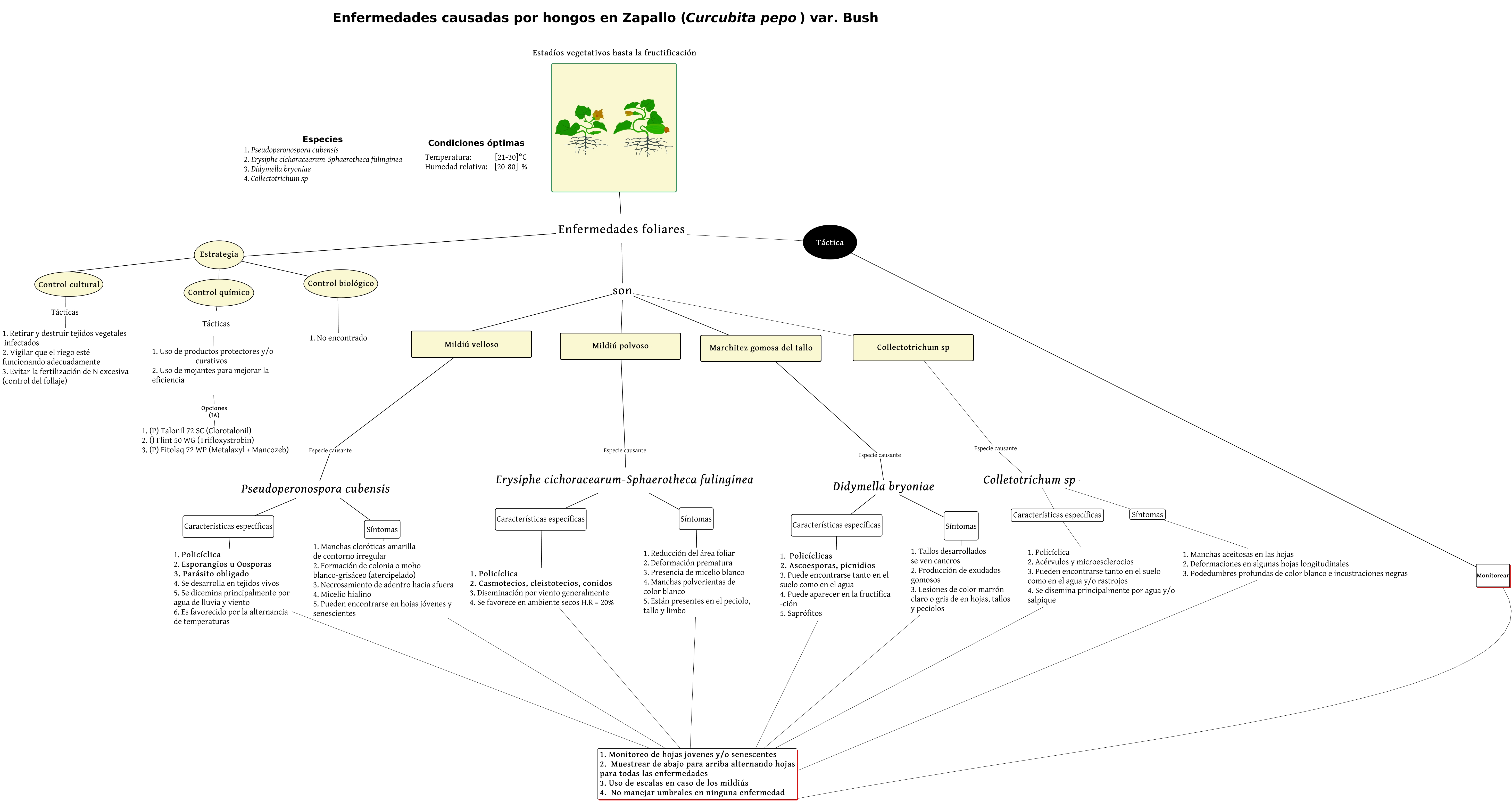 This Concept Map, created with IHMC CmapTools, has information related to: Enfermedades Vf parte 4, 1. Policíclica 2. Casmotecios, cleistotecios, conidos 3. Diseminación por viento generalmente 4. Se favorece en ambiente secos H.R = 20% ???? 1. Monitoreo de hojas jovenes y/o senescentes 2. Muestrear de abajo para arriba alternando hojas para todas las enfermedades 3. Uso de escalas en caso de los mildiús 4. No manejar umbrales en ninguna enfermedad, Síntomas ???? 1. Manchas cloróticas amarilla de contorno irregular 2. Formación de colonia o moho blanco-grisáceo (atercipelado) 3. Necrosamiento de adentro hacia afuera 4. Micelio hialino 5. Pueden encontrarse en hojas jóvenes y senescientes, Estrategia ???? Control cultural, Mildiú polvoso Especie causante Erysiphe cichoracearum-Sphaerotheca fulinginea, Pseudoperonospora cubensis Características específicas 1. Policíclica 2. Esporangios u Oosporas 3. Parásito obligado 4. Se desarrolla en tejidos vivos 5. Se dicemina principalmente por agua de lluvia y viento 6. Es favorecido por la alternancia de temperaturas, Tácticas ???? 1. Uso de productos protectores y/o curativos 2. Uso de mojantes para mejorar la eficiencia, Enfermedades foliares son Mildiú velloso, Enfermedades foliares ???? Estrategia, 1. Policíclica 2. Esporangios u Oosporas 3. Parásito obligado 4. Se desarrolla en tejidos vivos 5. Se dicemina principalmente por agua de lluvia y viento 6. Es favorecido por la alternancia de temperaturas ???? 1. Monitoreo de hojas jovenes y/o senescentes 2. Muestrear de abajo para arriba alternando hojas para todas las enfermedades 3. Uso de escalas en caso de los mildiús 4. No manejar umbrales en ninguna enfermedad, 1. Reducción del área foliar 2. Deformación prematura 3. Presencia de micelio blanco 4. Manchas polvorientas de color blanco 5. Están presentes en el peciolo, tallo y limbo ???? 1. Monitoreo de hojas jovenes y/o senescentes 2. Muestrear de abajo para arriba alternando hojas para todas las enfermedades 3. Uso de escalas en caso de los mildiús 4. No manejar umbrales en ninguna enfermedad, Enfermedades foliares son Marchitez gomosa del tallo, Táctica ???? Enfermedades foliares, Collectotrichum sp Especie causante Colletotrichum sp, Estrategia ???? Control biológico, Marchitez gomosa del tallo Especie causante Didymella bryoniae, Estrategia ???? Control químico, Mildiú velloso Especie causante Pseudoperonospora cubensis, Control cultural ???? 1. Retirar y destruir tejidos vegetales infectados 2. Vigilar que el riego esté funcionando adecuadamente 3. Evitar la fertilización de N excesiva (control del follaje), 1. Uso de productos protectores y/o curativos 2. Uso de mojantes para mejorar la eficiencia Opciones (IA) 1. (P) Talonil 72 SC (Clorotalonil) 2. () Flint 50 WG (Trifloxystrobin) 3. (P) Fitolaq 72 WP (Metalaxyl + Mancozeb), 1. Policíclicas 2. Ascoesporas, picnidios 3. Puede encontrarse tanto en el suelo como en el agua 4. Puede aparecer en la fructifica -ción 5. Saprófitos ???? 1. Monitoreo de hojas jovenes y/o senescentes 2. Muestrear de abajo para arriba alternando hojas para todas las enfermedades 3. Uso de escalas en caso de los mildiús 4. No manejar umbrales en ninguna enfermedad