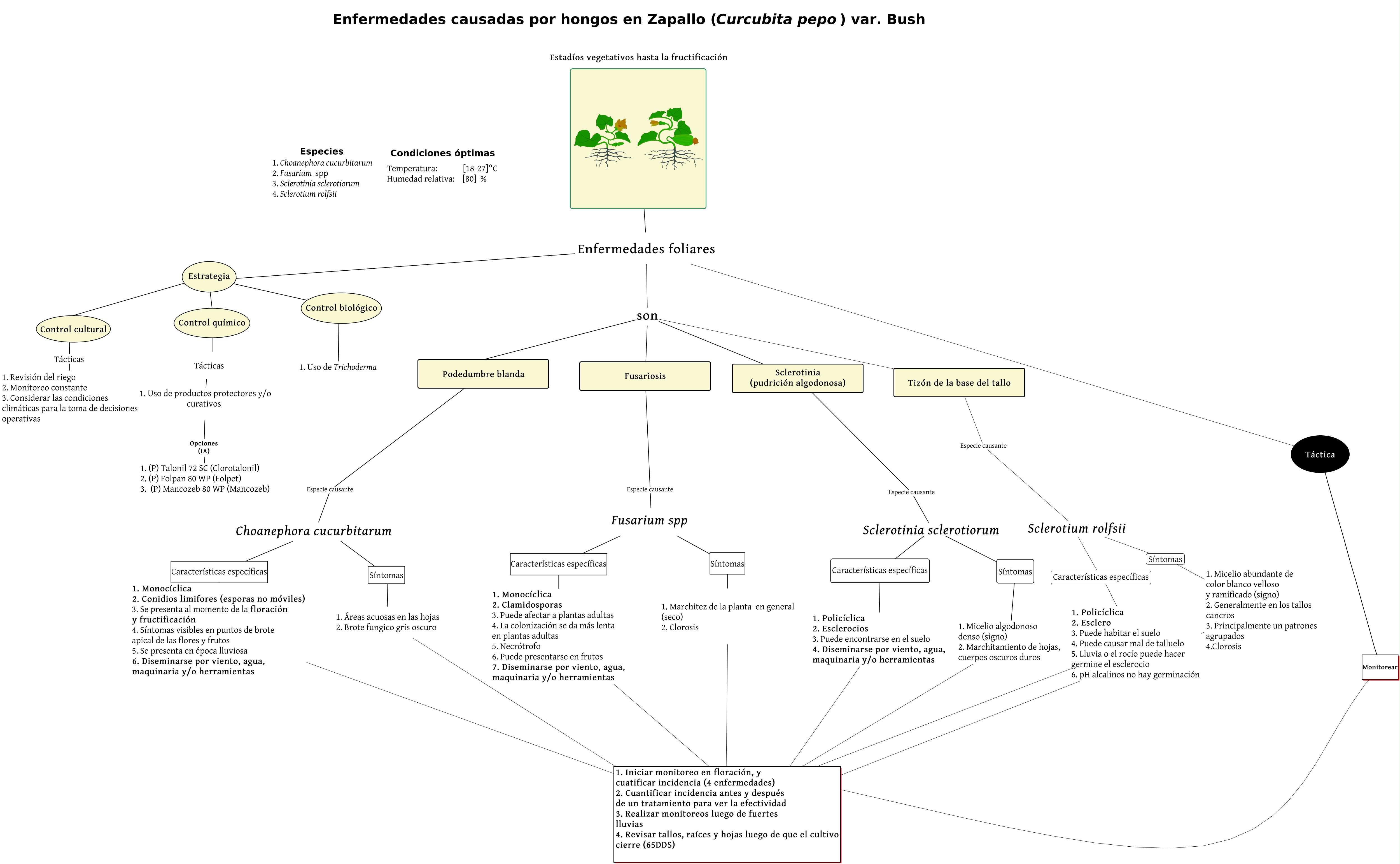 This Concept Map, created with IHMC CmapTools, has information related to: Enfermedades Vf parte 3, 1. Áreas acuosas en las hojas 2. Brote fungico gris oscuro ???? 1. Iniciar monitoreo en floración, y cuatificar incidencia (4 enfermedades) 2. Cuantificar incidencia antes y después de un tratamiento para ver la efectividad 3. Realizar monitoreos luego de fuertes lluvias 4. Revisar tallos, raíces y hojas luego de que el cultivo cierre (65DDS), 1. Micelio algodonoso denso (signo) 2. Marchitamiento de hojas, cuerpos oscuros duros ???? 1. Iniciar monitoreo en floración, y cuatificar incidencia (4 enfermedades) 2. Cuantificar incidencia antes y después de un tratamiento para ver la efectividad 3. Realizar monitoreos luego de fuertes lluvias 4. Revisar tallos, raíces y hojas luego de que el cultivo cierre (65DDS), Estrategia ???? Control cultural, Podedumbre blanda Especie causante Choanephora cucurbitarum, Síntomas ???? 1. Áreas acuosas en las hojas 2. Brote fungico gris oscuro, Enfermedades foliares son Sclerotinia (pudrición algodonosa), Fusarium spp Síntomas 1. Marchitez de la planta en general (seco) 2. Clorosis, Características específicas ???? 1. Policíclica 2. Esclero 3. Puede habitar el suelo 4. Puede causar mal de talluelo 5. Lluvia o el rocío puede hacer germine el esclerocio 6. pH alcalinos no hay germinación, Sclerotinia sclerotiorum Características específicas 1. Policíclica 2. Esclerocios 3. Puede encontrarse en el suelo 4. Diseminarse por viento, agua, maquinaria y/o herramientas, Fusarium spp Características específicas 1. Monocíclica 2. Clamidosporas 3. Puede afectar a plantas adultas 4. La colonización se da más lenta en plantas adultas 5. Necrótrofo 6. Puede presentarse en frutos 7. Diseminarse por viento, agua, maquinaria y/o herramientas, 1. Uso de productos protectores y/o curativos Opciones (IA) 1. (P) Talonil 72 SC (Clorotalonil) 2. (P) Folpan 80 WP (Folpet) 3. (P) Mancozeb 80 WP (Mancozeb), 1. Micelio abundante de color blanco velloso y ramificado (signo) 2. Generalmente en los tallos cancros 3. Principalmente un patrones agrupados 4.Clorosis ???? 1. Iniciar monitoreo en floración, y cuatificar incidencia (4 enfermedades) 2. Cuantificar incidencia antes y después de un tratamiento para ver la efectividad 3. Realizar monitoreos luego de fuertes lluvias 4. Revisar tallos, raíces y hojas luego de que el cultivo cierre (65DDS), Sclerotium rolfsii ???? Características específicas, Tizón de la base del tallo Especie causante Sclerotium rolfsii, Sclerotinia (pudrición algodonosa) Especie causante Sclerotinia sclerotiorum, Estrategia ???? Control biológico, Enfermedades foliares son Fusariosis, 1. Marchitez de la planta en general (seco) 2. Clorosis ???? 1. Iniciar monitoreo en floración, y cuatificar incidencia (4 enfermedades) 2. Cuantificar incidencia antes y después de un tratamiento para ver la efectividad 3. Realizar monitoreos luego de fuertes lluvias 4. Revisar tallos, raíces y hojas luego de que el cultivo cierre (65DDS), Síntomas ???? 1. Micelio abundante de color blanco velloso y ramificado (signo) 2. Generalmente en los tallos cancros 3. Principalmente un patrones agrupados 4.Clorosis, Choanephora cucurbitarum ???? Síntomas