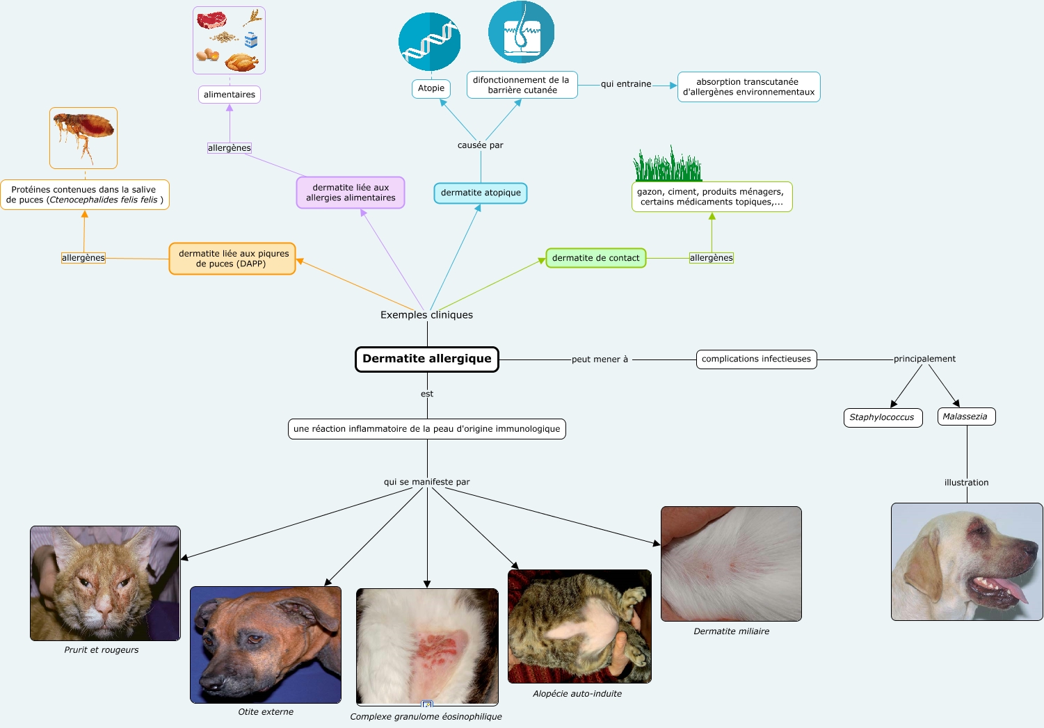 Cette carte de concepts créée avec IHMC CmapTools traite de: 4.1.Dermatite, complications infectieuses principalement Staphylococcus, dermatite atopique causée par Atopie, une réaction inflammatoire de la peau d'origine immunologique qui se manifeste par, une réaction inflammatoire de la peau d'origine immunologique qui se manifeste par, Dermatite allergique Exemples cliniques dermatite liée aux piqures de puces (DAPP), dermatite liée aux allergies alimentaires allergènes alimentaires, Atopie ????, une réaction inflammatoire de la peau d'origine immunologique qui se manifeste par, Dermatite allergique Exemples cliniques dermatite liée aux allergies alimentaires, Malassezia illustration, dermatite liée aux piqures de puces (DAPP) allergènes Protéines contenues dans la salive de puces (Ctenocephalides felis felis), Protéines contenues dans la salive de puces (Ctenocephalides felis felis) ????, dermatite de contact allergènes gazon, ciment, produits ménagers, certains médicaments topiques,..., Dermatite allergique Exemples cliniques dermatite de contact, alimentaires ????, Dermatite allergique peut mener à complications infectieuses, une réaction inflammatoire de la peau d'origine immunologique qui se manifeste par, gazon, ciment, produits ménagers, certains médicaments topiques,..., Dermatite allergique Exemples cliniques dermatite atopique, difonctionnement de la barrière cutanée qui entraine absorption transcutanée d'allergènes environnementaux