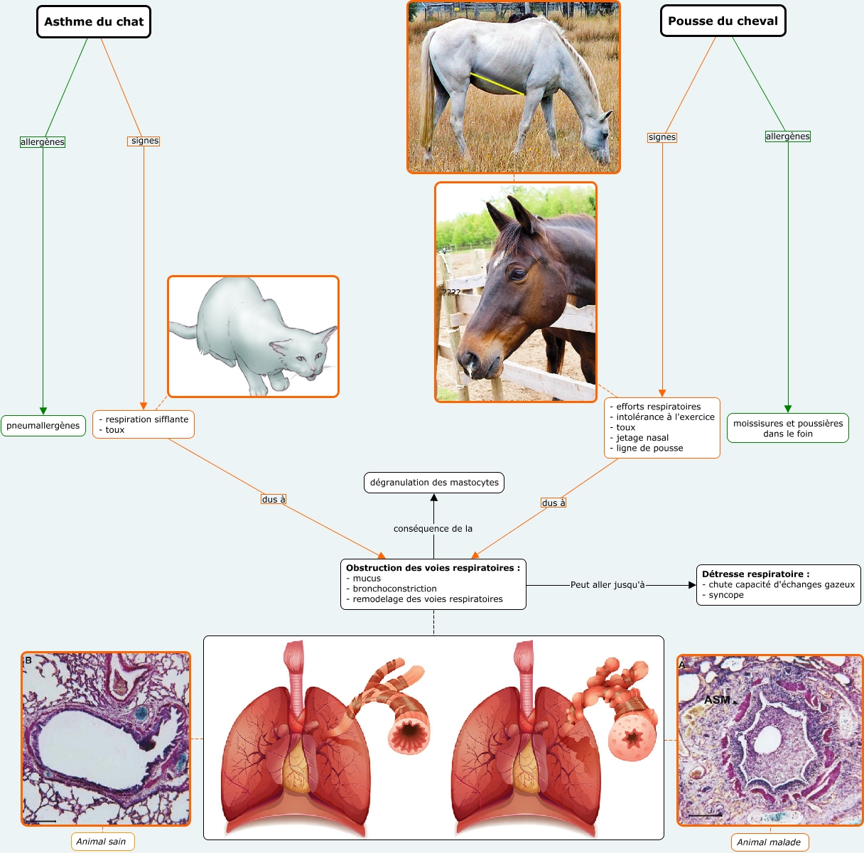 Cette carte de concepts créée avec IHMC CmapTools traite de: 4.2.Asthme, - respiration sifflante - toux dus à Obstruction des voies respiratoires : - mucus - bronchoconstriction - remodelage des voies respiratoires, ????, Obstruction des voies respiratoires : - mucus - bronchoconstriction - remodelage des voies respiratoires conséquence de la dégranulation des mastocytes, Asthme du chat signes - respiration sifflante - toux, ???? Animal malade, - respiration sifflante - toux ????, Asthme du chat allergènes pneumallergènes, - efforts respiratoires - intolérance à l'exercice - toux - jetage nasal - ligne de pousse dus à Obstruction des voies respiratoires : - mucus - bronchoconstriction - remodelage des voies respiratoires, Pousse du cheval signes - efforts respiratoires - intolérance à l'exercice - toux - jetage nasal - ligne de pousse, - efforts respiratoires - intolérance à l'exercice - toux - jetage nasal - ligne de pousse ????, Obstruction des voies respiratoires : - mucus - bronchoconstriction - remodelage des voies respiratoires ????, Obstruction des voies respiratoires : - mucus - bronchoconstriction - remodelage des voies respiratoires Peut aller jusqu'à Détresse respiratoire : - chute capacité d'échanges gazeux - syncope, ???? Animal sain, ????, Pousse du cheval allergènes moissisures et poussières dans le foin