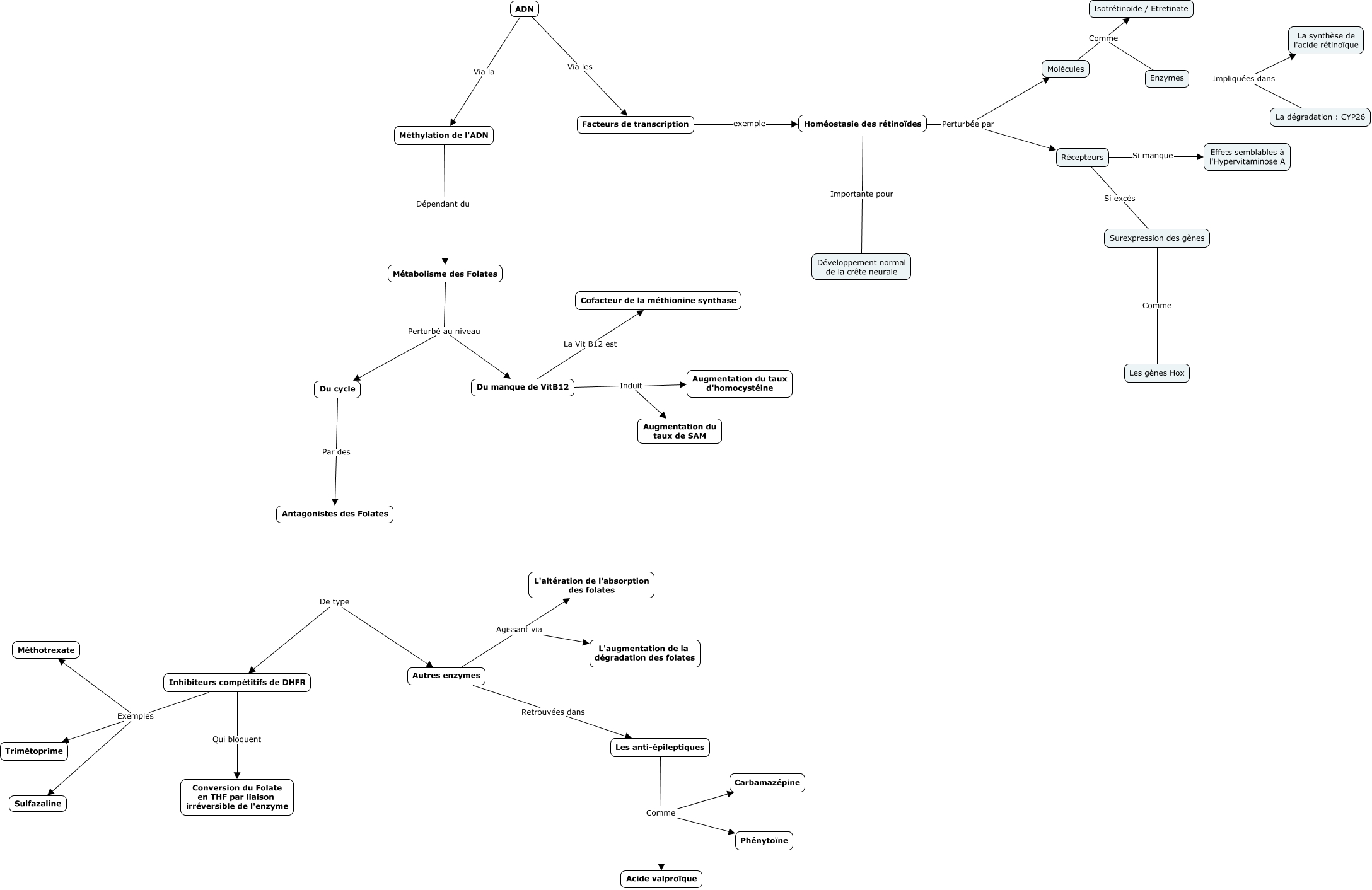 Cette carte de concepts créée avec IHMC CmapTools traite de: ADN, Antagonistes des Folates De type Autres enzymes, Enzymes Impliquées dans La dégradation : CYP26, Inhibiteurs compétitifs de DHFR Exemples Sulfazaline, Récepteurs Si excès Surexpression des gènes, ADN Via la Méthylation de l'ADN, Enzymes Impliquées dans La synthèse de l'acide rétinoïque, Récepteurs Si manque Effets semblables à l'Hypervitaminose A, Métabolisme des Folates Perturbé au niveau Du cycle, Inhibiteurs compétitifs de DHFR Exemples Méthotrexate, Les anti-épileptiques Comme Carbamazépine, Homéostasie des rétinoïdes Importante pour Développement normal de la crête neurale, ADN Via les Facteurs de transcription, Méthylation de l'ADN Dépendant du Métabolisme des Folates, Du manque de VitB12 Induit Augmentation du taux d'homocystéine, Inhibiteurs compétitifs de DHFR Exemples Trimétoprime, Antagonistes des Folates De type Inhibiteurs compétitifs de DHFR, Les anti-épileptiques Comme Acide valproïque, Du manque de VitB12 La Vit B12 est Cofacteur de la méthionine synthase, Molécules Comme Isotrétinoïde / Etretinate, Facteurs de transcription exemple Homéostasie des rétinoïdes