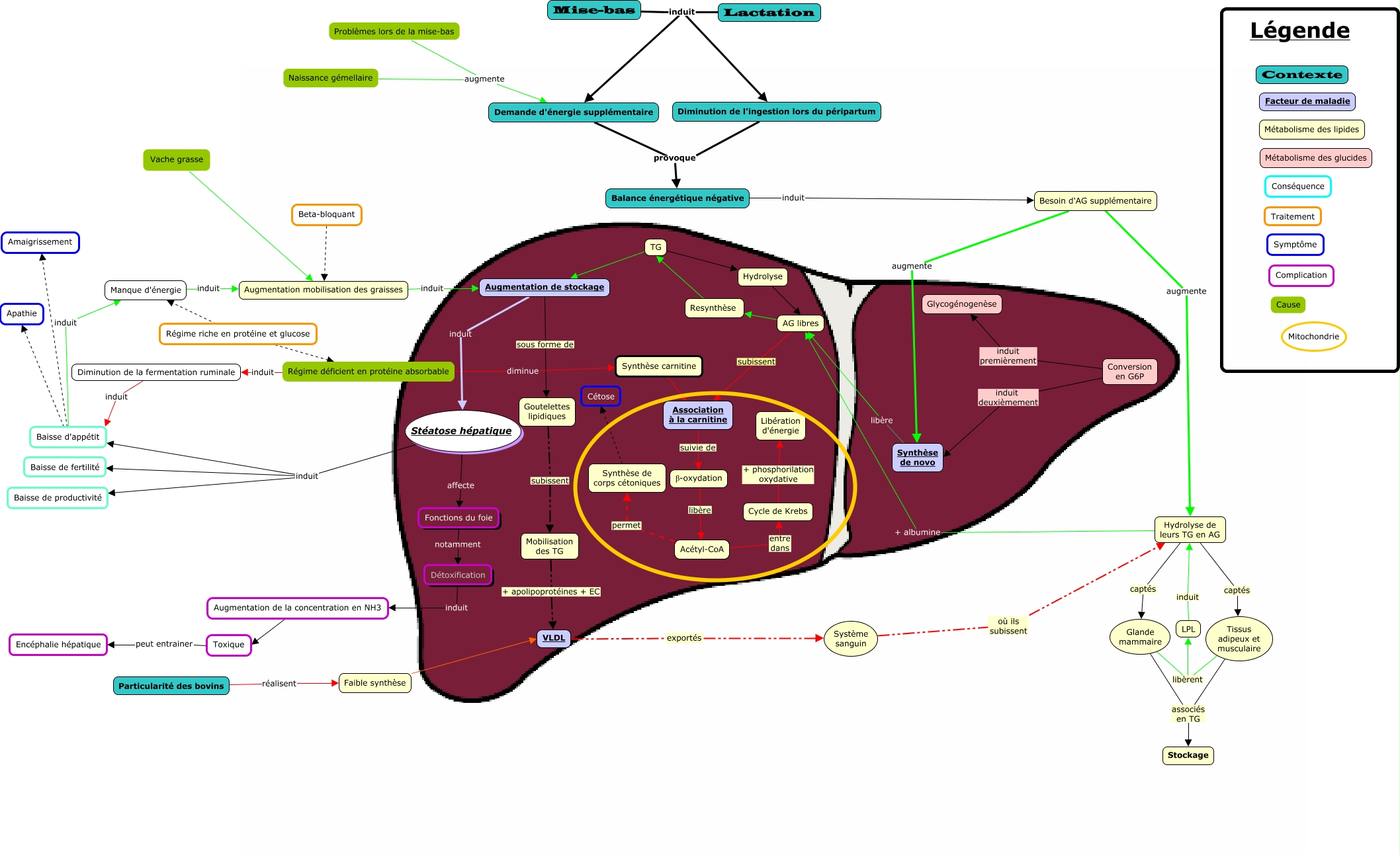 Cette carte de concepts créée avec IHMC CmapTools traite de: BV 02.05, Stéatose hépatique induit Baisse de productivité, Augmentation de stockage induit Stéatose hépatique, Hydrolyse de leurs TG en AG captés Tissus adipeux et musculaire, TG Hydrolyse, Conversion en G6P induit deuxièmement Synthèse de novo, Problèmes lors de la mise-bas augmente Demande d'énergie supplémentaire, Association à la carnitine suivie de β-oxydation, TG Augmentation de stockage, Acétyl-CoA entre dans Cycle de Krebs, Glande mammaire libèrent LPL, Régime riche en protéine et glucose Régime déficient en protéine absorbable, LPL induit Hydrolyse de leurs TG en AG, Augmentation mobilisation des graisses induit Augmentation de stockage, Synthèse carnitine Association à la carnitine, Augmentation de la concentration en NH3 Toxique, Manque d'énergie induit Augmentation mobilisation des graisses, Mise-bas induit Diminution de l'ingestion lors du péripartum, Faible synthèse VLDL, Régime riche en protéine et glucose Manque d'énergie, Augmentation de stockage sous forme de Goutelettes lipidiques