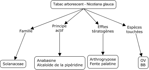 Cette carte de concepts créée avec IHMC CmapTools traite de: Tabac, Tabac arborescent - Nicotiana glauca Espèces touchées OV BB, Tabac arborescent - Nicotiana glauca Principe actif Anabasine Alcaloïde de la pipéridine, Tabac arborescent - Nicotiana glauca Efftes tératogènes Arthrogrypose Fente palatine, Tabac arborescent - Nicotiana glauca Famille Solanaceae