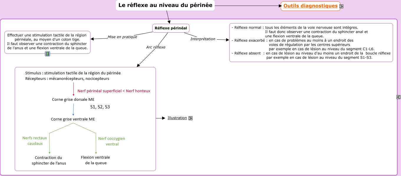 Cette carte de concepts créée avec IHMC CmapTools traite de: Carte 3 Réflexe au niveau du périnée, Illustration, Réflexe périnéal Mise en pratique Effectuer une stimulation tactile de la région périnéale, au moyen d'un coton tige. Il faut observer une contraction du sphincter de l'anus et une flexion ventrale de la queue., Le réflexe au niveau du périnée Réflexe périnéal, Réflexe périnéal Arc réflexe, Le réflexe au niveau du périnée, Réflexe périnéal Interprétation - Réflexe normal : tous les éléments de la voie nerveuse sont intègres. Il faut donc observer une contraction du sphincter anal et une flexion ventrale de la queue. - Réflexe exacerbé : en cas de problèmes au moins à un endroit des voies de régulation par les centres supérieurs par exemple en cas de lésion au niveau du segment C1-L6. - Réflexe absent : en cas de lésion au niveau d'au moins un endroit de la boucle réflexe par exemple en cas de lésion au niveau du segment S1-S3.