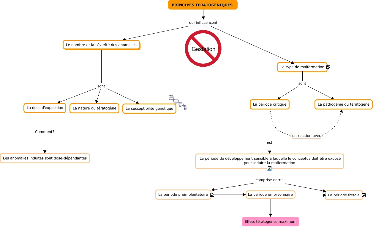 Cette carte de concepts créée avec IHMC CmapTools traite de: Principes tératogéniques définitif, Effets foetotoxiques caractérisé par Potentiel syndrome d'imprégnation ou de sevrage, La période préimplentatoire caractérisée par Un risque tératogène lié à la demi-vie de la substance, Le type de malformation sont La pathogénie du tératogène, La période critique est La période de développement sensible à laquelle le conceptus doit être exposé pour induire la malformation, PRINCIPES TÉRATOGÉNIQUES qui influcencent Le nombre et la séverité des anomalies, Le nombre et la séverité des anomalies sont La susceptibilité génétique, La période préimplentatoire La période embryonnaire La période fœtale, La période de développement sensible à laquelle le conceptus doit être exposé pour induire la malformation comprise entre La période fœtale, Le type de malformation sont La période critique, La période de développement sensible à laquelle le conceptus doit être exposé pour induire la malformation comprise entre La période préimplentatoire, Congénitales car présentes à la naissance, PRINCIPES TÉRATOGÉNIQUES qui influcencent Le type de malformation, Formes mineures toutes Congénitales, La période fœtale induit principalement Effets foetotoxiques, Le type de malformation entrainant Mort (plutôt que des anomalies), Le nombre et la séverité des anomalies sont La dose d'exposition, La période préimplentatoire caractérisée par La loi du "tout ou rien" (mort embryonnaire ou survie sans séquelle), La dose d'exposition Comment? Les anomalies induites sont dose-dépendantes, Formes majeures (conséquences médicales voir vitales) toutes Congénitales, Formes majeures (conséquences médicales voir vitales) Mort (plutôt que des anomalies)