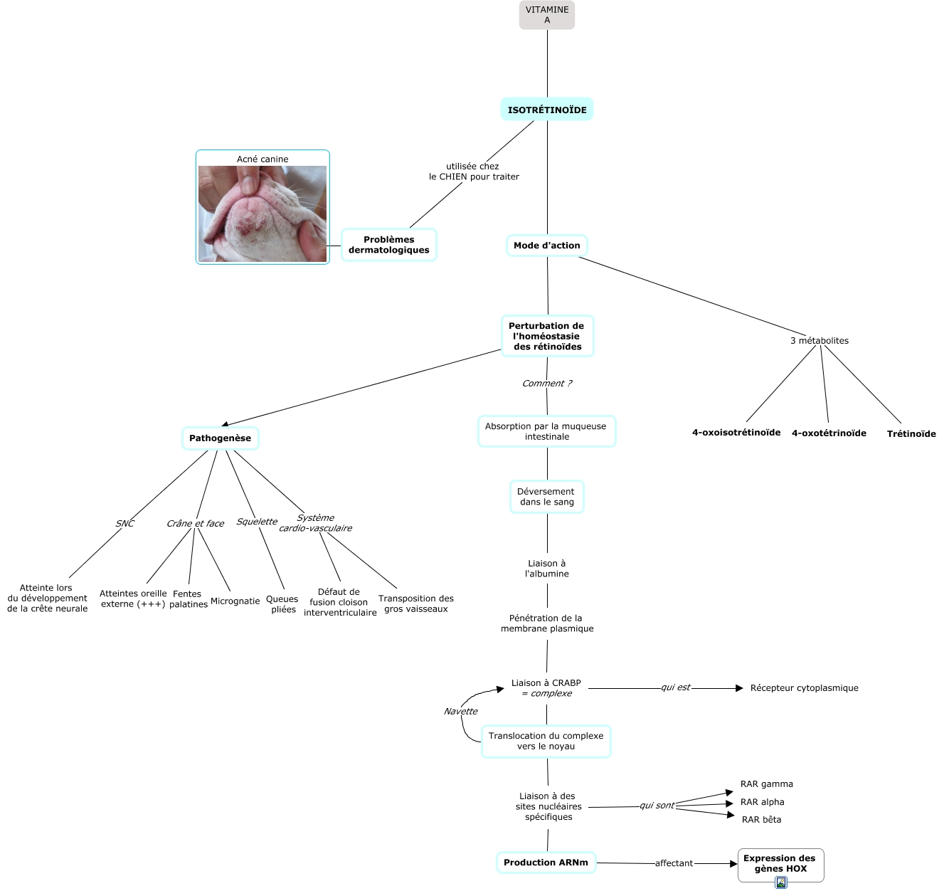 Cette carte de concepts créée avec IHMC CmapTools traite de: Vitamines, Pathogenèse Système cardio-vasculaire Défaut de fusion cloison interventriculaire, Liaison à CRABP = complexe qui est Récepteur cytoplasmique, Pathogenèse Crâne et face Atteintes oreille externe (+++), Absorption par la muqueuse intestinale Déversement dans le sang, Translocation du complexe vers le noyau Navette Liaison à CRABP = complexe, ISOTRÉTINOÏDE utilisée chez le CHIEN pour traiter Problèmes dermatologiques, Mode d'action 3 métabolites Trétinoïde, Perturbation de l'homéostasie des rétinoïdes Pathogenèse, Mode d'action 3 métabolites 4-oxotétrinoïde, Pénétration de la membrane plasmique Liaison à CRABP = complexe, Liaison à des sites nucléaires spécifiques qui sont RAR alpha, Liaison à CRABP = complexe Translocation du complexe vers le noyau, Liaison à des sites nucléaires spécifiques qui sont RAR gamma, Production ARNm affectant Expression des gènes HOX, Liaison à l'albumine Pénétration de la membrane plasmique, Liaison à des sites nucléaires spécifiques Production ARNm, VITAMINE A ISOTRÉTINOÏDE, Déversement dans le sang Liaison à l'albumine, Pathogenèse Système cardio-vasculaire Transposition des gros vaisseaux, Liaison à des sites nucléaires spécifiques qui sont RAR bêta