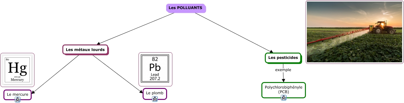 Cette carte de concepts créée avec IHMC CmapTools traite de: Les polluants, Les pesticides exemple Polychlorobiphényle (PCB), Les métaux lourds Le plomb, Les métaux lourds Le mercure, Les POLLUANTS Les métaux lourds, Les POLLUANTS Les pesticides
