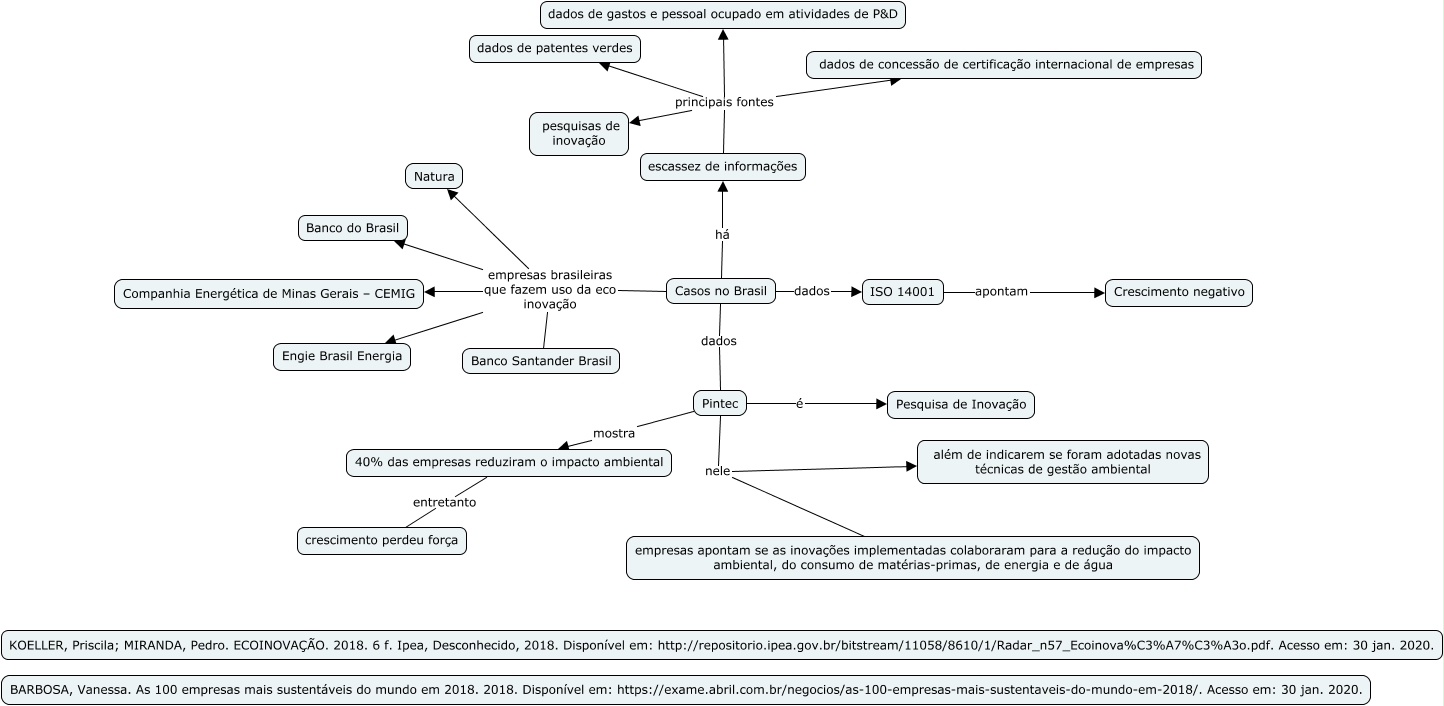 Esse mapa conceitual, produzido no IHMC CmapTools, tem a informação relacionada a: 5. Casos no Brasil, Casos no Brasil empresas brasileiras que fazem uso da eco inovação Banco do Brasil, Pintec mostra 40% das empresas reduziram o impacto ambiental, ISO 14001 apontam Crescimento negativo, escassez de informações principais fontes dados de patentes verdes, Casos no Brasil empresas brasileiras que fazem uso da eco inovação Engie Brasil Energia, escassez de informações principais fontes pesquisas de inovação, Casos no Brasil empresas brasileiras que fazem uso da eco inovação Companhia Energética de Minas Gerais – CEMIG, escassez de informações principais fontes dados de concessão de certificação internacional de empresas, Pintec é Pesquisa de Inovação, Casos no Brasil dados ISO 14001, Pintec nele empresas apontam se as inovações implementadas colaboraram para a redução do impacto ambiental, do consumo de matérias-primas, de energia e de água, Casos no Brasil dados Pintec, escassez de informações principais fontes dados de gastos e pessoal ocupado em atividades de P&D, Casos no Brasil empresas brasileiras que fazem uso da eco inovação Banco Santander Brasil, Casos no Brasil há escassez de informações, Casos no Brasil empresas brasileiras que fazem uso da eco inovação Natura, Pintec nele além de indicarem se foram adotadas novas técnicas de gestão ambiental, 40% das empresas reduziram o impacto ambiental entretanto crescimento perdeu força