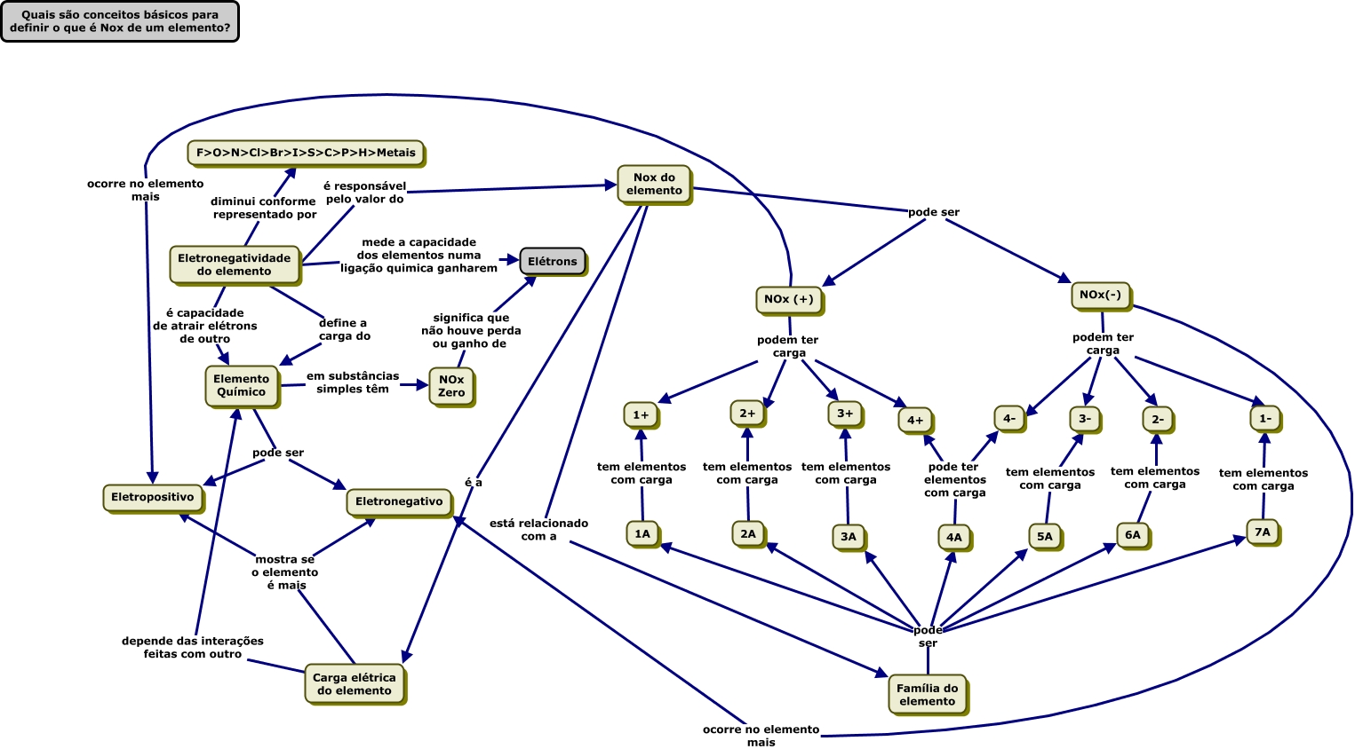 Esse mapa conceitual, produzido no IHMC CmapTools, tem a informação relacionada a: Sem título, Eletronegatividade do elemento é capacidade de atrair elétrons de outro Elemento Químico, NOx Zero significa que não houve perda ou ganho de Elétrons, NOx(-) podem ter carga 3-, NOx(-) podem ter carga 2-, Família do elemento pode ser 1A, Família do elemento pode ser 4A, Carga elétrica do elemento depende das interações feitas com outro Elemento Químico, NOx (+) podem ter carga 3+, NOx (+) podem ter carga 4+, Elemento Químico pode ser Eletronegativo, Elemento Químico em substâncias simples têm NOx Zero, NOx(-) ocorre no elemento mais Eletronegativo, Carga elétrica do elemento mostra se o elemento é mais Eletropositivo, Nox do elemento está relacionado com a Família do elemento, NOx (+) ocorre no elemento mais Eletropositivo, 7A tem elementos com carga 1-, 5A tem elementos com carga 3-, NOx (+) podem ter carga 2+, NOx(-) podem ter carga 1-, Família do elemento pode ser 5A