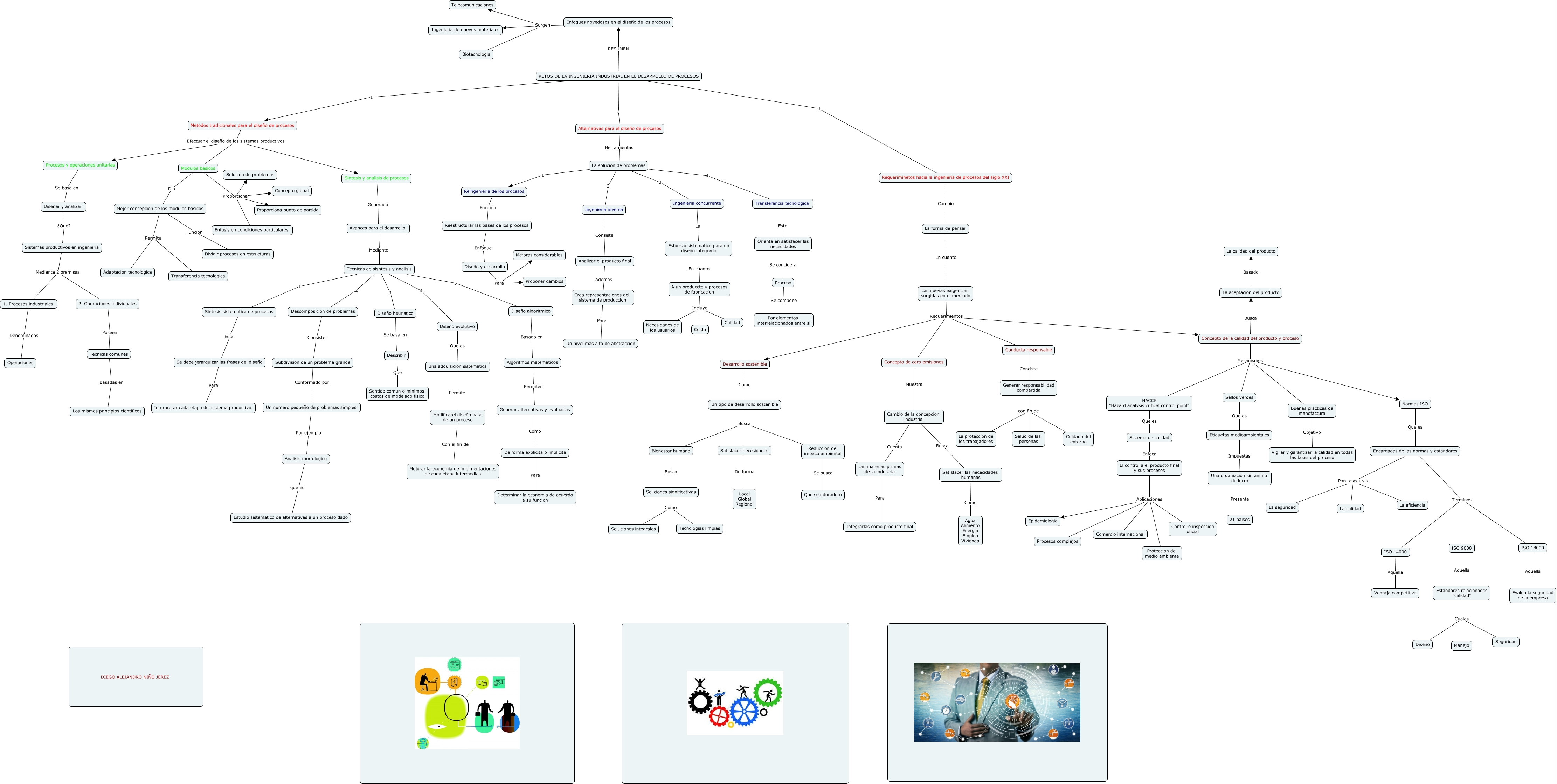 Este Cmap, tiene información relacionada con: Procesos Industriales, Generar responsabilidad compartida con fin de Salud de las personas, RETOS DE LA INGENIERIA INDUSTRIAL EN EL DESARROLLO DE PROCESOS 1 Metodos tradicionales para el diseño de procesos, Crea representaciones del sistema de produccion Para Un nivel mas alto de abstraccion, Las nuevas exigencias surgidas en el mercado Requerimientos Concepto de cero emisiones, Reduccion del impaco ambiental Se busca Que sea duradero, Reingenieria de los procesos Funcion Reestructurar las bases de los procesos, Modulos basicos Dio Mejor concepcion de los modulos basicos, Requeriminetos hacia la ingenieria de procesos del siglo XXI Cambio La forma de pensar, Procesos y operaciones unitarias Se basa en Diseñar y analizar, El control a el producto final y sus procesos Aplicaciones Proteccion del medio ambiente, Analisis morfologico que es Estudio sistematico de alternativas a un proceso dado, Tecnicas de sisntesis y analisis 2 Descomposicion de problemas, Buenas practicas de manofactura Objetivo Vigilar y garantizar la calidad en todas las fases del proceso, Generar responsabilidad compartida con fin de Cuidado del entorno, Las materias primas de la industria Para Integrarlas como producto final, Diseño algoritmico Basado en Algoritmos matematicos, La solucion de problemas 1 Reingenieria de los procesos, HACCP "Hazard analysis critical control point" Que es Sistema de calidad, Subdivision de un problema grande Conformado por Un numero pequeño de problemas simples, Diseño evolutivo Que es Una adquisicion sistematica
