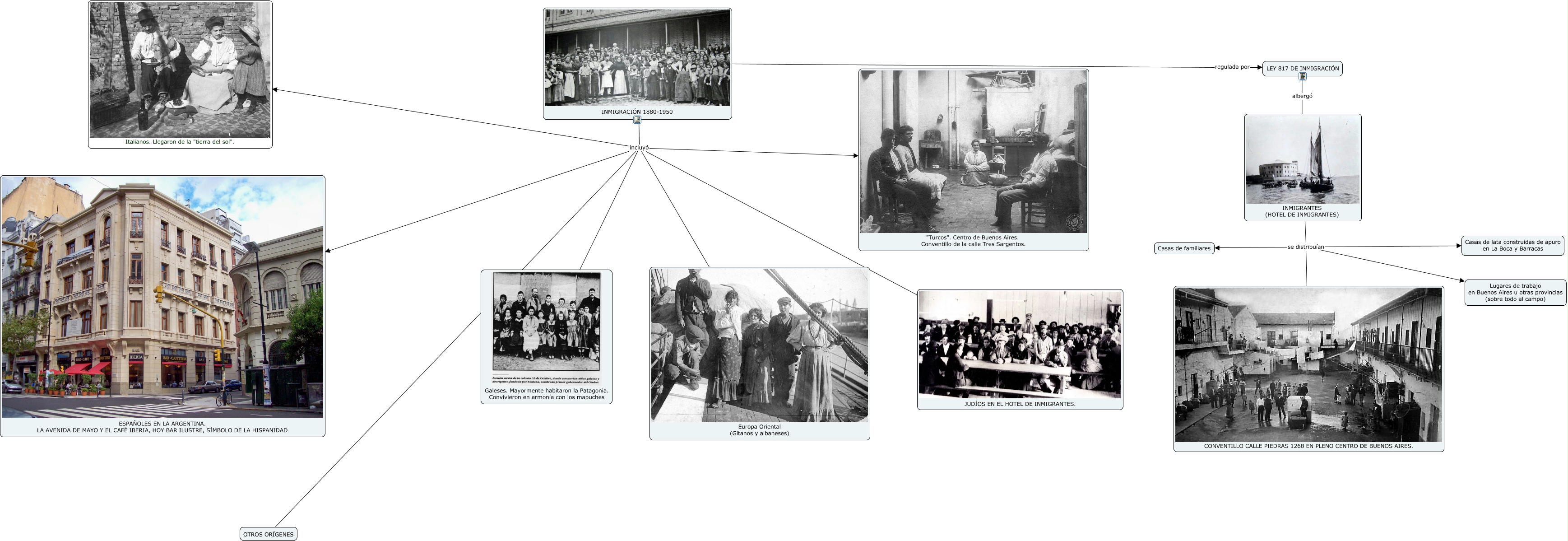 Este Cmap, tiene información relacionada con: INMIGRACION, INMIGRACIÓN 1880-1950 incluyó Europa Oriental (Gitanos y albaneses), INMIGRACIÓN 1880-1950 incluyó JUDÍOS EN EL HOTEL DE INMIGRANTES., INMIGRACIÓN 1880-1950 incluyó Italianos. Llegaron de la "tierra del sol"., INMIGRACIÓN 1880-1950 incluyó ESPAÑOLES EN LA ARGENTINA. LA AVENIDA DE MAYO Y EL CAFÉ IBERIA, HOY BAR ILUSTRE, SÍMBOLO DE LA HISPANIDAD, INMIGRANTES (HOTEL DE INMIGRANTES) se distribuían CONVENTILLO CALLE PIEDRAS 1268 EN PLENO CENTRO DE BUENOS AIRES., INMIGRACIÓN 1880-1950 incluyó OTROS ORÍGENES, INMIGRACIÓN 1880-1950 regulada por LEY 817 DE INMIGRACIÓN, INMIGRANTES (HOTEL DE INMIGRANTES) se distribuían Lugares de trabajo en Buenos Aires u otras provincias (sobre todo al campo), INMIGRANTES (HOTEL DE INMIGRANTES) se distribuían Casas de familiares, INMIGRACIÓN 1880-1950 incluyó Galeses. Mayormente habitaron la Patagonia. Convivieron en armonía con los mapuches, INMIGRANTES (HOTEL DE INMIGRANTES) se distribuían Casas de lata construidas de apuro en La Boca y Barracas, INMIGRACIÓN 1880-1950 incluyó "Turcos". Centro de Buenos Aires. Conventillo de la calle Tres Sargentos., LEY 817 DE INMIGRACIÓN albergó INMIGRANTES (HOTEL DE INMIGRANTES)