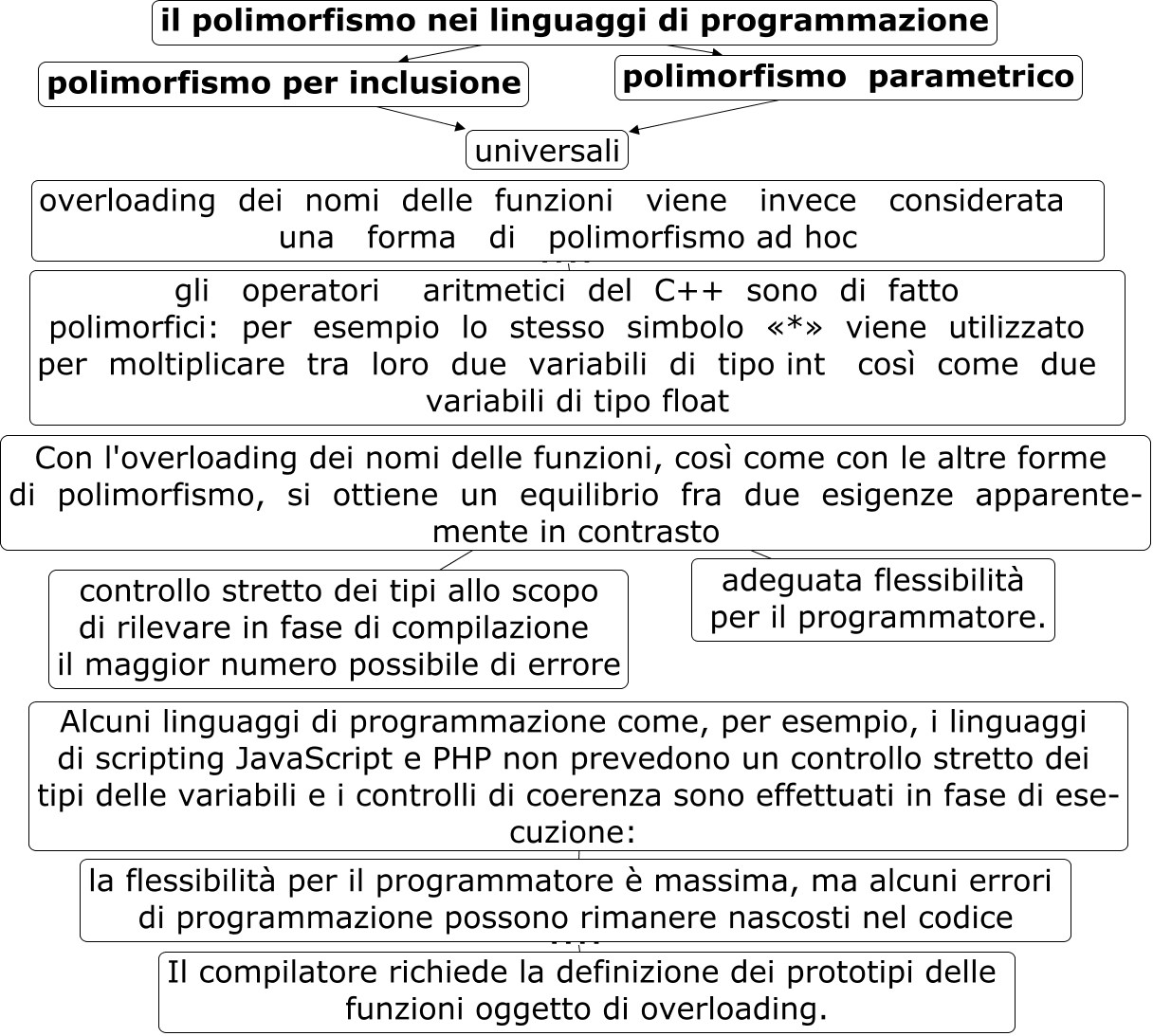 Questa Cmap, creata con IHMC CmapTools, contiene informazioni relative a: 144, Alcuni linguaggi di programmazione come, per esempio, i linguaggi di scripting JavaScript e PHP non prevedono un controllo stretto dei tipi delle variabili e i controlli di coerenza sono effettuati in fase di ese cuzione: ???? la flessibilità per il programmatore è massima, ma alcuni errori di programmazione possono rimanere nascosti nel codice, polimorfismo parametrico ???? universali, il polimorfismo nei linguaggi di programmazione ???? polimorfismo parametrico, la flessibilità per il programmatore è massima, ma alcuni errori di programmazione possono rimanere nascosti nel codice ???? Il compilatore richiede la definizione dei prototipi delle funzioni oggetto di overloading., Con l'overloading dei nomi delle funzioni, così come con le altre forme di polimorfismo, si ottiene un equilibrio fra due esigenze apparente mente in contrasto ???? adeguata flessibilità per il programmatore., overloading dei nomi delle funzioni viene invece considerata una forma di polimorfismo ad hoc ???? gli operatori aritmetici del C++ sono di fatto polimorfici: per esempio lo stesso simbolo «*» viene utilizzato per moltiplicare tra loro due variabili di tipo int così come due variabili di tipo float, il polimorfismo nei linguaggi di programmazione ???? polimorfismo per inclusione, polimorfismo per inclusione ???? universali, Con l'overloading dei nomi delle funzioni, così come con le altre forme di polimorfismo, si ottiene un equilibrio fra due esigenze apparente mente in contrasto ???? controllo stretto dei tipi allo scopo di rilevare in fase di compilazione il maggior numero possibile di errore