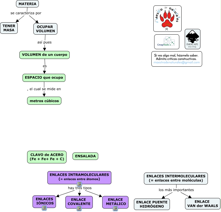 Este Cmap, tiene información relacionada con: 2.2 Volumen de la materia, VOLUMEN de un cuerpo es ESPACIO que ocupa, ESPACIO que ocupa , el cual se mide en metros cúbicos, ENLACES INTRAMOLECULARES (= enlaces entre átomos) hay tres tipos ENLACE METÁLICO, MATERIA se caracteriza por OCUPAR VOLUMEN, ENLACES INTRAMOLECULARES (= enlaces entre átomos) hay tres tipos ENLACE COVALENTE, OCUPAR VOLUMEN así pues VOLUMEN de un cuerpo, ENLACES INTERMOLECULARES (= enlaces entre moléculas) los más importantes ENLACE PUENTE HIDRÓGENO, MATERIA se caracteriza por TENER MASA, ENLACES INTRAMOLECULARES (= enlaces entre átomos) hay tres tipos ENLACES IÓNICOS, ENLACES INTERMOLECULARES (= enlaces entre moléculas) los más importantes ENLACE VAN der WAALS