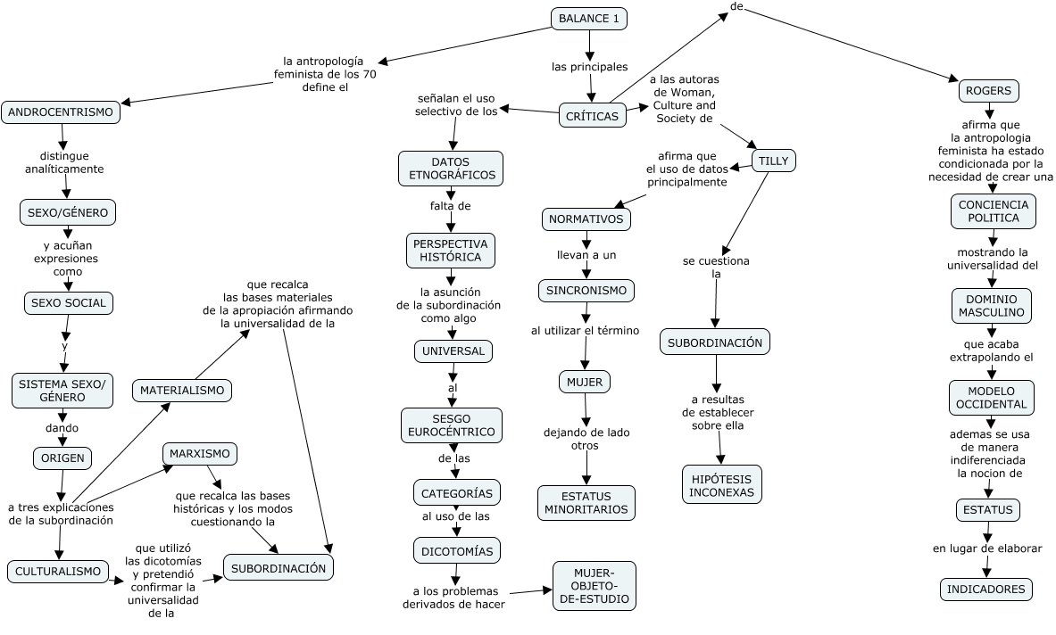 Este Cmap, tiene información relacionada con: C6 Balance 1, SISTEMA SEXO/ GÉNERO dando ORIGEN, MODELO OCCIDENTAL ademas se usa de manera indiferenciada la nocion de ESTATUS, ORIGEN a tres explicaciones de la subordinación CULTURALISMO, CRÍTICAS señalan el uso selectivo de los DATOS ETNOGRÁFICOS, DOMINIO MASCULINO que acaba extrapolando el MODELO OCCIDENTAL, ORIGEN a tres explicaciones de la subordinación MATERIALISMO, UNIVERSAL al SESGO EUROCÉNTRICO, CULTURALISMO que utilizó las dicotomías y pretendió confirmar la universalidad de la SUBORDINACIÓN, ORIGEN a tres explicaciones de la subordinación MARXISMO, DATOS ETNOGRÁFICOS falta de PERSPECTIVA HISTÓRICA, ESTATUS en lugar de elaborar INDICADORES, BALANCE 1 la antropología feminista de los 70 define el ANDROCENTRISMO, CONCIENCIA POLITICA mostrando la universalidad del DOMINIO MASCULINO, MATERIALISMO que recalca las bases materiales de la apropiación afirmando la universalidad de la SUBORDINACIÓN, TILLY se cuestiona la SUBORDINACIÓN, SINCRONISMO al utilizar el término MUJER, MUJER dejando de lado otros ESTATUS MINORITARIOS, SEXO SOCIAL y SISTEMA SEXO/ GÉNERO, SUBORDINACIÓN a resultas de establecer sobre ella HIPÓTESIS INCONEXAS, DICOTOMÍAS a los problemas derivados de hacer MUJER- OBJETO- DE-ESTUDIO