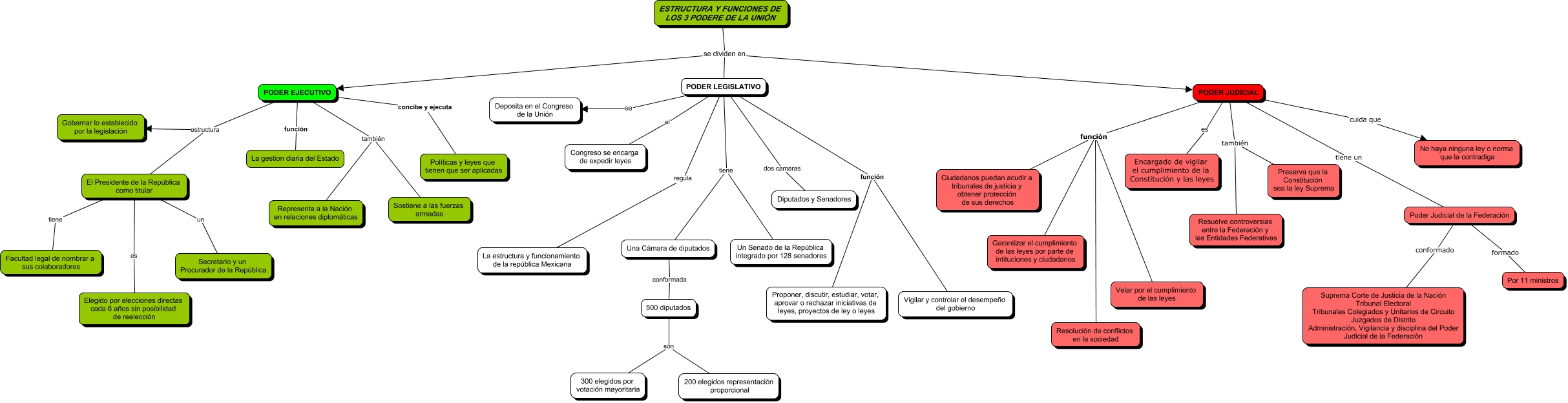 Este Cmap, tiene información relacionada con: ESTRUCTURA Y FUNCIONES DE LOS 3 PODERES DE LA UNIÓN, PODER EJECUTIVO también Sostiene a las fuerzas armadas, El Presidente de la República como titular un Secretario y un Procurador de la República, PODER LEGISLATIVO dos camaras Diputados y Senadores, PODER EJECUTIVO concibe y ejecuta Políticas y leyes que tienen que ser aplicadas, PODER LEGISLATIVO regula La estructura y funcionamiento de la república Mexicana, PODER EJECUTIVO también Representa a la Nación en relaciones diplomáticas, PODER JUDICIAL función Garantizar el cumplimiento de las leyes por parte de intituciones y ciudadanos, PODER JUDICIAL también Resuelve controversias entre la Federación y las Entidades Federativas, PODER JUDICIAL función Resolución de conflictos en la sociedad, PODER LEGISLATIVO se Deposita en el Congreso de la Unión, PODER LEGISLATIVO tiene Un Senado de la República integrado por 128 senadores, PODER EJECUTIVO función La gestion diaria del Estado, PODER JUDICIAL también Preserva que la Constitución sea la ley Suprema, PODER JUDICIAL función Velar por el cumplimiento de las leyes, PODER LEGISLATIVO función Proponer, discutir, estudiar, votar, aprovar o rechazar iniciativas de leyes, proyectos de ley o leyes, PODER JUDICIAL tiene un Poder Judicial de la Federación, Poder Judicial de la Federación conformado Suprema Corte de Justicia de la Nación Tribunal Electoral Tribunales Colegiados y Unitarios de Circuito Juzgados de Distrito Administración, Vigilancia y disciplina del Poder Judicial de la Federaciòn, ESTRUCTURA Y FUNCIONES DE LOS 3 PODERE DE LA UNIÓN se dividen en PODER LEGISLATIVO, 500 diputados son 200 elegidos representación proporcional, PODER LEGISLATIVO el Congreso se encarga de expedir leyes