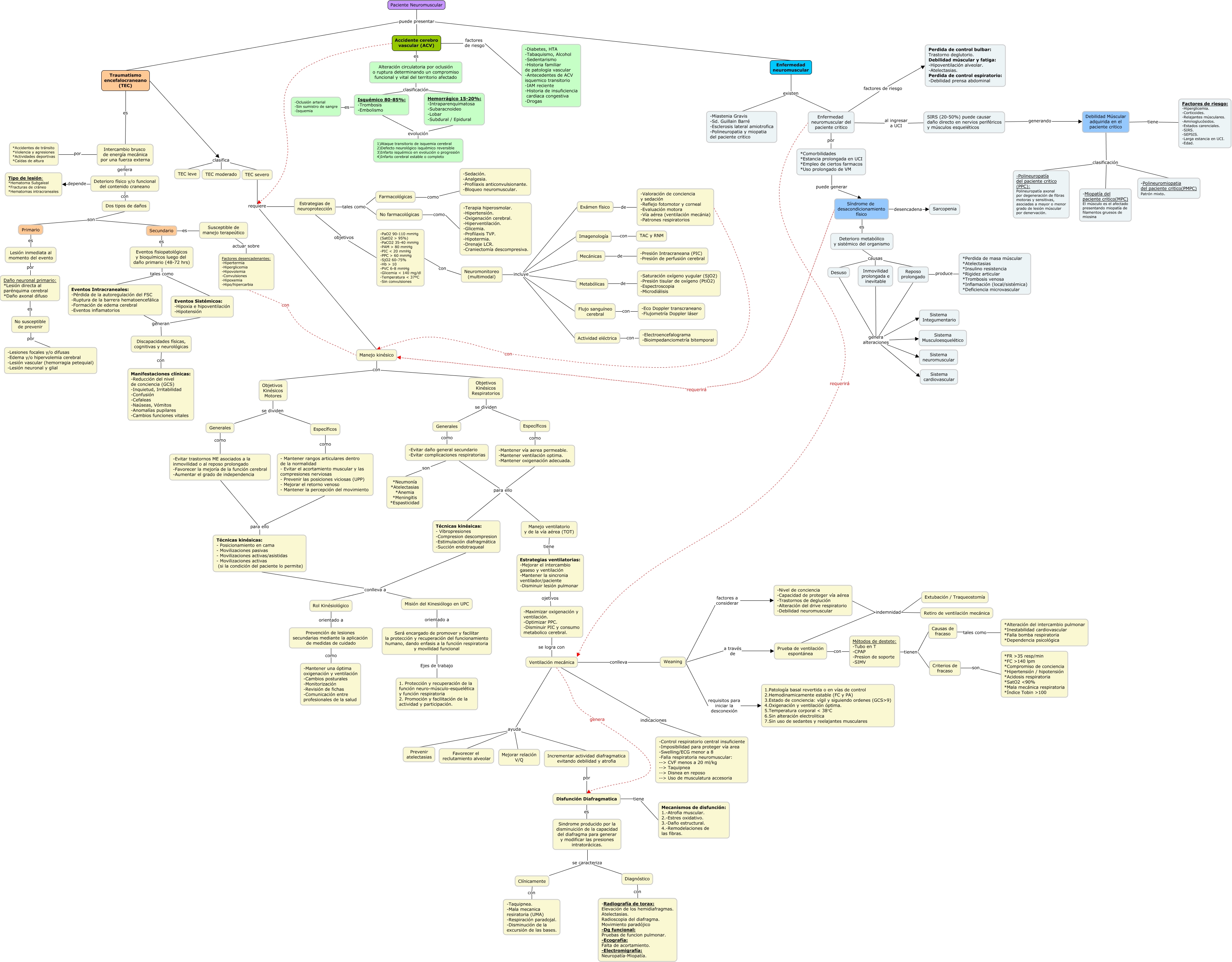 Este Cmap, tiene información relacionada con: Neuromuscular, TEC severo requiere Manejo kinésico, Criterios de fracaso son *FR ᡛ resp/min *FC lpm *Compromiso de conciencia *Hipertensión / hipotensión *Acidosis respiratoria *SatO2 ៊% *Mala mecánica respiratoria *Índice Tobin , Neuromonitoreo (multimodal) incluye Exámen físico, Métodos de destete: -Tubo en T -CPAP -Presion de soporte -SIMV tienen Criterios de fracaso, Paciente Neuromuscular puede presentar Accidente cerebro vascular (ACV), Isquémico 80-85%: -Trombosis -Embolismo es -Oclusión arterial -Sin sumistro de sangre -Isquemia, Dos tipos de daños son Primario, -Evitar daño general secundario -Evitar complicaciones respiratorias son *Neumonía *Atelectasias *Anemia *Meningitis *Espasticidad, Isquémico 80-85%: -Trombosis -Embolismo evolución Hemorrágico 15-20%: -Intraparenquimatosa -Subaracnoideo -Lobar -Subdural / Epidural, Enfermedad neuromuscular existen -Miastenia Gravis -Sd. Guillain Barré -Esclerosis lateral amiotrofica -Polineuropatia y miopatia del paciente critico, Weaning a través de Prueba de ventilación espontánea, Desuso genera alteraciones Sistema Musculoesquelético, Intercambio brusco de energía mecánica por una fuerza externa por *Accidentes de tránsito *Violencia y agresiones *Actividades deportivas *Caídas de altura, Debilidad Múscular adquirida en el paciente critico clasificación -Polineuromiopatia del paciente critico(PMPC) Patrón mixto., Disfunción Diafragmatica es Sindrome producido por la disminuición de la capacidad del diafragma para generar y modificar las presiones intratorácicas., -PaO2 90-110 mmHg (SatO2 > 95%) -PaCO2 35-40 mmHg -PAM > 80 mmHg -PIC < 20 mmHg -PPC > 60 mmHg -SjO2 60-75% -Hb > 10 -PVC 6-8 mmHg -Glicemia < 140 mg/dl -Temperatura < 37ºC -Sin convulsiones con Neuromonitoreo (multimodal), Deterioro físico y/o funcional del contenido craneano con Dos tipos de daños, -Maximizar oxigenación y ventilación. -Optimizar PPC. -Disminuir PIC y consumo metabolico cerebral. ojetivos Estrategias ventilatorias: -Mejorar el intercambio gaseso y ventilación -Mantener la sincronia ventilador/paciente -Disminuir lesión pulmonar, Paciente Neuromuscular puede presentar Enfermedad neuromuscular, Específicos como - Mantener rangos articulares dentro de la normalidad - Evitar el acortamiento muscular y las compresiones nerviosas - Prevenir las posiciones viciosas (UPP) - Mejorar el retorno venoso - Mantener la percepción del movimiento