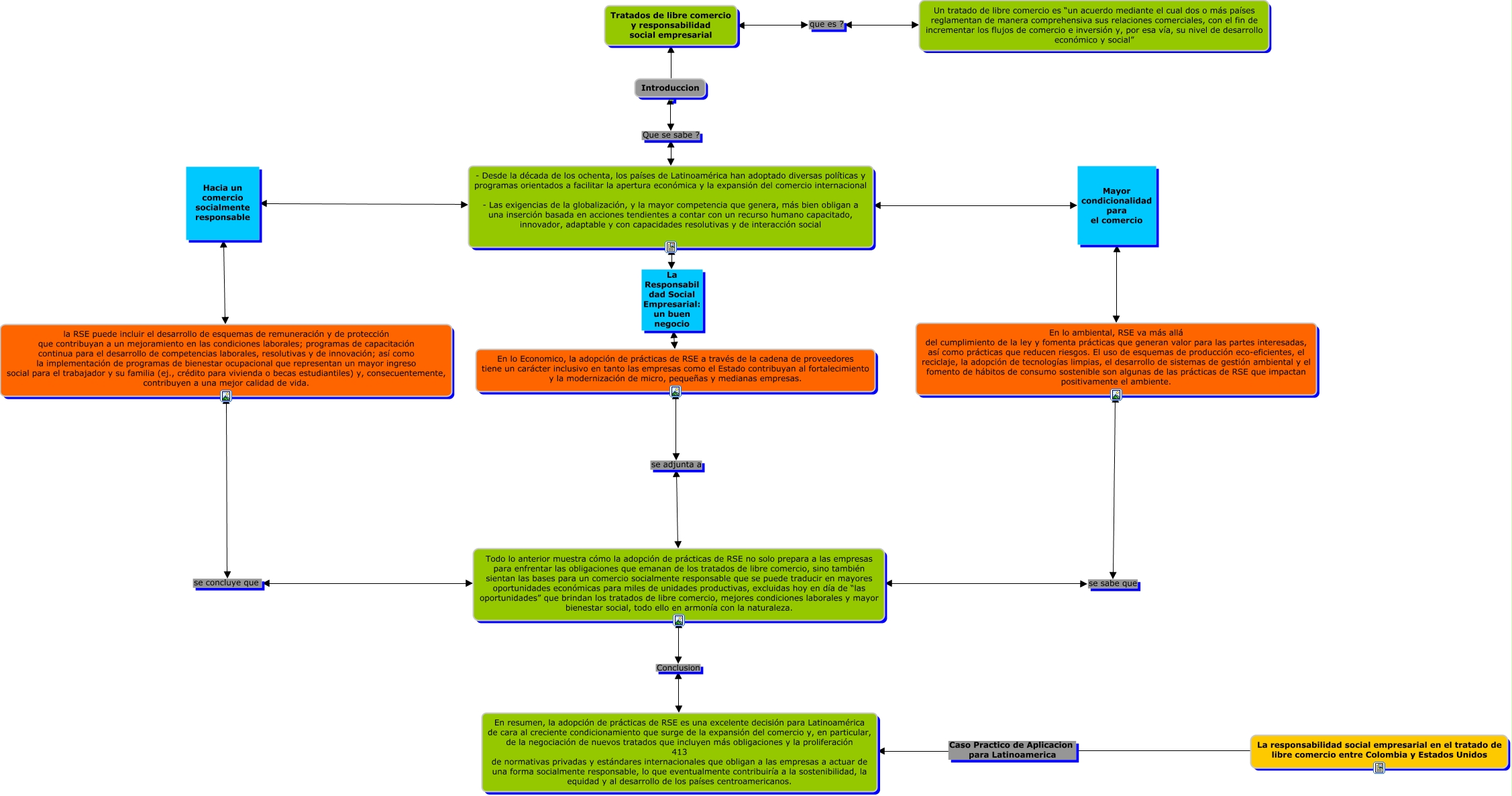 Dieses mit IHMC CmapTools erstellte CMap hat Informationen bezüglich: Resumen RSE en America Latina, - Desde la década de los ochenta, los países de Latinoamérica han adoptado diversas políticas y programas orientados a facilitar la apertura económica y la expansión del comercio internacional - Las exigencias de la globalización, y la mayor competencia que genera, más bien obligan a una inserción basada en acciones tendientes a contar con un recurso humano capacitado, innovador, adaptable y con capacidades resolutivas y de interacción social Mayor condicionalidad para el comercio En lo ambiental, RSE va más allá del cumplimiento de la ley y fomenta prácticas que generan valor para las partes interesadas, así como prácticas que reducen riesgos. El uso de esquemas de producción eco-eficientes, el reciclaje, la adopción de tecnologías limpias, el desarrollo de sistemas de gestión ambiental y el fomento de hábitos de consumo sostenible son algunas de las prácticas de RSE que impactan positivamente el ambiente., La responsabilidad social empresarial en el tratado de libre comercio entre Colombia y Estados Unidos Caso Practico de Aplicacion para Latinoamerica En resumen, la adopción de prácticas de RSE es una excelente decisión para Latinoamérica de cara al creciente condicionamiento que surge de la expansión del comercio y, en particular, de la negociación de nuevos tratados que incluyen más obligaciones y la proliferación 413 de normativas privadas y estándares internacionales que obligan a las empresas a actuar de una forma socialmente responsable, lo que eventualmente contribuiría a la sostenibilidad, la equidad y al desarrollo de los países centroamericanos., la RSE puede incluir el desarrollo de esquemas de remuneración y de protección que contribuyan a un mejoramiento en las condiciones laborales; programas de capacitación continua para el desarrollo de competencias laborales, resolutivas y de innovación; así como la implementación de programas de bienestar ocupacional que representan un mayor ingreso social para el trabajador y su familia (ej., crédito para vivienda o becas estudiantiles) y, consecuentemente, contribuyen a una mejor calidad de vida. se concluye que Todo lo anterior muestra cómo la adopción de prácticas de RSE no solo prepara a las empresas para enfrentar las obligaciones que emanan de los tratados de libre comercio, sino también sientan las bases para un comercio socialmente responsable que se puede traducir en mayores oportunidades económicas para miles de unidades productivas, excluidas hoy en día de “las oportunidades” que brindan los tratados de libre comercio, mejores condiciones laborales y mayor bienestar social, todo ello en armonía con la naturaleza., Tratados de libre comercio y responsabilidad social empresarial . Introduccion, la RSE puede incluir el desarrollo de esquemas de remuneración y de protección que contribuyan a un mejoramiento en las condiciones laborales; programas de capacitación continua para el desarrollo de competencias laborales, resolutivas y de innovación; así como la implementación de programas de bienestar ocupacional que representan un mayor ingreso social para el trabajador y su familia (ej., crédito para vivienda o becas estudiantiles) y, consecuentemente, contribuyen a una mejor calidad de vida. Hacia un comercio socialmente responsable - Desde la década de los ochenta, los países de Latinoamérica han adoptado diversas políticas y programas orientados a facilitar la apertura económica y la expansión del comercio internacional - Las exigencias de la globalización, y la mayor competencia que genera, más bien obligan a una inserción basada en acciones tendientes a contar con un recurso humano capacitado, innovador, adaptable y con capacidades resolutivas y de interacción social, Tratados de libre comercio y responsabilidad social empresarial que es ? Un tratado de libre comercio es “un acuerdo mediante el cual dos o más países reglamentan de manera comprehensiva sus relaciones comerciales, con el fin de incrementar los flujos de comercio e inversión y, por esa vía, su nivel de desarrollo económico y social”, En lo ambiental, RSE va más allá del cumplimiento de la ley y fomenta prácticas que generan valor para las partes interesadas, así como prácticas que reducen riesgos. El uso de esquemas de producción eco-eficientes, el reciclaje, la adopción de tecnologías limpias, el desarrollo de sistemas de gestión ambiental y el fomento de hábitos de consumo sostenible son algunas de las prácticas de RSE que impactan positivamente el ambiente. se sabe que Todo lo anterior muestra cómo la adopción de prácticas de RSE no solo prepara a las empresas para enfrentar las obligaciones que emanan de los tratados de libre comercio, sino también sientan las bases para un comercio socialmente responsable que se puede traducir en mayores oportunidades económicas para miles de unidades productivas, excluidas hoy en día de “las oportunidades” que brindan los tratados de libre comercio, mejores condiciones laborales y mayor bienestar social, todo ello en armonía con la naturaleza., - Desde la década de los ochenta, los países de Latinoamérica han adoptado diversas políticas y programas orientados a facilitar la apertura económica y la expansión del comercio internacional - Las exigencias de la globalización, y la mayor competencia que genera, más bien obligan a una inserción basada en acciones tendientes a contar con un recurso humano capacitado, innovador, adaptable y con capacidades resolutivas y de interacción social La Responsabilidad Social Empresarial: un buen negocio En lo Economico, la adopción de prácticas de RSE a través de la cadena de proveedores tiene un carácter inclusivo en tanto las empresas como el Estado contribuyan al fortalecimiento y la modernización de micro, pequeñas y medianas empresas., Todo lo anterior muestra cómo la a