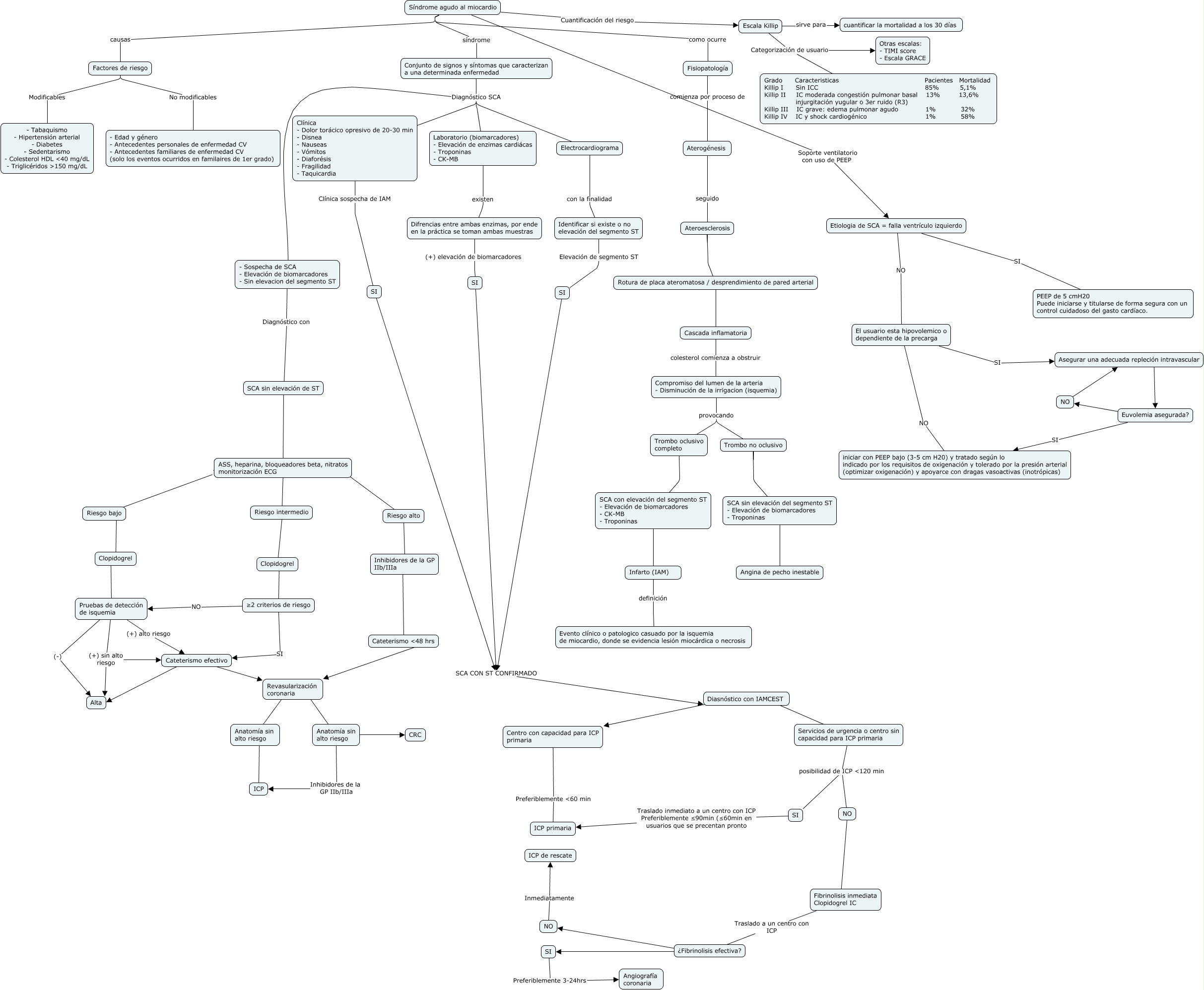 Este Cmap, tiene información relacionada con: SCA, - Sospecha de SCA - Elevación de biomarcadores - Sin elevacion del segmento ST Diagnóstico con SCA sin elevación de ST, NO ???? Asegurar una adecuada repleción intravascular, Factores de riesgo No modificables - Edad y género - Antecedentes personales de enfermedad CV - Antecedentes familiares de enfermedad CV (solo los eventos ocurridos en familaires de 1er grado), Síndrome agudo al miocardio causas Factores de riesgo, Factores de riesgo Modificables - Tabaquismo - Hipertensión arterial - Diabetes - Sedentarismo - Colesterol HDL ម mg/dL - Triglicéridos mg/dL, ASS, heparina, bloqueadores beta, nitratos monitorización ECG ???? Riesgo intermedio, SI Traslado inmediato a un centro con ICP Preferiblemente ≤90min (≤60min en usuarios que se precentan pronto ICP primaria, Trombo oclusivo completo ???? SCA con elevación del segmento ST - Elevación de biomarcadores - CK-MB - Troponinas, Cateterismo efectivo ???? Alta, Anatomía sin alto riesgo ???? CRC, SI Preferiblemente 3-24hrs Angiografía coronaria, ASS, heparina, bloqueadores beta, nitratos monitorización ECG ???? Riesgo bajo, SCA sin elevación de ST ???? ASS, heparina, bloqueadores beta, nitratos monitorización ECG, Trombo no oclusivo ???? SCA sin elevación del segmento ST - Elevación de biomarcadores - Troponinas, Riesgo intermedio ???? Clopidogrel, Servicios de urgencia o centro sin capacidad para ICP primaria posibilidad de ICP min NO, Escala Killip Categorización de usuario Otras escalas: - TIMI score - Escala GRACE, SI SCA CON ST CONFIRMADO Diasnóstico con IAMCEST, Cateterismo ហ hrs ???? Revasularización coronaria, Conjunto de signos y síntomas que caracterizan a una determinada enfermedad Diagnóstico SCA - Sospecha de SCA - Elevación de biomarcadores - Sin elevacion del segmento ST
