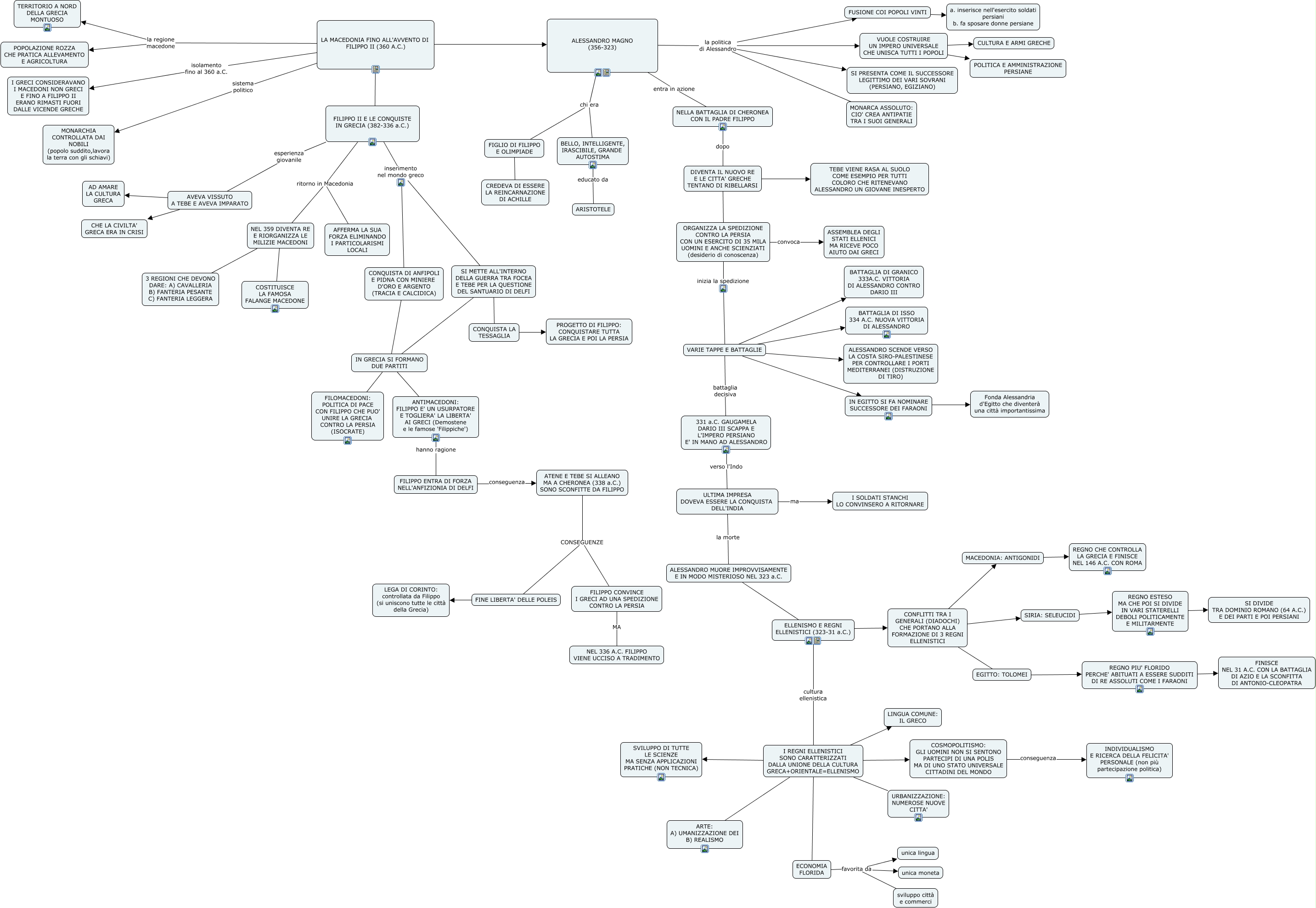 Questa Cmap, creata con IHMC CmapTools, contiene informazioni relative a: ALESSANDRO MAGNO ED ELLENISMO, SI METTE ALL'INTERNO DELLA GUERRA TRA FOCEA E TEBE PER LA QUESTIONE DEL SANTUARIO DI DELFI CONQUISTA LA TESSAGLIA, AVEVA VISSUTO A TEBE E AVEVA IMPARATO CHE LA CIVILTA' GRECA ERA IN CRISI, MACEDONIA: ANTIGONIDI REGNO CHE CONTROLLA LA GRECIA E FINISCE NEL 146 A.C. CON ROMA, AVEVA VISSUTO A TEBE E AVEVA IMPARATO AD AMARE LA CULTURA GRECA, FILIPPO II E LE CONQUISTE IN GRECIA (382-336 a.C.) inserimento nel mondo greco SI METTE ALL'INTERNO DELLA GUERRA TRA FOCEA E TEBE PER LA QUESTIONE DEL SANTUARIO DI DELFI, I REGNI ELLENISTICI SONO CARATTERIZZATI DALLA UNIONE DELLA CULTURA GRECA+ORIENTALE=ELLENISMO ECONOMIA FLORIDA, ALESSANDRO MAGNO (356-323) la politica di Alessandro VUOLE COSTRUIRE UN IMPERO UNIVERSALE CHE UNISCA TUTTI I POPOLI, ATENE E TEBE SI ALLEANO MA A CHERONEA (338 a.C.) SONO SCONFITTE DA FILIPPO CONSEGUENZE FILIPPO CONVINCE I GRECI AD UNA SPEDIZIONE CONTRO LA PERSIA, ANTIMACEDONI: FILIPPO E' UN USURPATORE E TOGLIERA' LA LIBERTA' AI GRECI (Demostene e le famose 'Filippiche') hanno ragione FILIPPO ENTRA DI FORZA NELL'ANFIZIONIA DI DELFI, FILIPPO II E LE CONQUISTE IN GRECIA (382-336 a.C.) esperienza giovanile AVEVA VISSUTO A TEBE E AVEVA IMPARATO, I REGNI ELLENISTICI SONO CARATTERIZZATI DALLA UNIONE DELLA CULTURA GRECA+ORIENTALE=ELLENISMO ARTE: A) UMANIZZAZIONE DEI B) REALISMO, ORGANIZZA LA SPEDIZIONE CONTRO LA PERSIA CON UN ESERCITO DI 35 MILA UOMINI E ANCHE SCIENZIATI (desiderio di conoscenza) inizia la spedizione VARIE TAPPE E BATTAGLIE, LA MACEDONIA FINO ALL'AVVENTO DI FILIPPO II (360 A.C.) isolamento fino al 360 a.C. I GRECI CONSIDERAVANO I MACEDONI NON GRECI E FINO A FILIPPO II ERANO RIMASTI FUORI DALLE VICENDE GRECHE, COSMOPOLITISMO: GLI UOMINI NON SI SENTONO PARTECIPI DI UNA POLIS MA DI UNO STATO UNIVERSALE CITTADINI DEL MONDO conseguenza INDIVIDUALISMO E RICERCA DELLA FELICITA' PERSONALE (non più partecipazione politica), CONQUISTA DI ANFIPOLI E PIDNA CON MINIERE D'ORO E ARGENTO (TRACIA E CALCIDICA) IN GRECIA SI FORMANO DUE PARTITI, NEL 359 DIVENTA RE E RIORGANIZZA LE MILIZIE MACEDONI 3 REGIONI CHE DEVONO DARE: A) CAVALLERIA B) FANTERIA PESANTE C) FANTERIA LEGGERA, VUOLE COSTRUIRE UN IMPERO UNIVERSALE CHE UNISCA TUTTI I POPOLI CULTURA E ARMI GRECHE, ELLENISMO E REGNI ELLENISTICI (323-31 a.C.) CONFLITTI TRA I GENERALI (DIADOCHI) CHE PORTANO ALLA FORMAZIONE DI 3 REGNI ELLENISTICI, ATENE E TEBE SI ALLEANO MA A CHERONEA (338 a.C.) SONO SCONFITTE DA FILIPPO CONSEGUENZE FINE LIBERTA' DELLE POLEIS, LA MACEDONIA FINO ALL'AVVENTO DI FILIPPO II (360 A.C.) sistema politico MONARCHIA CONTROLLATA DAI NOBILI (popolo suddito,lavora la terra con gli schiavi)