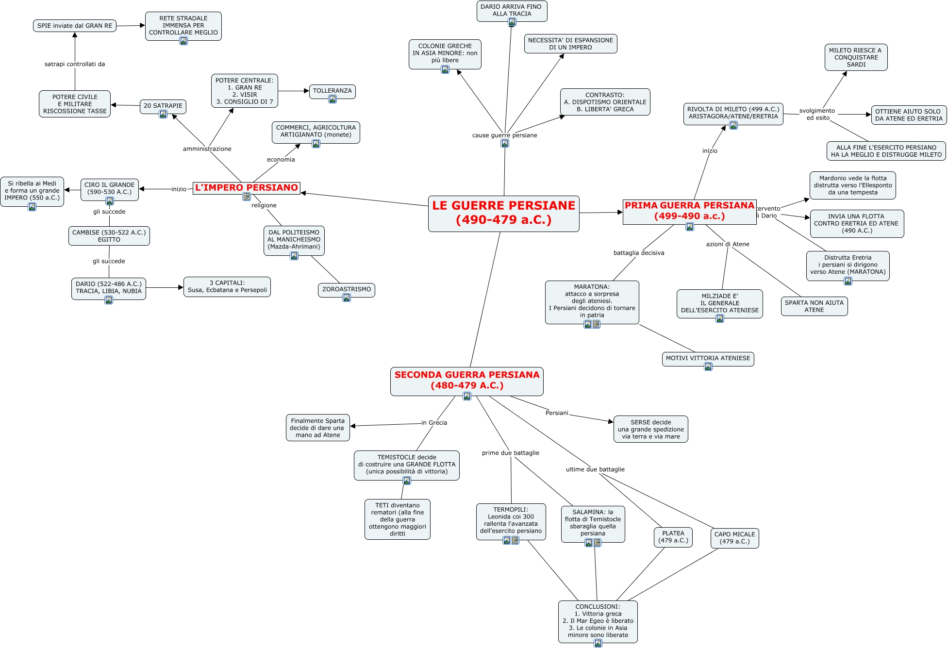 Questa Cmap, creata con IHMC CmapTools, contiene informazioni relative a: LE GUERRE PERSIANE, SECONDA GUERRA PERSIANA (480-479 A.C.) prime due battaglie TERMOPILI: Leonida coi 300 rallenta l'avanzata dell'esercito persiano, SECONDA GUERRA PERSIANA (480-479 A.C.) ultime due battaglie PLATEA (479 a.C.), PRIMA GUERRA PERSIANA (499-490 a.c.) azioni di Atene MILZIADE E' IL GENERALE DELL'ESERCITO ATENIESE, SECONDA GUERRA PERSIANA (480-479 A.C.) prime due battaglie SALAMINA: la flotta di Temistocle sbaraglia quella persiana, PRIMA GUERRA PERSIANA (499-490 a.c.) inizio RIVOLTA DI MILETO (499 A.C.) ARISTAGORA/ATENE/ERETRIA, DAL POLITEISMO AL MANICHEISMO (Mazda-Ahrimani) ZOROASTRISMO, LE GUERRE PERSIANE (490-479 a.C.) SECONDA GUERRA PERSIANA (480-479 A.C.), LE GUERRE PERSIANE (490-479 a.C.) cause guerre persiane CONTRASTO: A. DISPOTISMO ORIENTALE B. LIBERTA' GRECA, LE GUERRE PERSIANE (490-479 a.C.) L'IMPERO PERSIANO, PRIMA GUERRA PERSIANA (499-490 a.c.) battaglia decisiva MARATONA: attacco a sorpresa degli ateniesi. I Persiani decidono di tornare in patria, L'IMPERO PERSIANO amministrazione POTERE CENTRALE: 1. GRAN RE 2. VISIR 3. CONSIGLIO DI 7, 20 SATRAPIE POTERE CIVILE E MILITARE RISCOSSIONE TASSE, RIVOLTA DI MILETO (499 A.C.) ARISTAGORA/ATENE/ERETRIA svolgimento ed esito MILETO RIESCE A CONQUISTARE SARDI, LE GUERRE PERSIANE (490-479 a.C.) cause guerre persiane COLONIE GRECHE IN ASIA MINORE: non più libere, CIRO IL GRANDE (590-530 A.C.) gli succede CAMBISE (530-522 A.C.) EGITTO, SECONDA GUERRA PERSIANA (480-479 A.C.) in Grecia Finalmente Sparta decide di dare una mano ad Atene, L'IMPERO PERSIANO amministrazione 20 SATRAPIE, CIRO IL GRANDE (590-530 A.C.) Si ribella ai Medi e forma un grande IMPERO (550 a.C.), SPIE inviate dal GRAN RE RETE STRADALE IMMENSA PER CONTROLLARE MEGLIO, TEMISTOCLE decide di costruire una GRANDE FLOTTA (unica possibilità di vittoria) TETI diventano rematori (alla fine della guerra ottengono maggiori diritti