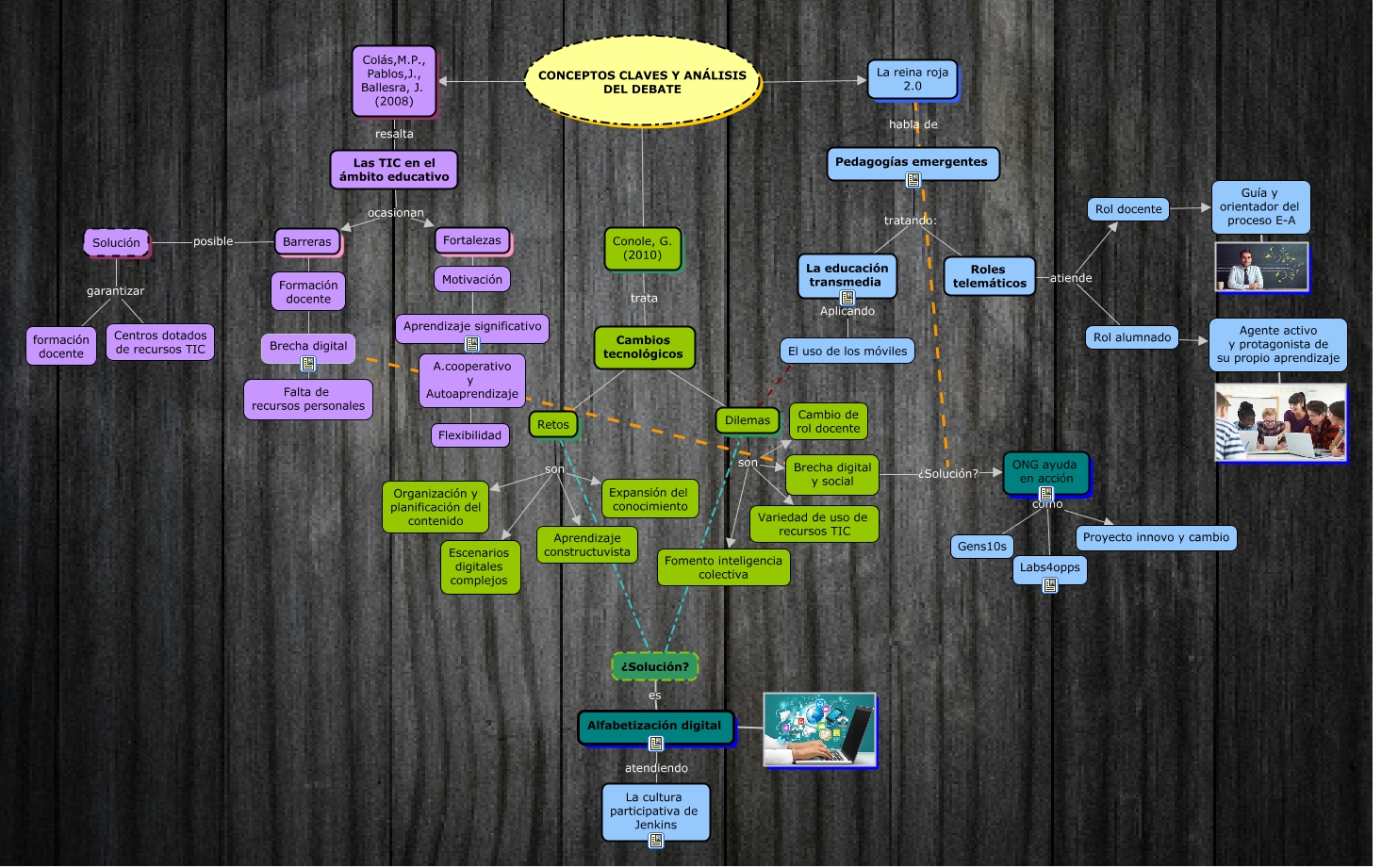 Este Cmap, tiene información relacionada con: debate, Dilemas son Cambio de rol docente, Brecha digital ???? Brecha digital y social, Retos ???? ¿Solución?, Alfabetización digital atendiendo La cultura participativa de Jenkins, Rol docente ???? Guía y orientador del proceso E-A, Retos son Escenarios digitales complejos, La reina roja 2.0 habla de Pedagogías emergentes, Retos son Expansión del conocimiento, Solución garantizar formación docente, ONG ayuda en acción como Gens10s, Rol alumnado ???? Agente activo y protagonista de su propio aprendizaje, Conole, G. (2010) trata Cambios tecnológicos, La reina roja 2.0 ¿Solución? ONG ayuda en acción, ¿Solución? es Alfabetización digital, Brecha digital y social ¿Solución? ONG ayuda en acción, Retos son Aprendizaje constructuvista, Dilemas son Brecha digital y social, Las TIC en el ámbito educativo ocasionan Barreras, La educación transmedia Aplicando El uso de los móviles, ONG ayuda en acción como Labs4opps