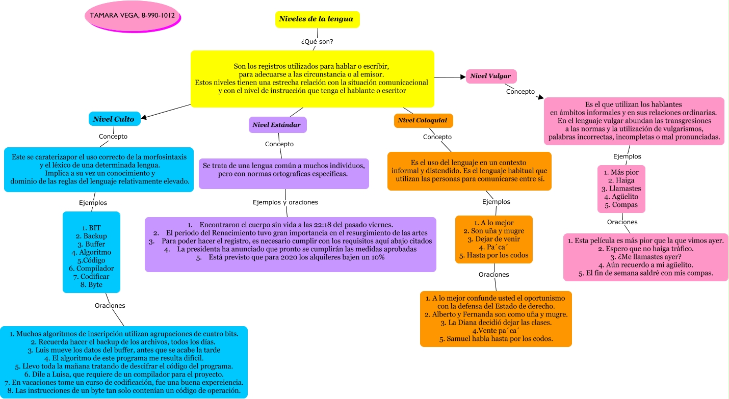 Este Cmap, tiene información relacionada con: Niveles de la lengua, Tamara Vega, 8-990-1012, Son los registros utilizados para hablar o escribir, para adecuarse a las circunstancia o al emisor. Estos niveles tienen una estrecha relación con la situación comunicacional y con el nivel de instrucción que tenga el hablante o escritor ???? Nivel Estándar, Este se caraterizapor el uso correcto de la morfosintaxis y el léxico de una determinada lengua. Implica a su vez un conocimiento y dominio de las reglas del lenguaje relativamente elevado. Ejemplos 1. BIT 2. Backup 3. Buffer 4. Algoritmo 5.Código 6. Compilador 7. Codificar 8. Byte, Es el que utilizan los hablantes en ámbitos informales y en sus relaciones ordinarias. En el lenguaje vulgar abundan las transgresiones a las normas y la utilización de vulgarismos, palabras incorrectas, incompletas o mal pronunciadas. Ejemplos 1. Más pior 2. Haiga 3. Llamastes 4. Agüelito 5. Compas, 1. BIT 2. Backup 3. Buffer 4. Algoritmo 5.Código 6. Compilador 7. Codificar 8. Byte Oraciones 1. Muchos algoritmos de inscripción utilizan agrupaciones de cuatro bits. 2. Recuerda hacer el backup de los archivos, todos los días. 3. Luis mueve los datos del buffer, antes que se acabe la tarde 4. El algoritmo de este programa me resulta difícil. 5. Llevo toda la mañana tratando de descifrar el código del programa. 6. Dile a Luisa, que requiere de un compilador para el proyecto. 7. En vacaciones tome un curso de codificación, fue una buena expereiencia. 8. Las instrucciones de un byte tan solo contenían un código de operación., Son los registros utilizados para hablar o escribir, para adecuarse a las circunstancia o al emisor. Estos niveles tienen una estrecha relación con la situación comunicacional y con el nivel de instrucción que tenga el hablante o escritor ???? Nivel Coloquial, Nivel Coloquial Concepto Es el uso del lenguaje en un contexto informal y distendido. Es el lenguaje habitual que utilizan las personas para comunicarse entre sí., Se trata de una lengua común a muchos individuos, pero con normas ortograficas específicas. Ejemplos y oraciones 1. Encontraron el cuerpo sin vida a las 22:18 del pasado viernes. 2. El periodo del Renacimiento tuvo gran importancia en el resurgimiento de las artes 3. Para poder hacer el registro, es necesario cumplir con los requisitos aquí abajo citados 4. La presidenta ha anunciado que pronto se cumplirán las medidas aprobadas 5. Está previsto que para 2020 los alquileres bajen un 10%, Es el uso del lenguaje en un contexto informal y distendido. Es el lenguaje habitual que utilizan las personas para comunicarse entre sí. Ejemplos 1. A lo mejor 2. Son uña y mugre 3. Dejar de venir 4. Pa´ca´ 5. Hasta por los codos, Niveles de la lengua ¿Qué son? Son los registros utilizados para hablar o escribir, para adecuarse a las circunstancia o al emisor. Estos niveles tienen una estrecha relación con la situación comunicacional y con el nivel de instrucción que tenga el hablante o escritor, Nivel Vulgar Concepto Es el que utilizan los hablantes en ámbitos informales y en sus relaciones ordinarias. En el lenguaje vulgar abundan las transgresiones a las normas y la utilización de vulgarismos, palabras incorrectas, incompletas o mal pronunciadas., Nivel Culto Concepto Este se caraterizapor el uso correcto de la morfosintaxis y el léxico de una determinada lengua. Implica a su vez un conocimiento y dominio de las reglas del lenguaje relativamente elevado., Son los registros utilizados para hablar o escribir, para adecuarse a las circunstancia o al emisor. Estos niveles tienen una estrecha relación con la situación comunicacional y con el nivel de instrucción que tenga el hablante o escritor ¿Cuáles son? Nivel Culto, 1. Más pior 2. Haiga 3. Llamastes 4. Agüelito 5. Compas Oraciones 1. Esta película es más pior que la que vimos ayer. 2. Espero que no haiga tráfico. 3. ¿Me llamastes ayer? 4. Aún recuerdo a mi agüelito. 5. El fin de semana saldré con mis compas., Son los registros utilizados para hablar o escribir, para adecuarse a las circunstancia o al emisor. Estos niveles tienen una estrecha relación con la situación comunicacional y con el nivel de instrucción que tenga el hablante o escritor ???? Nivel Vulgar, Nivel Estándar Concepto Se trata de una lengua común a muchos individuos, pero con normas ortograficas específicas., 1. A lo mejor 2. Son uña y mugre 3. Dejar de venir 4. Pa´ca´ 5. Hasta por los codos Oraciones 1. A lo mejor confunde usted el oportunismo con la defensa del Estado de derecho. 2. Alberto y Fernanda son como uña y mugre. 3. La Diana decidió dejar las clases. 4.Vente pa´ca´ 5. Samuel habla hasta por los codos.