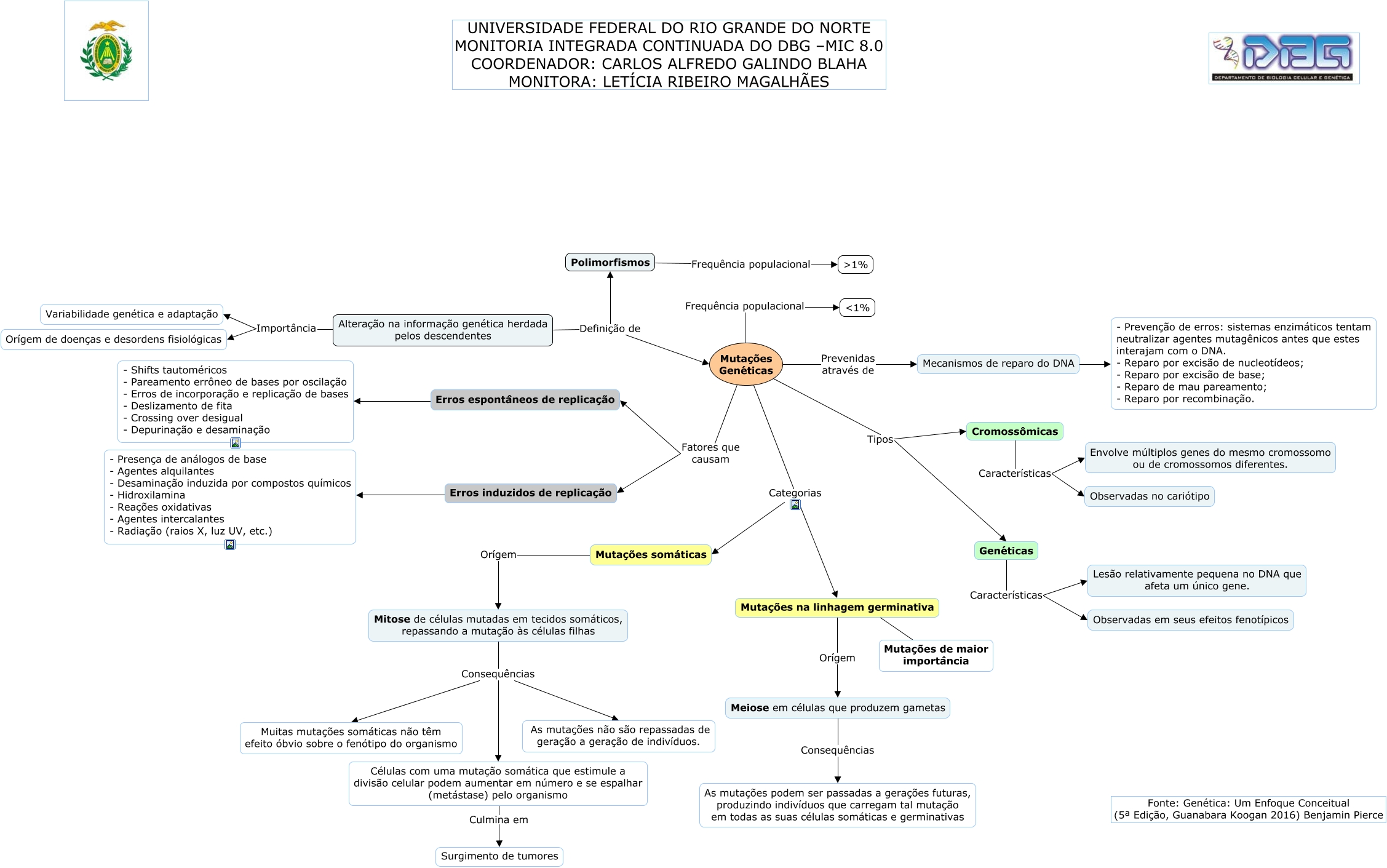 Esse mapa conceitual, produzido no IHMC CmapTools, tem a informação relacionada a: Mutações genéticas, Erros induzidos de replicação ???? - Presença de análogos de base - Agentes alquilantes - Desaminação induzida por compostos químicos - Hidroxilamina - Reações oxidativas - Agentes intercalantes - Radiação (raios X, luz UV, etc.), Mutações Genéticas Fatores que causam Erros espontâneos de replicação, Mutações Genéticas Categorias Mutações na linhagem germinativa, Meiose em células que produzem gametas Consequências As mutações podem ser passadas a gerações futuras, produzindo indivíduos que carregam tal mutação em todas as suas células somáticas e germinativas, Erros espontâneos de replicação ???? - Shifts tautoméricos - Pareamento errôneo de bases por oscilação - Erros de incorporação e replicação de bases - Deslizamento de fita - Crossing over desigual - Depurinação e desaminação, Cromossômicas Características Observadas no cariótipo, Mutações Genéticas Tipos Cromossômicas, Mutações na linhagem germinativa Orígem Meiose em células que produzem gametas, Alteração na informação genética herdada pelos descendentes Definição de Polimorfismos, Mitose de células mutadas em tecidos somáticos, repassando a mutação às células filhas Consequências As mutações não são repassadas de geração a geração de indivíduos., Mitose de células mutadas em tecidos somáticos, repassando a mutação às células filhas Consequências Muitas mutações somáticas não têm efeito óbvio sobre o fenótipo do organismo, Células com uma mutação somática que estimule a divisão celular podem aumentar em número e se espalhar (metástase) pelo organismo Culmina em Surgimento de tumores, Alteração na informação genética herdada pelos descendentes Definição de Mutações Genéticas, Alteração na informação genética herdada pelos descendentes Importância Orígem de doenças e desordens fisiológicas, Alteração na informação genética herdada pelos descendentes Importância Variabilidade genética e adaptação, Mutações Genéticas Tipos Genéticas, Mitose de células mutadas em tecidos somáticos, repassando a mutação às células filhas Consequências Células com uma mutação somática que estimule a divisão celular podem aumentar em número e se espalhar (metástase) pelo organismo, Mutações Genéticas Categorias Mutações somáticas, Mutações somáticas Orígem Mitose de células mutadas em tecidos somáticos, repassando a mutação às células filhas, Genéticas Características Observadas em seus efeitos fenotípicos
