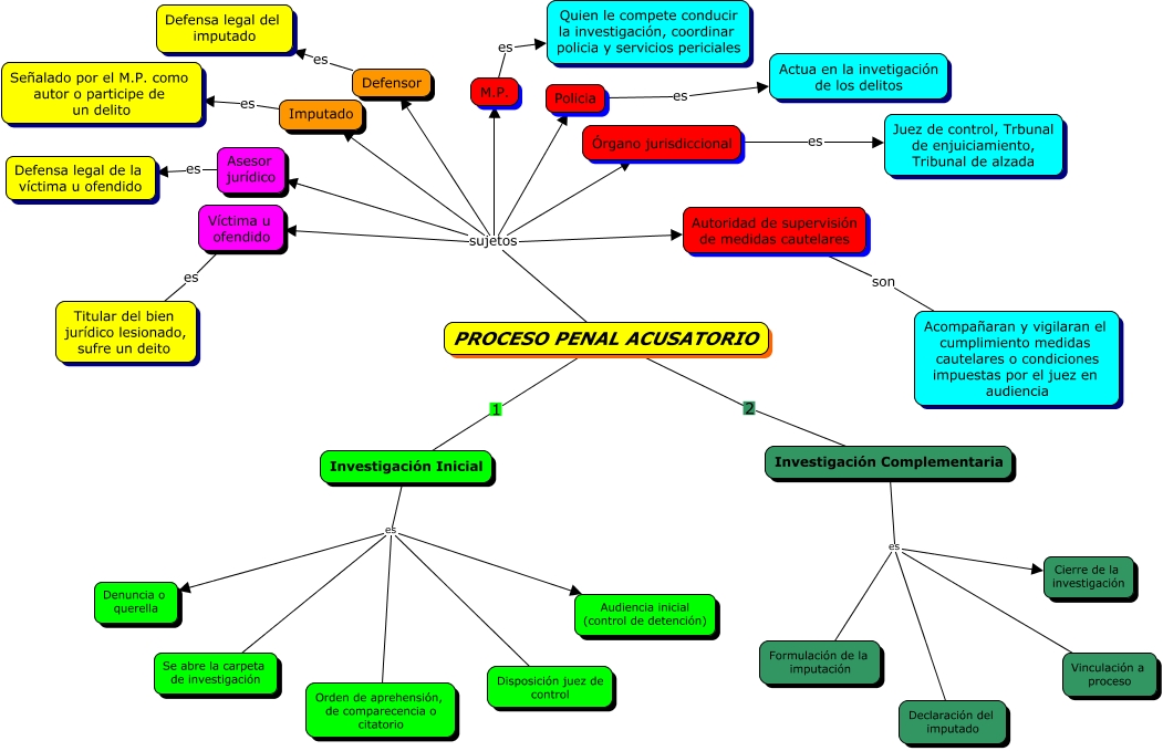 Este Cmap, tiene información relacionada con: PROCESO PENAL ACUSATORIO, Investigación Complementaria es Vinculación a proceso, Defensor es Defensa legal del imputado, PROCESO PENAL ACUSATORIO sujetos Policia, Investigación Complementaria es Declaración del imputado, PROCESO PENAL ACUSATORIO sujetos M.P., PROCESO PENAL ACUSATORIO 1 Investigación Inicial, Imputado es Señalado por el M.P. como autor o participe de un delito, Investigación Inicial es Se abre la carpeta de investigación, Autoridad de supervisión de medidas cautelares son Acompañaran y vigilaran el cumplimiento medidas cautelares o condiciones impuestas por el juez en audiencia, Policia es Actua en la invetigación de los delitos, PROCESO PENAL ACUSATORIO 2 Investigación Complementaria, PROCESO PENAL ACUSATORIO sujetos Defensor, PROCESO PENAL ACUSATORIO sujetos Imputado, Investigación Inicial es Denuncia o querella, Órgano jurisdiccional es Juez de control, Trbunal de enjuiciamiento, Tribunal de alzada, Investigación Complementaria es Cierre de la investigación, Asesor jurídico es Defensa legal de la víctima u ofendido, PROCESO PENAL ACUSATORIO sujetos Autoridad de supervisión de medidas cautelares, M.P. es Quien le compete conducir la investigación, coordinar policia y servicios periciales, Investigación Inicial es Audiencia inicial (control de detención)