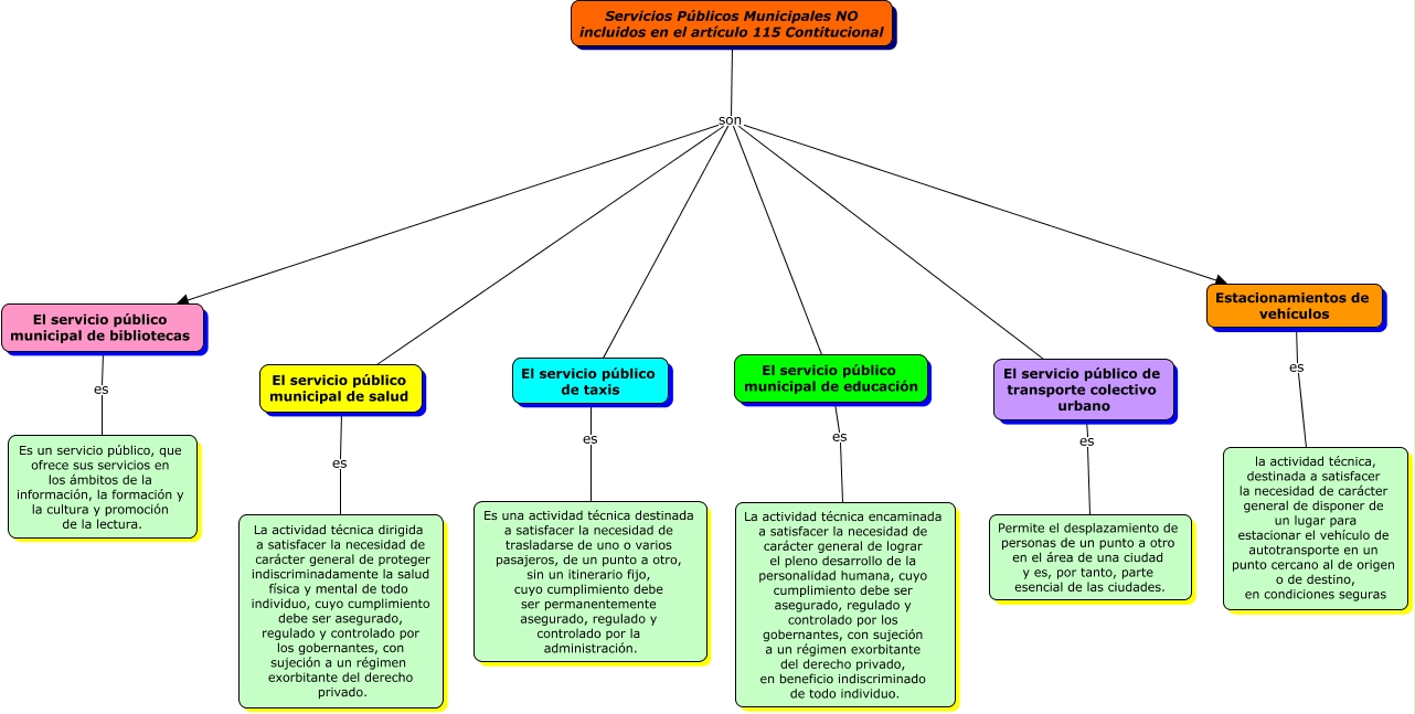 Este Cmap, tiene información relacionada con: Servicios Públicos Municipales NO incluidos, Servicios Públicos Municipales NO incluidos en el artículo 115 Contitucional son Estacionamientos de vehículos, El servicio público municipal de salud es La actividad técnica dirigida a satisfacer la necesidad de carácter general de proteger indiscriminadamente la salud física y mental de todo individuo, cuyo cumplimiento debe ser asegurado, regulado y controlado por los gobernantes, con sujeción a un régimen exorbitante del derecho privado., Servicios Públicos Municipales NO incluidos en el artículo 115 Contitucional son El servicio público municipal de educación, Estacionamientos de vehículos es la actividad técnica, destinada a satisfacer la necesidad de carácter general de disponer de un lugar para estacionar el vehículo de autotransporte en un punto cercano al de origen o de destino, en condiciones seguras, El servicio público municipal de educación es La actividad técnica encaminada a satisfacer la necesidad de carácter general de lograr el pleno desarrollo de la personalidad humana, cuyo cumplimiento debe ser asegurado, regulado y controlado por los gobernantes, con sujeción a un régimen exorbitante del derecho privado, en beneficio indiscriminado de todo individuo., Servicios Públicos Municipales NO incluidos en el artículo 115 Contitucional son El servicio público municipal de salud, Servicios Públicos Municipales NO incluidos en el artículo 115 Contitucional son El servicio público municipal de bibliotecas, Servicios Públicos Municipales NO incluidos en el artículo 115 Contitucional son El servicio público de transporte colectivo urbano, El servicio público de transporte colectivo urbano es Permite el desplazamiento de personas de un punto a otro en el área de una ciudad y es, por tanto, parte esencial de las ciudades., Servicios Públicos Municipales NO incluidos en el artículo 115 Contitucional son El servicio público de taxis, El servicio público de taxis es Es una actividad técnica destinada a satisfacer la necesidad de trasladarse de uno o varios pasajeros, de un punto a otro, sin un itinerario fijo, cuyo cumplimiento debe ser permanentemente asegurado, regulado y controlado por la administración., El servicio público municipal de bibliotecas es Es un servicio público, que ofrece sus servicios en los ámbitos de la información, la formación y la cultura y promoción de la lectura.