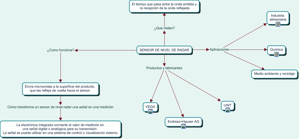 Este Cmap, tiene información relacionada con: Sensores de nivel de radar, SENSOR DE NIVEL DE RADAR Productos y fabricantes VEGA, SENSOR DE NIVEL DE RADAR Aplicaciones Industria alimentaria, Envía microondas a la superficie del producto, que las refleja de vuelta hacia el sensor. Cómo transforma un sensor de nivel radar una señal en una medición La electrónica integrada convierte el valor de medición en una señal digital o analógica para su transmisión. La señal se puede utilizar en una sistema de control o visualización externo., SENSOR DE NIVEL DE RADAR Aplicaciones Medio ambiente y reciclaje, SENSOR DE NIVEL DE RADAR Productos y fabricantes Endress+Hauser AG, SENSOR DE NIVEL DE RADAR Productos y fabricantes UWT, SENSOR DE NIVEL DE RADAR ¿Qué miden? El tiempo que pasa entre la onda emitida y la recepción de la onda reflejada, SENSOR DE NIVEL DE RADAR Aplicaciones Química, SENSOR DE NIVEL DE RADAR ¿Como funciona? Envía microondas a la superficie del producto, que las refleja de vuelta hacia el sensor.