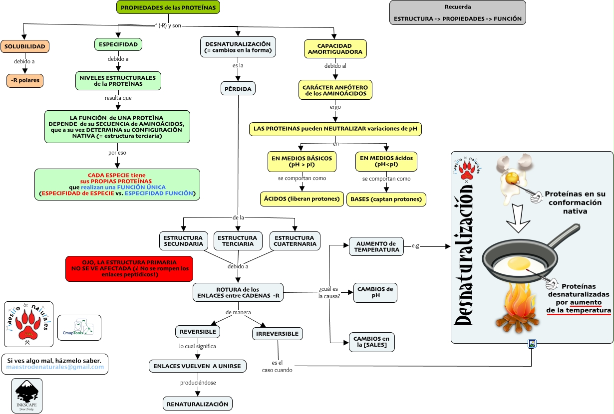 Este Cmap, tiene información relacionada con: Tema 03.05 Propiedades de las proteínas, LAS PROTEINAS pueden NEUTRALIZAR variaciones de pH en EN MEDIOS BÁSICOS (pH > pI), IRREVERSIBLE es el caso cuando, PÉRDIDA de la ESTRUCTURA SECUNDARIA, PROPIEDADES de las PROTEÍNAS f (-R) y son ESPECIFIDAD, ESTRUCTURA TERCIARIA debido a ROTURA de los ENLACES entre CADENAS -R, ENLACES VUELVEN A UNIRSE produciéndose RENATURALIZACIÓN, NIVELES ESTRUCTURALES de la PROTEÍNAS resulta que LA FUNCIÓN de UNA PROTEÍNA DEPENDE de su SECUENCIA de AMINOÁCIDOS, que a su vez DETERMINA su CONFIGURACIÓN NATIVA (= estructura terciaria), PROPIEDADES de las PROTEÍNAS f (-R) y son CAPACIDAD AMORTIGUADORA, CAPACIDAD AMORTIGUADORA debido al CARÁCTER ANFÓTERO de los AMINOÁCIDOS, ROTURA de los ENLACES entre CADENAS -R de manera REVERSIBLE, ROTURA de los ENLACES entre CADENAS -R ¿cuál es la causa? CAMBIOS en la [SALES], ROTURA de los ENLACES entre CADENAS -R ¿cuál es la causa? AUMENTO de TEMPERATURA, PÉRDIDA de la ESTRUCTURA TERCIARIA, REVERSIBLE lo cual significa ENLACES VUELVEN A UNIRSE, AUMENTO de TEMPERATURA e.g, SOLUBILIDAD debido a -R polares, EN MEDIOS ácidos (pH<pI) se comportan como BASES (captan protones), CARÁCTER ANFÓTERO de los AMINOÁCIDOS ergo LAS PROTEINAS pueden NEUTRALIZAR variaciones de pH, LA FUNCIÓN de UNA PROTEÍNA DEPENDE de su SECUENCIA de AMINOÁCIDOS, que a su vez DETERMINA su CONFIGURACIÓN NATIVA (= estructura terciaria) por eso CADA ESPECIE tiene sus PROPIAS PROTEÍNAS que realizan una FUNCIÓN ÚNICA (ESPECIFIDAD de ESPECIE vs. ESPECIFIDAD FUNCIÓN), LAS PROTEINAS pueden NEUTRALIZAR variaciones de pH en EN MEDIOS ácidos (pH<pI)