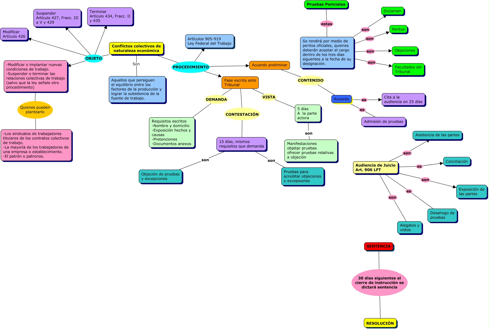 Este Cmap, tiene información relacionada con: Conflictos colectivos de naturaleza económica, Acuerdo es Admisión de pruebas, Se rendirá por medio de peritos oficiales, quienes deberán aceptar el cargo dentro de los tres días siguentes a la fecha de su designación. son Peritos, Se rendirá por medio de peritos oficiales, quienes deberán aceptar el cargo dentro de los tres días siguentes a la fecha de su designación. son Dictamen, Conflictos colectivos de naturaleza económica OBJETO Terminar Artículo 434, Fracc. II y 435, Conflictos colectivos de naturaleza económica OBJETO Modificar Artículo 426, Se rendirá por medio de peritos oficiales, quienes deberán aceptar el cargo dentro de los tres días siguentes a la fecha de su designación. son Facultades del Tribunal, Pruebas Periciales estas Se rendirá por medio de peritos oficiales, quienes deberán aceptar el cargo dentro de los tres días siguentes a la fecha de su designación., 15 días, mismos requisitos que demanda son Objeción de pruebas y excepciones, Fase escrita ante Tribunal DEMANDA Requisitos escritos -Nombre y domicilio -Exposición hechos y causas -Pretenciones -Documentos anexos, Conflictos colectivos de naturaleza económica PROCEDIMIENTO Artículos 905-919 Ley Federal del Trabajo, Conflictos colectivos de naturaleza económica OBJETO Suspender Artículo 427, Fracc. III a V y 429, SENTENCIA 30 días siguientes al cierre de instrucción se dictará sentencia RESOLUCIÓN, Fase escrita ante Tribunal VISTA 5 días A la parte actora, Audiencia de Juicio Art. 906 LFT son Alegatos y vistos, Acuerdo preliminar CONTENIDO Acuerdo, Audiencia de Juicio Art. 906 LFT es Desahogo de pruebas, Audiencia de Juicio Art. 906 LFT son Asistencia de las partes, Conflictos colectivos de naturaleza económica Son Aquellos que persiguen el equilibrio entre los factores de la producción y lograr la subsitencia de la fuente de trabajo., Se rendirá por medio de peritos oficiales, quienes deberán aceptar el cargo dentro de los tres días siguentes a la fecha de su designación. son Objeciones, Acuerdo es Cita a la audiencia en 25 días