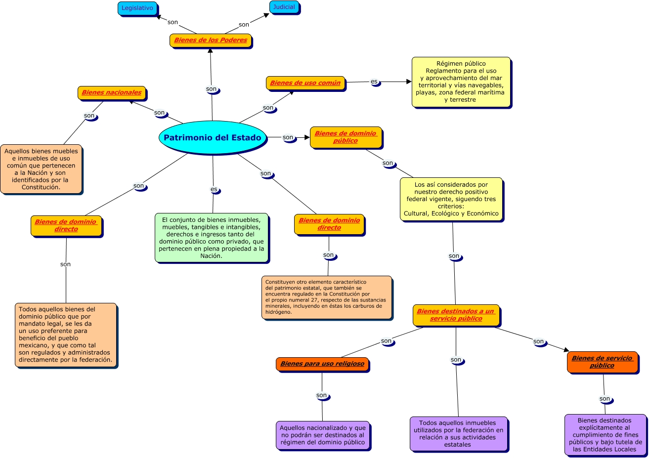 Este Cmap, tiene información relacionada con: Patrimonio del Estado, Patrimonio del Estado son Bienes de los Poderes, Patrimonio del Estado son Bienes de dominio directo, Bienes nacionales son Aquellos bienes muebles e inmuebles de uso común que pertenecen a la Nación y son identificados por la Constitución., Bienes de dominio directo son Constituyen otro elemento característico del patrimonio estatal, que también se encuentra regulado en la Constitución por el propio numeral 27, respecto de las sustancias minerales, incluyendo en éstas los carburos de hidrógeno., Bienes destinados a un servicio público son Bienes de servicio público, Patrimonio del Estado son Bienes nacionales, Los así considerados por nuestro derecho positivo federal vigente, siguendo tres criterios: Cultural, Ecológico y Económico son Bienes destinados a un servicio público, Bienes de los Poderes son Judicial, Bienes de dominio público son Los así considerados por nuestro derecho positivo federal vigente, siguendo tres criterios: Cultural, Ecológico y Económico, Bienes de servicio público son Bienes destinados explícitamente al cumplimiento de fines públicos y bajo tutela de las Entidades Locales, Patrimonio del Estado son Bienes de dominio directo, Bienes de uso común es Régimen público Reglamento para el uso y aprovechamiento del mar territorial y vías navegables, playas, zona federal marítima y terrestre, Patrimonio del Estado son Bienes de uso común, Bienes destinados a un servicio público son Bienes para uso religioso, Bienes destinados a un servicio público son Todos aquellos inmuebles utilizados por la federación en relación a sus actividades estatales, Bienes para uso religioso son Aquellos nacionalizado y que no podrán ser destinados al régimen del dominio público, Bienes de dominio directo son Todos aquellos bienes del dominio público que por mandato legal, se les da un uso preferente para beneficio del pueblo mexicano, y que como tal son regulados y administrados directamente por la federación., Patrimonio del Estado son Bienes de dominio público, Patrimonio del Estado es El conjunto de bienes inmuebles, muebles, tangibles e intangibles, derechos e ingresos tanto del dominio público como privado, que pertenecen en plena propiedad a la Nación., Bienes de los Poderes son Legislativo