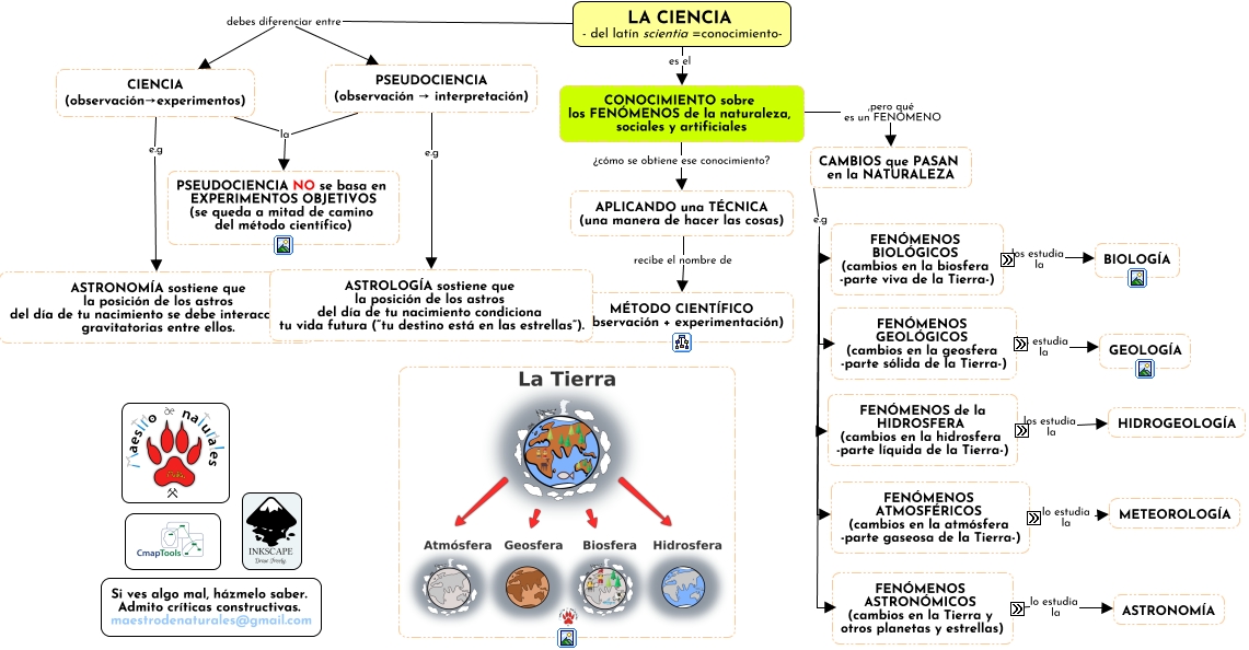Este Cmap, tiene información relacionada con: 00.01 Ciencia, CAMBIOS que PASAN en la NATURALEZA e.g FENÓMENOS ASTRONÓMICOS (cambios en la Tierra y otros planetas y estrellas), FENÓMENOS HIDROSFERA (cambios en la geosfera -parte sólida de la Tierra-) es el caso de la MAREAS - cambios periódico del nivel del mar producido principalmente por las fuerzas de atracción gravitatoria que ejercen el Sol y la Luna sobre la Tierra-, FENÓMENOS ASTRONÓMICOS (cambios en la Tierra y otros planetas y estrellas) lo estudia la ASTRONOMÍA, FENÓMENOS ASTRONÓMICOS (cambios en la Tierra y otros planetas y estrellas) e.g MOVIMIENTO de la TIERRA -cambios de sitio del planeta Tierra-, FENÓMENOS ASTRONÓMICOS (cambios en la Tierra y otros planetas y estrellas) e.g FASES de la LUNA - cambios de luminosidad debido a cambios en la posición de la Luna, CONOCIMIENTO sobre los FENÓMENOS de la naturaleza, sociales y artificiales ¿cómo se obtiene ese conocimiento? APLICANDO una TÉCNICA (una manera de hacer las cosas), CAMBIOS que PASAN en la NATURALEZA e.g FENÓMENOS ATMOSFÉRICOS (cambios en la atmósfera -parte gaseosa de la Tierra-), LA CIENCIA - del latín scientia =conocimiento- debes diferenciar entre CIENCIA (observación→experimentos), FENÓMENOS HIDROSFERA (cambios en la geosfera -parte sólida de la Tierra-) es el caso de la CORRIENTES OCEÁNICAS - movimiento de aguas en el océano-, FENÓMENOS BIOLÓGICOS (cambios en la biosfera -parte viva de la Tierra-) los estudia la BIOLOGÍA, FENÓMENOS ATMOSFÉRICOS (cambios en la atmósfera -parte gaseosa de la Tierra-) es el caso de la FECUNDACIÓN, FENÓMENOS ATMOSFÉRICOS (cambios en la atmósfera -parte gaseosa de la Tierra-) lo estudia la METEOROLOGÍA, CONOCIMIENTO sobre los FENÓMENOS de la naturaleza, sociales y artificiales ,pero qué es un FENÓMENO CAMBIOS que PASAN en la NATURALEZA, CIENCIA (observación→experimentos) la PSEUDOCIENCIA NO se basa en EXPERIMENTOS OBJETIVOS (se queda a mitad de camino del método científico), FENÓMENOS BIOLÓGICOS (cambios en la geosfera -parte sólida de la Tierra-) es el caso de la EVOLUCIÓN - cambios fenotípicos y genéticos que se producen en las poblaciones biológicas durante muchas generaciones-, CAMBIOS que PASAN en la NATURALEZA e.g FENÓMENOS BIOLÓGICOS (cambios en la biosfera -parte viva de la Tierra-), LA CIENCIA - del latín scientia =conocimiento- es el CONOCIMIENTO sobre los FENÓMENOS de la naturaleza, sociales y artificiales, LA CIENCIA - del latín scientia =conocimiento- debes diferenciar entre PSEUDOCIENCIA (observación → interpretación), FENÓMENOS GEOLÓGICOS (cambios en la geosfera -parte sólida de la Tierra-) algunos ejemplos son TERREMOTO - liberación brusca de energía acumulada en las rocas debido a movimiento de las placas tectónicas, PSEUDOCIENCIA (observación → interpretación) la PSEUDOCIENCIA NO se basa en EXPERIMENTOS OBJETIVOS (se queda a mitad de camino del método científico)