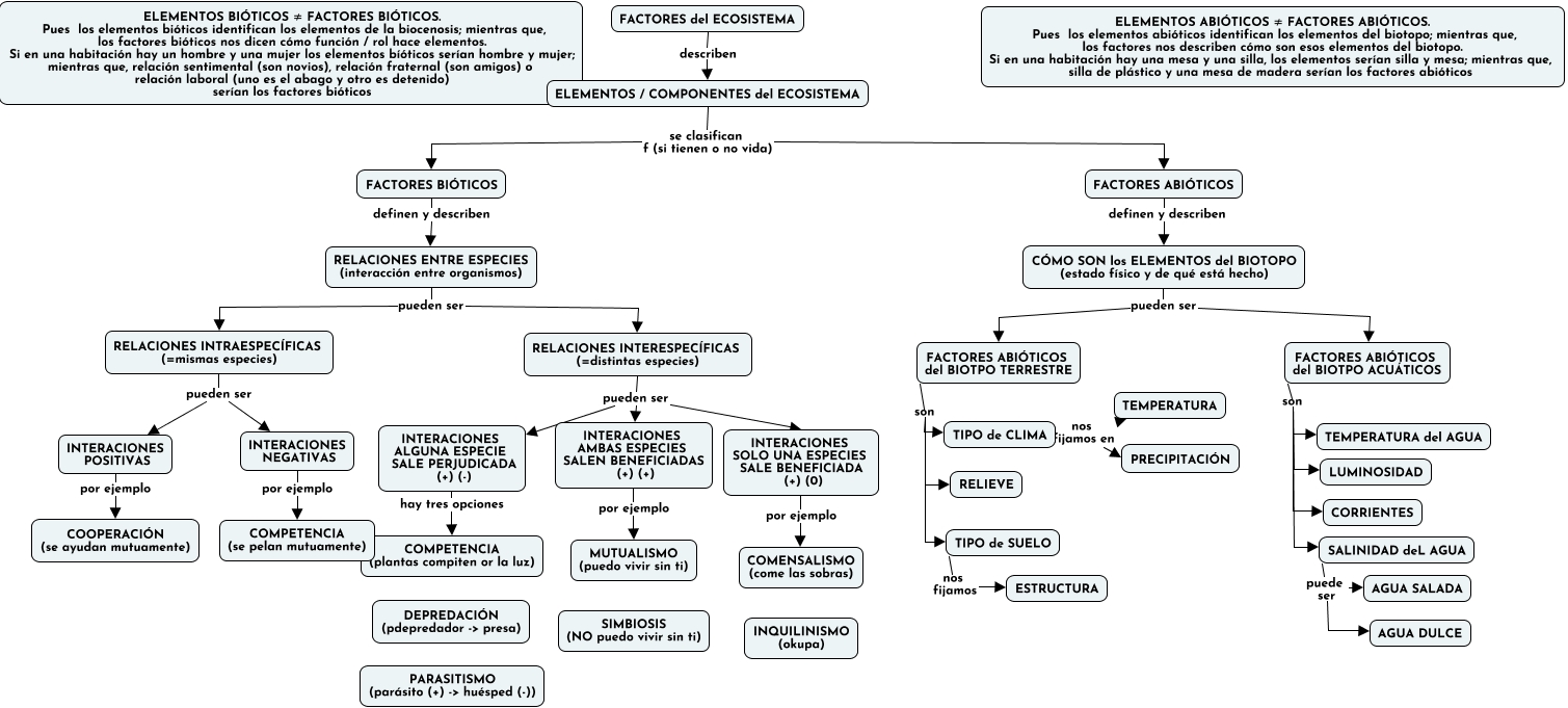 Este Cmap, tiene información relacionada con: Factores del ecosistema, FACTORES ABIÓTICOS del BIOTPO ACUÁTICOS son CORRIENTES, INTERACIONES POSITIVAS por ejemplo COOPERACIÓN (se ayudan mutuamente), RELACIONES INTRAESPECÍFICAS (=mismas especies) pueden ser INTERACIONES NEGATIVAS, RELACIONES INTRAESPECÍFICAS (=mismas especies) pueden ser INTERACIONES POSITIVAS, CÓMO SON los ELEMENTOS del BIOTOPO (estado físico y de qué está hecho) pueden ser FACTORES ABIÓTICOS del BIOTPO TERRESTRE, FACTORES ABIÓTICOS del BIOTPO TERRESTRE son RELIEVE, SALINIDAD deL AGUA puede ser AGUA DULCE, INTERACIONES AMBAS ESPECIES SALEN BENEFICIADAS (+) (+) por ejemplo MUTUALISMO (puedo vivir sin ti), ELEMENTOS / COMPONENTES del ECOSISTEMA se clasifican f (si tienen o no vida) FACTORES ABIÓTICOS, FACTORES ABIÓTICOS del BIOTPO TERRESTRE son TIPO de CLIMA, FACTORES ABIÓTICOS del BIOTPO ACUÁTICOS son SALINIDAD deL AGUA, INTERACIONES SOLO UNA ESPECIES SALE BENEFICIADA (+) (0) por ejemplo COMENSALISMO (come las sobras), ELEMENTOS / COMPONENTES del ECOSISTEMA se clasifican f (si tienen o no vida) FACTORES BIÓTICOS, FACTORES ABIÓTICOS del BIOTPO ACUÁTICOS son LUMINOSIDAD, RELACIONES ENTRE ESPECIES (interacción entre organismos) pueden ser RELACIONES INTRAESPECÍFICAS (=mismas especies), RELACIONES INTERESPECÍFICAS (=distintas especies) pueden ser INTERACIONES ALGUNA ESPECIE SALE PERJUDICADA (+) (-), CÓMO SON los ELEMENTOS del BIOTOPO (estado físico y de qué está hecho) pueden ser FACTORES ABIÓTICOS del BIOTPO ACUÁTICOS, TIPO de CLIMA nos fijamos en PRECIPITACIÓN, FACTORES del ECOSISTEMA describen ELEMENTOS / COMPONENTES del ECOSISTEMA, FACTORES ABIÓTICOS del BIOTPO TERRESTRE son TIPO de SUELO
