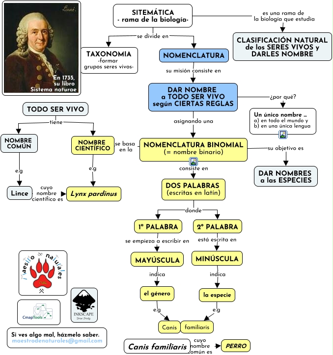 Este Cmap, tiene información relacionada con: Tema 04.05.02 Nomenclatura binomial de Linneo, NOMENCLATURA BINOMIAL (= nombre binario) consiste en DOS PALABRAS (escritas en latín), 2º PALABRA está escrita en MINÚSCULA, NOMBRE COMÚN e.g Lince, NOMBRE CIENTÍFICO e.g Lynx pardinus, NOMENCLATURA BINOMIAL (= nombre binario) su objetivo es DAR NOMBRES a las ESPECIES, DOS PALABRAS (escritas en latín) donde 2º PALABRA, SITEMÁTICA - rama de la biología- se divide en NOMENCLATURA, SITEMÁTICA - rama de la biología- se divide en TAXONOMIA -formar grupos seres vivos-, Canis familiaris cuyo nombre común es PERRO, NOMBRE CIENTÍFICO se basa en la NOMENCLATURA BINOMIAL (= nombre binario), la especie e.g familiaris, 1ª PALABRA se empieza a escribir en MAYÚSCULA, TODO SER VIVO tiene NOMBRE COMÚN, DOS PALABRAS (escritas en latín) donde 1ª PALABRA, MINÚSCULA indica la especie, DAR NOMBRE a TODO SER VIVO según CIERTAS REGLAS asignando una NOMENCLATURA BINOMIAL (= nombre binario), TODO SER VIVO tiene NOMBRE CIENTÍFICO, SITEMÁTICA - rama de la biología- es una rama de la biología que estudia CLASIFICACIÓN NATURAL de los SERES VIVOS y DARLES NOMBRE, MAYÚSCULA indica el género, NOMENCLATURA su misión consiste en DAR NOMBRE a TODO SER VIVO según CIERTAS REGLAS
