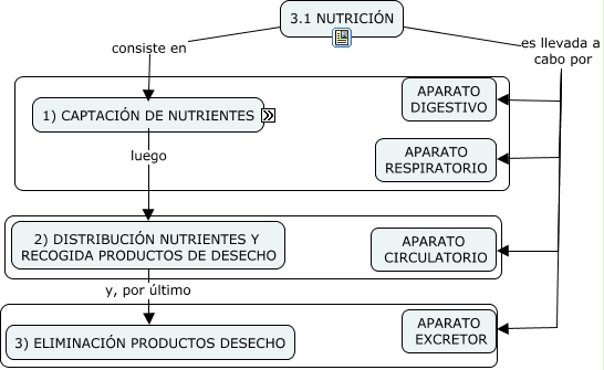 Este Cmap, tiene información relacionada con: 3.1 La nutrición humana, 1) CAPTACIÓN DE NUTRIENTES ¿cuáles? <math xmlns="http://www.w3.org/1998/Math/MathML"> <mrow> <mmultiscripts> <mtext> O </mtext> <mtext> 2 </mtext> <none/> </mmultiscripts> <mtext> (oxígeno) </mtext> </mrow> </math>, 3.1 NUTRICIÓN es llevada a cabo por APARATO DIGESTIVO, 3.1 NUTRICIÓN es llevada a cabo por APARATO EXCRETOR, 2) DISTRIBUCIÓN NUTRIENTES Y RECOGIDA PRODUCTOS DE DESECHO y, por último 3) ELIMINACIÓN PRODUCTOS DESECHO, 1) CAPTACIÓN DE NUTRIENTES luego 2) DISTRIBUCIÓN NUTRIENTES Y RECOGIDA PRODUCTOS DE DESECHO, 3.1 NUTRICIÓN es llevada a cabo por APARATO RESPIRATORIO, 3.1 NUTRICIÓN consiste en 1) CAPTACIÓN DE NUTRIENTES, 1) CAPTACIÓN DE NUTRIENTES ¿cuáles? biomoléculas, 3.1 NUTRICIÓN es llevada a cabo por APARATO CIRCULATORIO