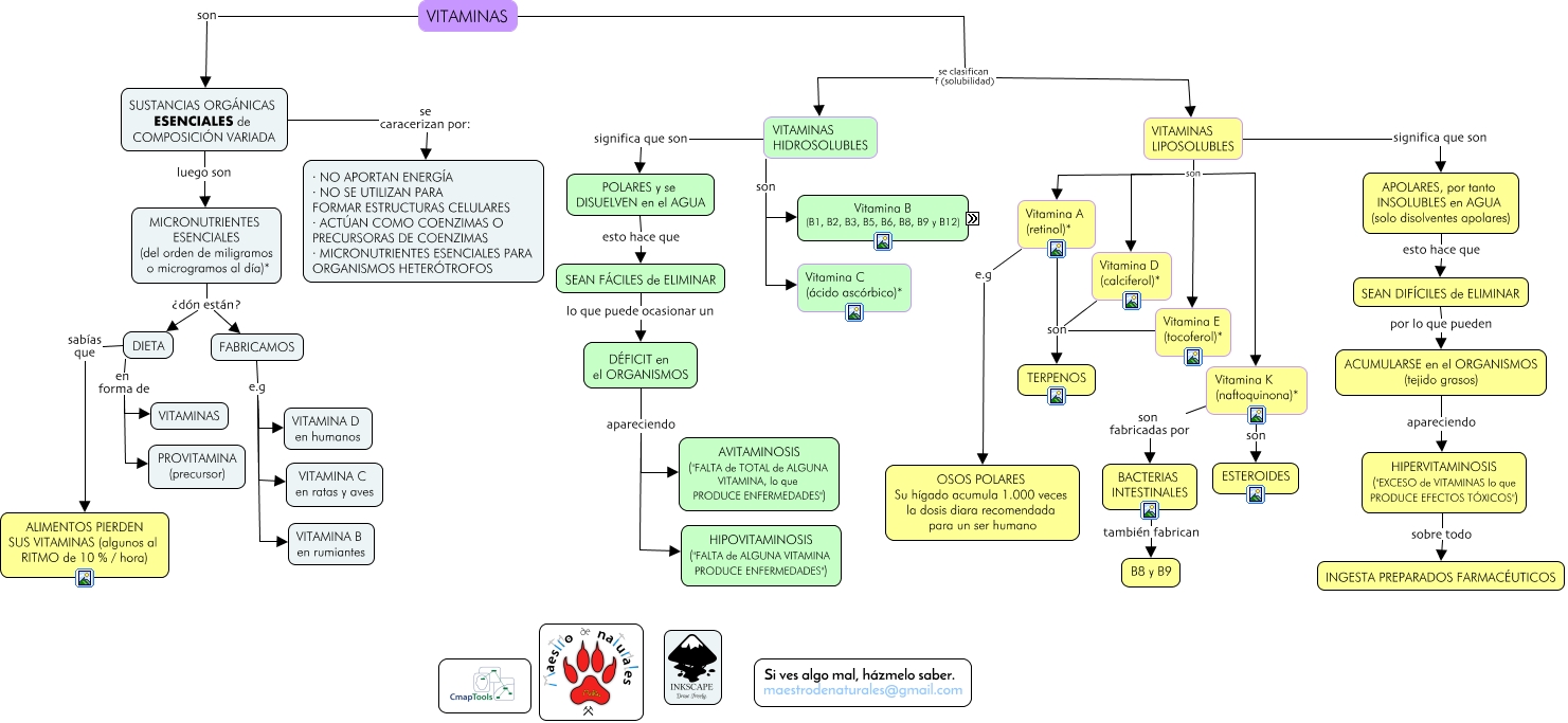 Este Cmap, tiene información relacionada con: Tema 03.09 Vitaminas, VITAMINAS son SUSTANCIAS ORGÁNICAS ESENCIALES de COMPOSICIÓN VARIADA, DIETA en forma de PROVITAMINA (precursor), SEAN FÁCILES de ELIMINAR lo que puede ocasionar un DÉFICIT en el ORGANISMOS, HIPERVITAMINOSIS ("EXCESO de VITAMINAS lo que PRODUCE EFECTOS TÓXICOS") sobre todo INGESTA PREPARADOS FARMACÉUTICOS, VITAMINAS se clasifican f (solubilidad) VITAMINAS HIDROSOLUBLES, SUSTANCIAS ORGÁNICAS ESENCIALES de COMPOSICIÓN VARIADA se caracerizan por: · NO APORTAN ENERGÍA · NO SE UTILIZAN PARA FORMAR ESTRUCTURAS CELULARES · ACTÚAN COMO COENZIMAS O PRECURSORAS DE COENZIMAS · MICRONUTRIENTES ESENCIALES PARA ORGANISMOS HETERÓTROFOS, ACUMULARSE en el ORGANISMOS (tejido grasos) apareciendo HIPERVITAMINOSIS ("EXCESO de VITAMINAS lo que PRODUCE EFECTOS TÓXICOS"), VITAMINAS LIPOSOLUBLES son Vitamina A (retinol)*, Vitamina A (retinol)* e.g OSOS POLARES Su hígado acumula 1.000 veces la dosis diara recomendada para un ser humano, Vitamina B (B1, B2, B3, B5, B6, B8, B9 y B12) son Vitamina B3 (niacina)*, Vitamina D (calciferol)* son TERPENOS, APOLARES, por tanto INSOLUBLES en AGUA (solo disolventes apolares) esto hace que SEAN DIFÍCILES de ELIMINAR, POLARES y se DISUELVEN en el AGUA esto hace que SEAN FÁCILES de ELIMINAR, MICRONUTRIENTES ESENCIALES (del orden de miligramos o microgramos al día)* ¿dón están? DIETA, Vitamina B (B1, B2, B3, B5, B6, B8, B9 y B12) son Vitamina B2 (riboflavina)*, FABRICAMOS e.g VITAMINA B en rumiantes, DÉFICIT en el ORGANISMOS apareciendo HIPOVITAMINOSIS ("FALTA de ALGUNA VITAMINA PRODUCE ENFERMEDADES"), SUSTANCIAS ORGÁNICAS ESENCIALES de COMPOSICIÓN VARIADA luego son MICRONUTRIENTES ESENCIALES (del orden de miligramos o microgramos al día)*, Vitamina B (B1, B2, B3, B5, B6, B8, B9 y B12) son Vitamina B9 (ácido fólico)*, VITAMINAS LIPOSOLUBLES son Vitamina D (calciferol)*