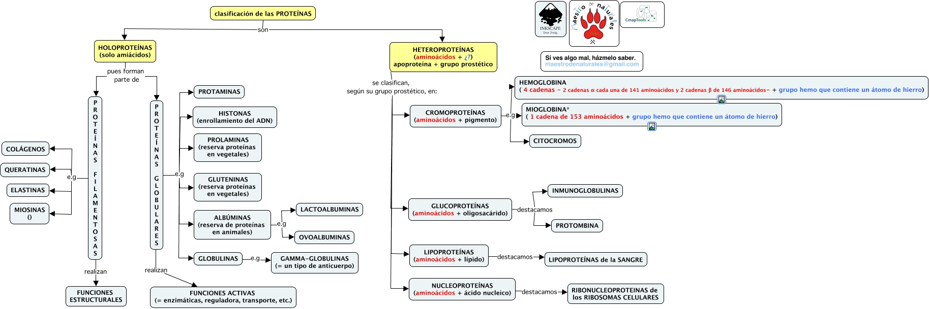 Este Cmap, tiene información relacionada con: Tema 03.07 Clasificación de las proteínas, HETEROPROTEÍNAS (aminoácidos + ¿?) apoproteína + grupo prostético se clasifican, según su grupo prostético, en: CROMOPROTEÍNAS (aminoácidos + pigmento), HETEROPROTEÍNAS (aminoácidos + ¿?) apoproteína + grupo prostético se clasifican, según su grupo prostético, en: GLUCOPROTEÍNAS (aminoácidos + oligosacárido), P R O T E Í N A S G L O B U L A R E S e.g PROTAMINAS, HOLOPROTEÍNAS (solo amiácidos) pues forman parte de P R O T E Í N A S F I L A M E N T O S A S, P R O T E Í N A S F I L A M E N T O S A S e.g QUERATINAS, HOLOPROTEÍNAS (solo amiácidos) pues forman parte de P R O T E Í N A S G L O B U L A R E S, P R O T E Í N A S G L O B U L A R E S e.g GLOBULINAS, ALBÚMINAS (reserva de proteínas en animales) e.g LACTOALBUMINAS, GLOBULINAS e.g GAMMA-GLOBULINAS (= un tipo de anticuerpo), GLUCOPROTEÍNAS (aminoácidos + oligosacárido) destacamos PROTOMBINA, HETEROPROTEÍNAS (aminoácidos + ¿?) apoproteína + grupo prostético se clasifican, según su grupo prostético, en: LIPOPROTEÍNAS (aminoácidos + lípido), CROMOPROTEÍNAS (aminoácidos + pigmento) e.g HEMOGLOBINA ( 4 cadenas - 2 cadenas α cada una de 141 aminoácidos y 2 cadenas β de 146 aminoácidos- + grupo hemo que contiene un átomo de hierro), NUCLEOPROTEÍNAS (aminoácidos + ácido nucleico) destacamos RIBONUCLEOPROTEINAS de los RIBOSOMAS CELULARES, P R O T E Í N A S G L O B U L A R E S e.g ALBÚMINAS (reserva de proteínas en animales), P R O T E Í N A S G L O B U L A R E S e.g HISTONAS (enrollamiento del ADN), ALBÚMINAS (reserva de proteínas en animales) e.g OVOALBUMINAS, P R O T E Í N A S F I L A M E N T O S A S e.g ELASTINAS, clasificación de las PROTEÍNAS son HETEROPROTEÍNAS (aminoácidos + ¿?) apoproteína + grupo prostético, HETEROPROTEÍNAS (aminoácidos + ¿?) apoproteína + grupo prostético se clasifican, según su grupo prostético, en: NUCLEOPROTEÍNAS (aminoácidos + ácido nucleico), CROMOPROTEÍNAS (aminoácidos + pigmento) e.g MIOGLOBINA* ( 1 cadena de 153 aminoácidos + grupo hemo que contiene un átomo de hierro)