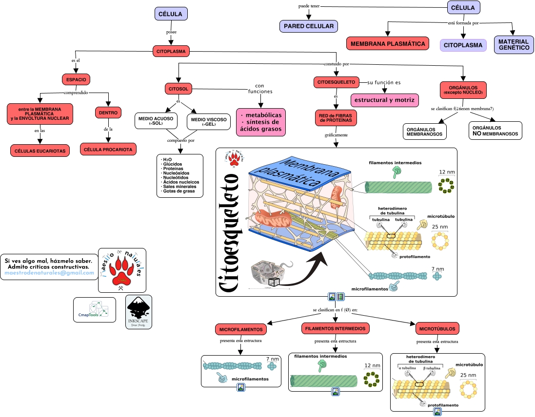 Este Cmap, tiene información relacionada con: Tema 01.06.03 Citoplasma, CÉLULA está formada por MATERIAL GENÉTICO, MEDIO ACUOSO (=SOL) compuesto por · H2O · Glúcidos · Proteínas · Nucleósidos · Nucleótidos · Ácidos nucleicos · Sales minerales · Gotas de grasa, CITOESQUELETO su función es estructural y motriz, se clasifican en f (Ø) en: FILAMENTOS INTERMEDIOS, CITOPLASMA constuido por CITOSOL, CITOPLASMA es el ESPACIO, FILAMENTOS INTERMEDIOS presenta esta estructura, CITOPLASMA constuido por ORGÁNULOS (excepto NÚCLEO), CÉLULA está formada por CITOPLASMA, ORGÁNULOS (excepto NÚCLEO) se clasifican f(¿tienen membrana?) ORGÁNULOS NO MEMBRANOSOS, ESPACIO comprendido DENTRO, MICROFILAMENTOS presenta esta estructura, CÉLULA está formada por MEMBRANA PLASMÁTICA, CITOSOL es MEDIO ACUOSO (=SOL), CITOESQUELETO es RED de FIBRAS de PROTEÍNAS, RED de FIBRAS de PROTEÍNAS gráficamente, CITOSOL es MEDIO VISCOSO (=GEL), entre la MEMBRANA PLASMÁTICA y la ENVOLTURA NUCLEAR en las CÉLULAS EUCARIOTAS, se clasifican en f (Ø) en: MICROTÚBULOS, CITOPLASMA constuido por CITOESQUELETO