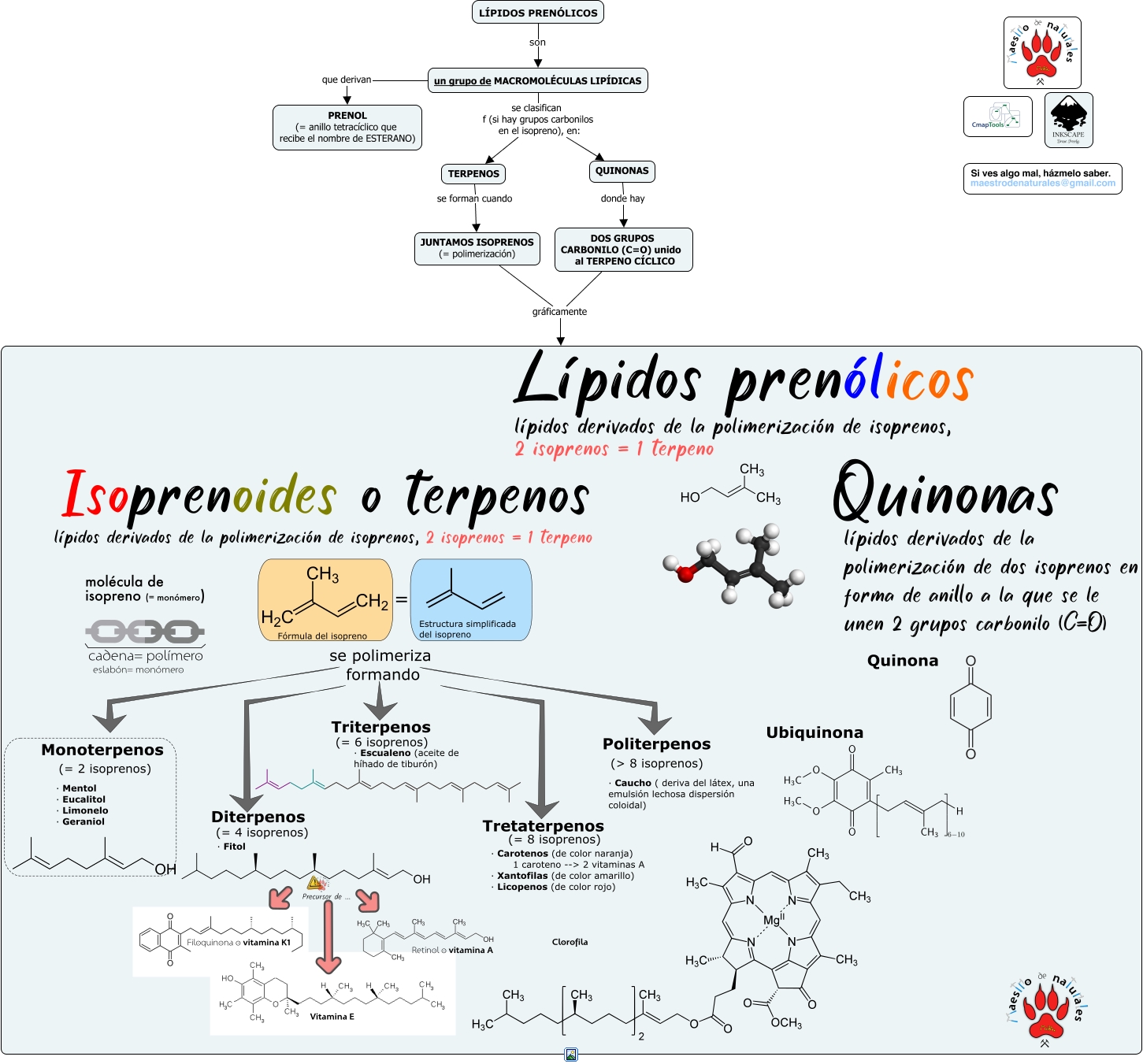 Este Cmap, tiene información relacionada con: 2.13 Lípidos prenólicos, un grupo de MACROMOLÉCULAS LIPÍDICAS que derivan PRENOL (= anillo tetracíclico que recibe el nombre de ESTERANO), LÍPIDOS PRENÓLICOS son un grupo de MACROMOLÉCULAS LIPÍDICAS, JUNTAMOS ISOPRENOS (= polimerización) gráficamente, QUINONAS donde hay DOS GRUPOS CARBONILO (C=O) unido al TERPENO CÍCLICO, un grupo de MACROMOLÉCULAS LIPÍDICAS se clasifican f (si hay grupos carbonilos en el isopreno), en: QUINONAS, un grupo de MACROMOLÉCULAS LIPÍDICAS se clasifican f (si hay grupos carbonilos en el isopreno), en: TERPENOS, TERPENOS se forman cuando JUNTAMOS ISOPRENOS (= polimerización), DOS GRUPOS CARBONILO (C=O) unido al TERPENO CÍCLICO gráficamente